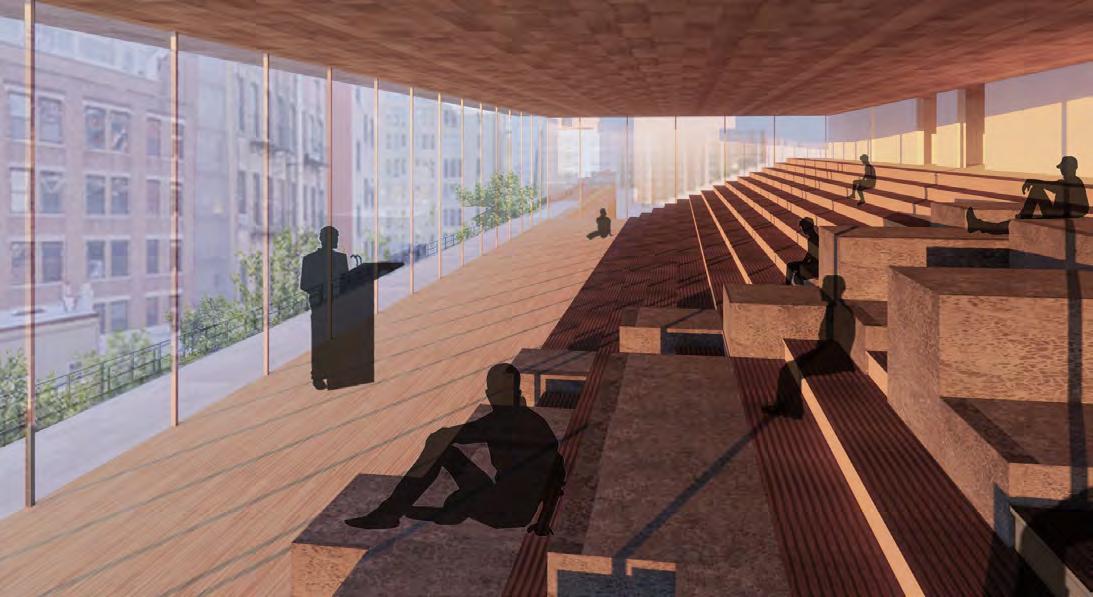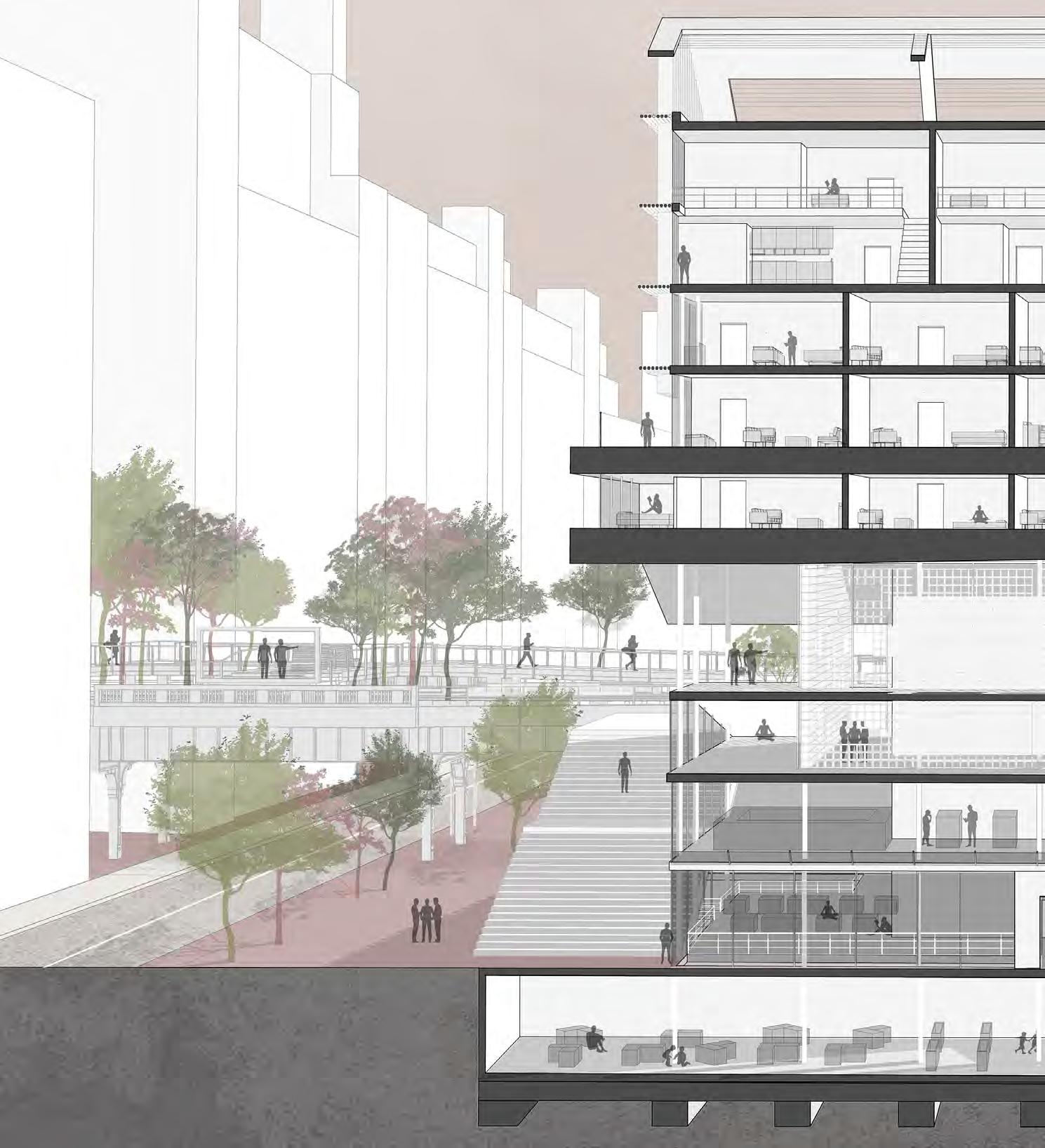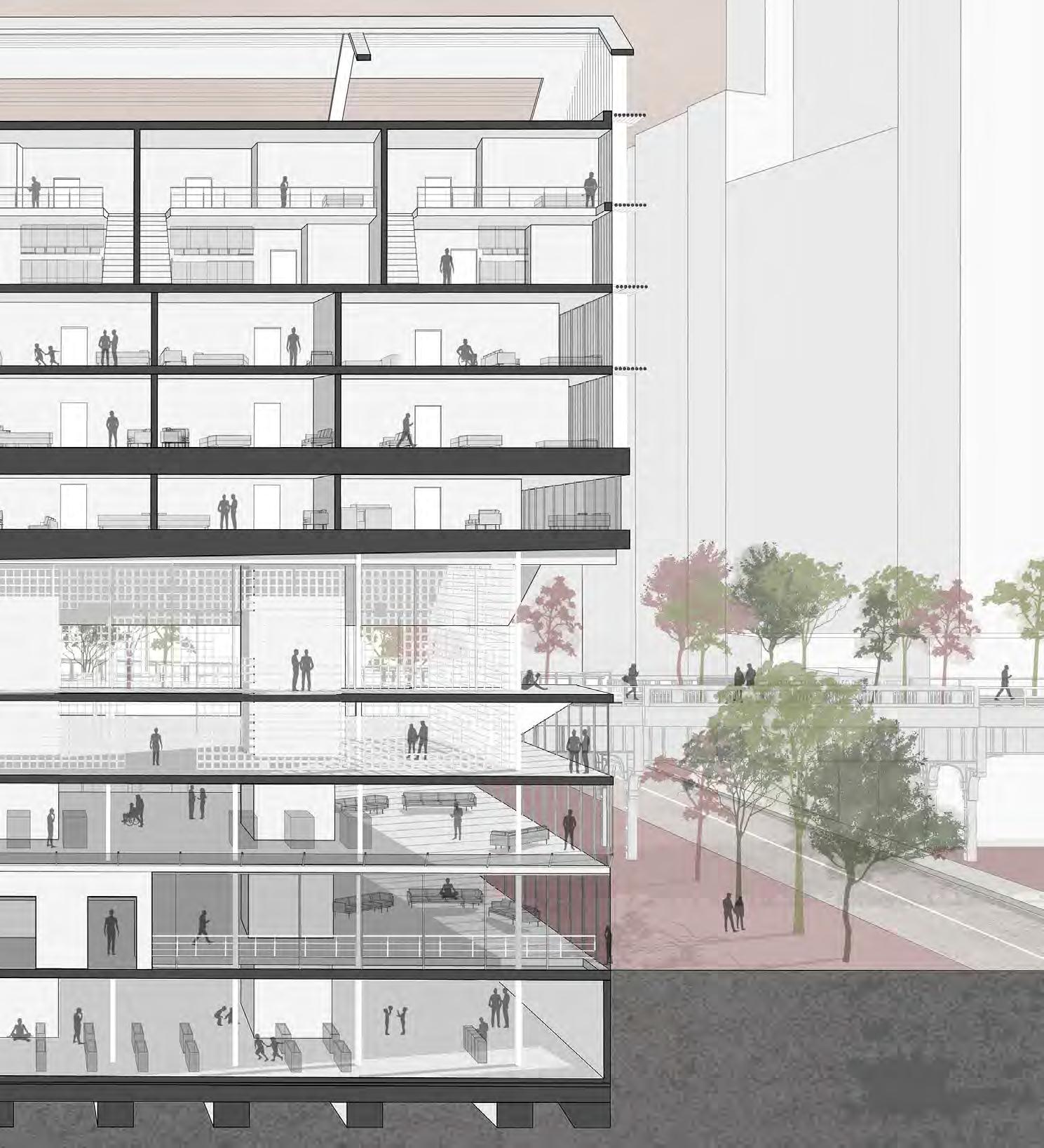 When designing the library and residential space, we wanted to connect the library to the public as best as possible. A problem we found with the High Line was the need for more access points . Surrounding luxury apartments cut off the High Line from the general public. To help fix this, we made our library a key access point. This way, community members from the surrounding neighborhoods can have easier access to the High Line and access the library as they navigate the High Line from the street.