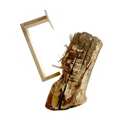 The refined wood uses tensegrity to separate itself from the weathered log and is symbolic of extractivisms effects on often unseen environments. It shows the sacrifice and abuse of one location for the benefit of others.
