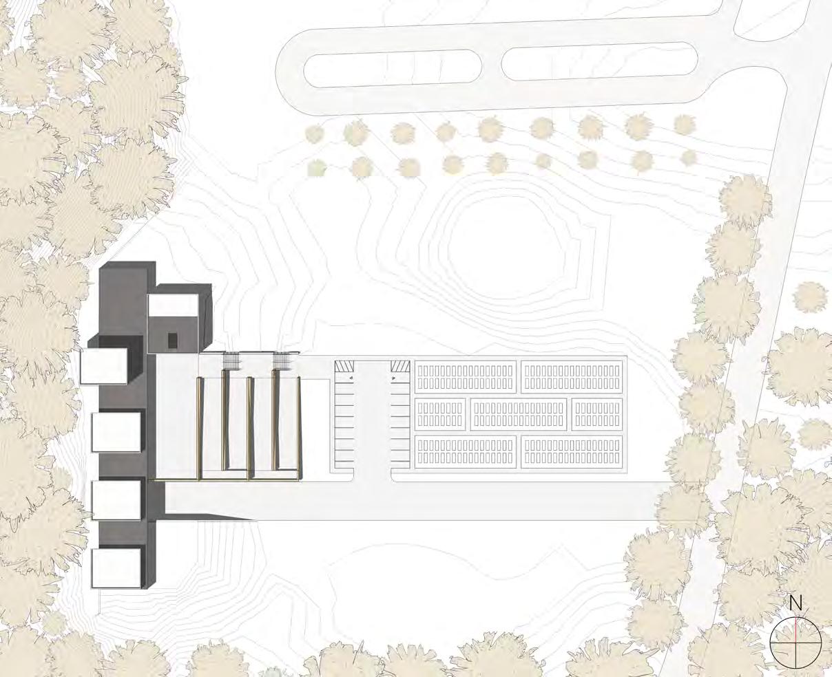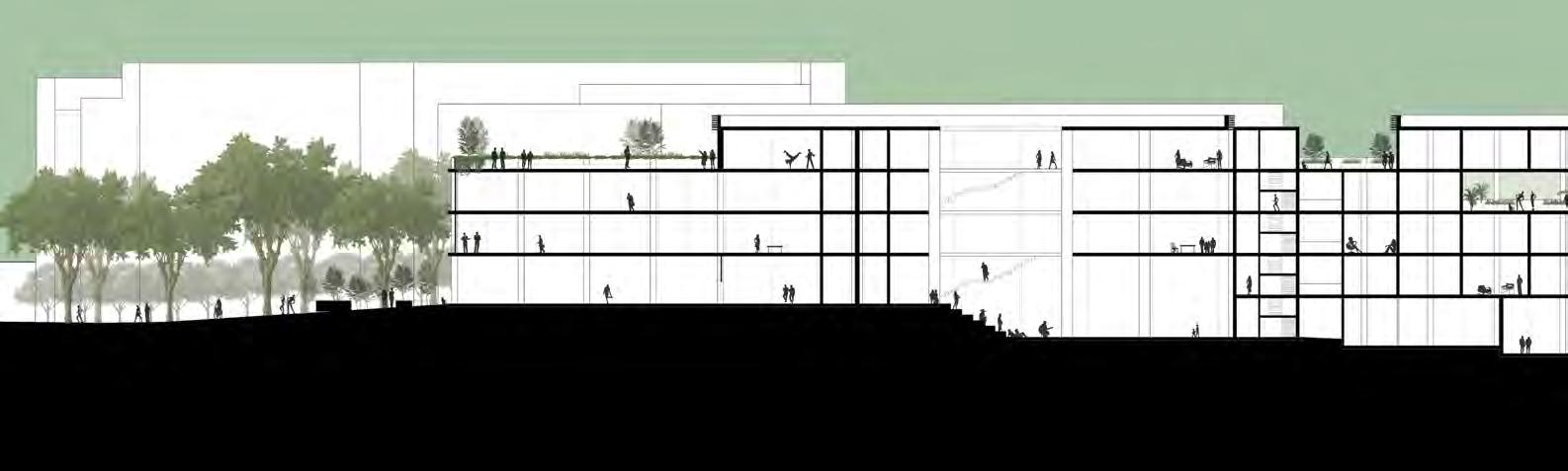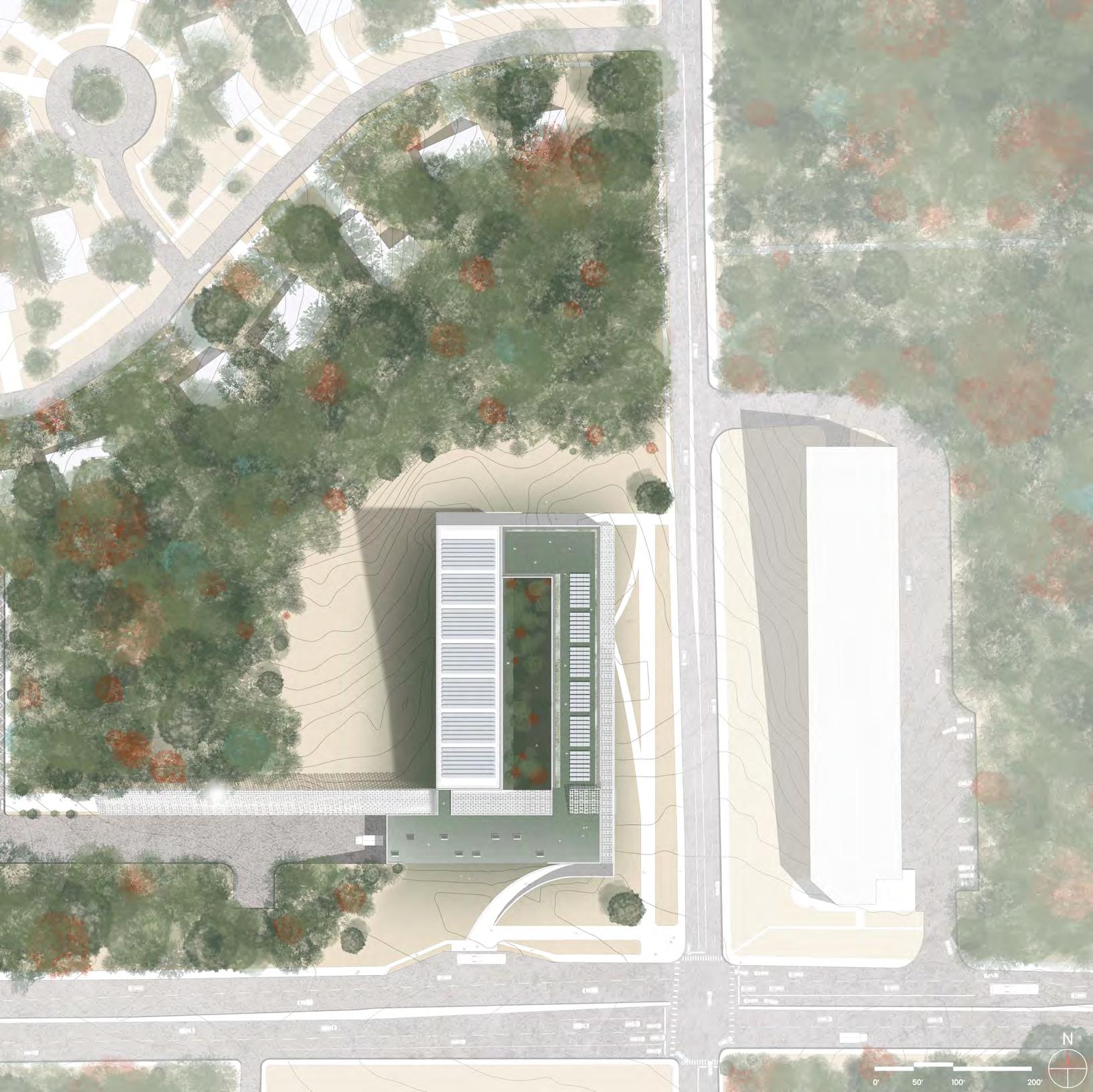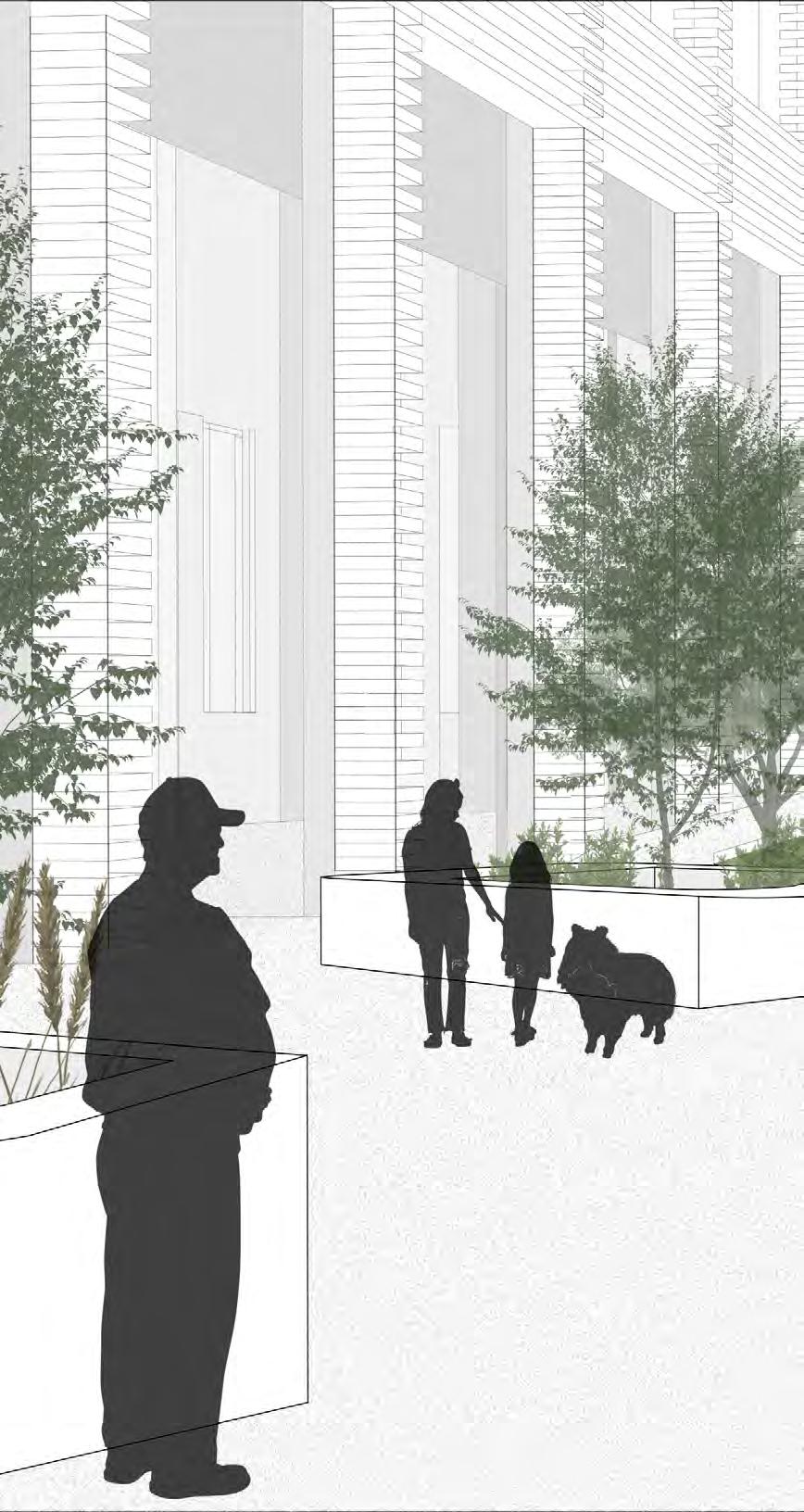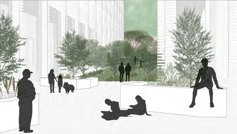 As one climbs or descends the site’s topography, they will find cuts through our ground floor leading inside to the intimate, semi-private park. This green spine is a promenade to or away from the wall and features a gentle expansion or compression. Our South building is a bar that extends halfway along our site before the gesture is picked up by a grove of stone pines that fill this need. The large permeable trees delineate our site from its context while connecting them visually.