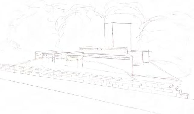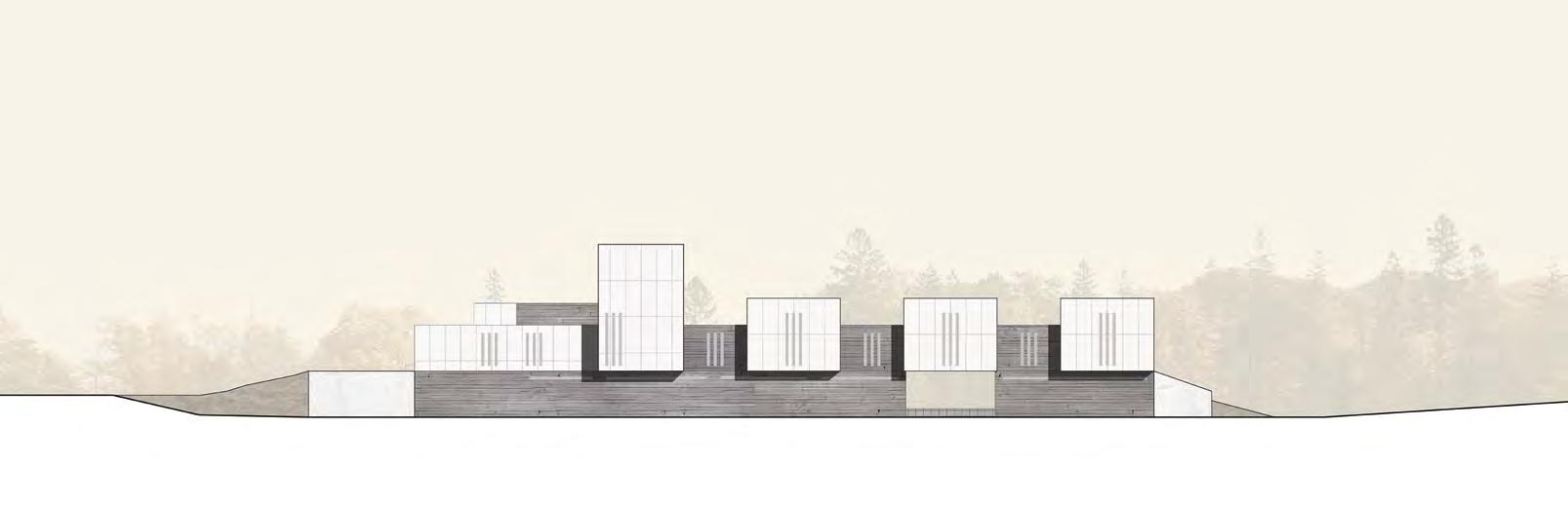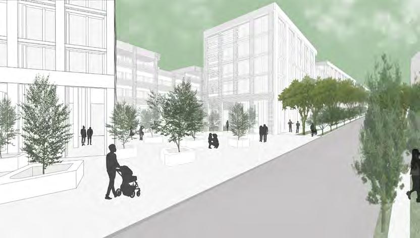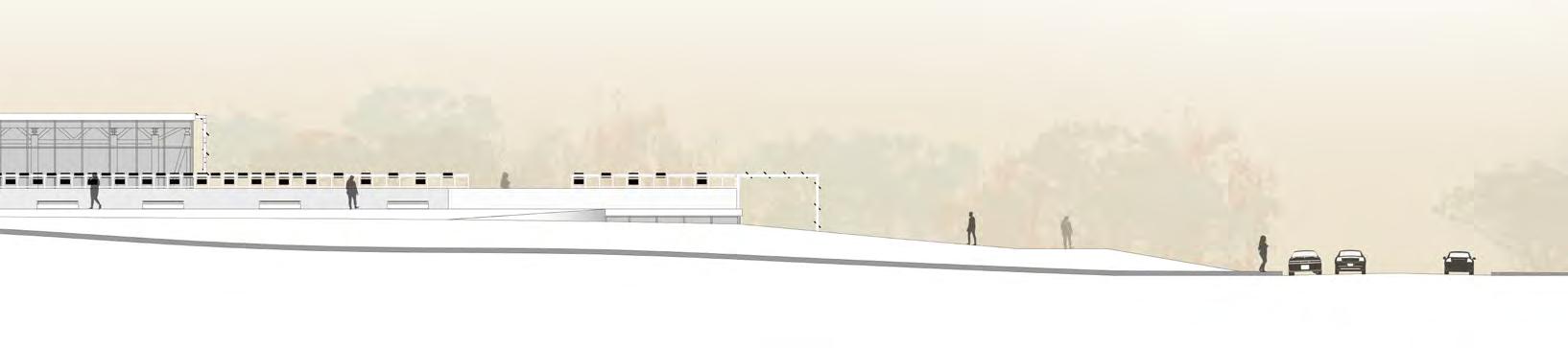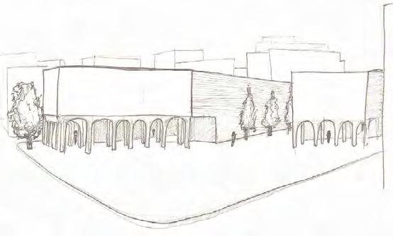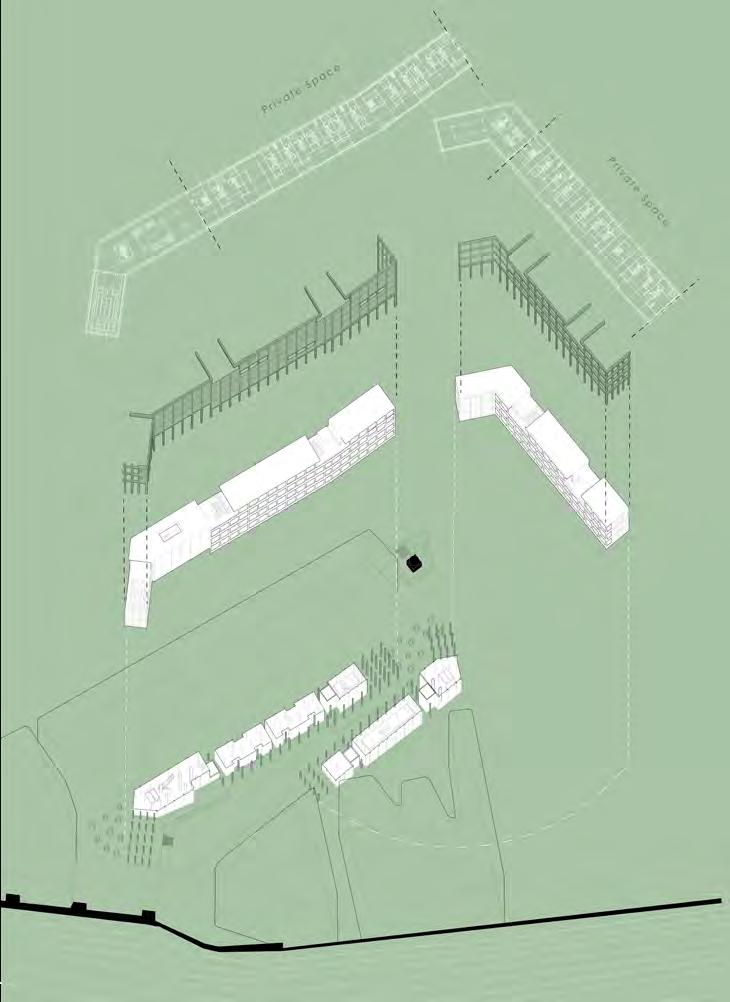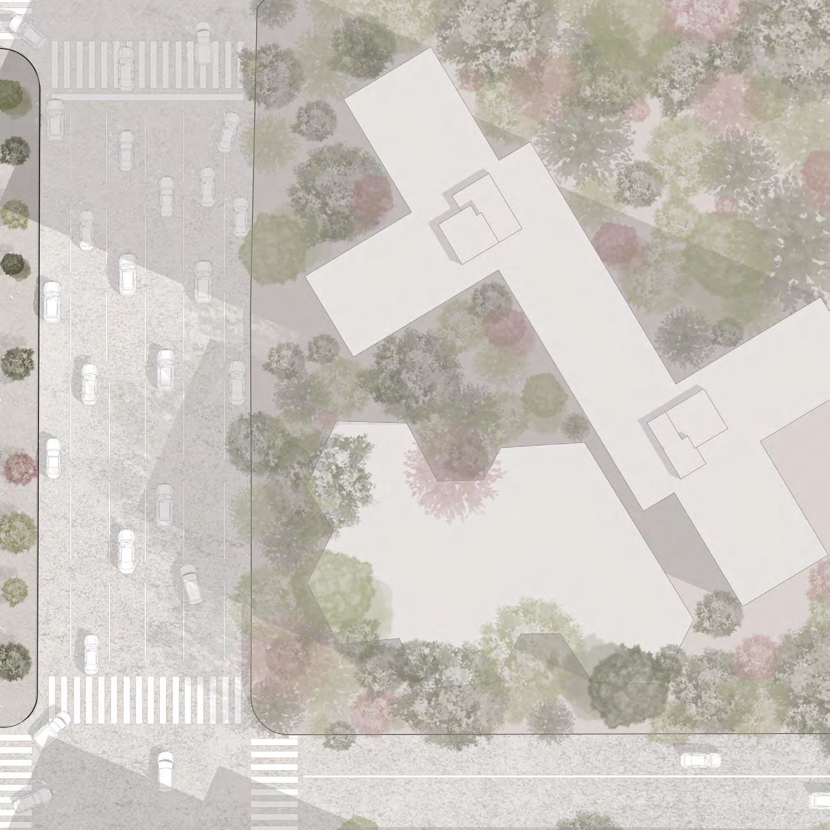 As one climbs or descends the site’s topography, they will find cuts through our ground floor leading inside to the intimate, semi-private park. This green spine is a promenade to or away from the wall and features a gentle expansion or compression. Our South building is a bar that extends halfway along our site before the gesture is picked up by a grove of stone pines that fill this need. The large permeable trees delineate our site from its context while connecting them visually.