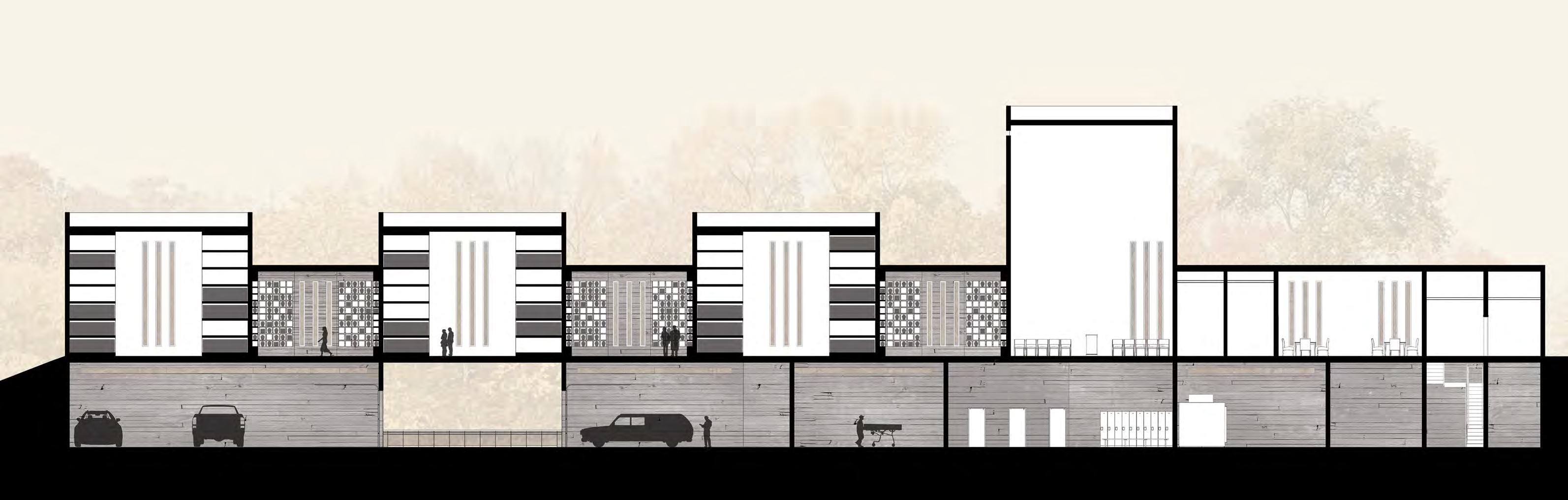 Long Section - The processing floor circulates the newly arrived loved ones from left to right, beginning with the receiving garage and ending with the cold storage and furnace hall on the right. The visitor floor above circulates from right to left, starting with the reception, with the chapel in the center, and ending with the crypts and columbariums on the left.
