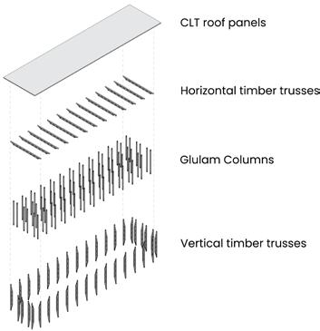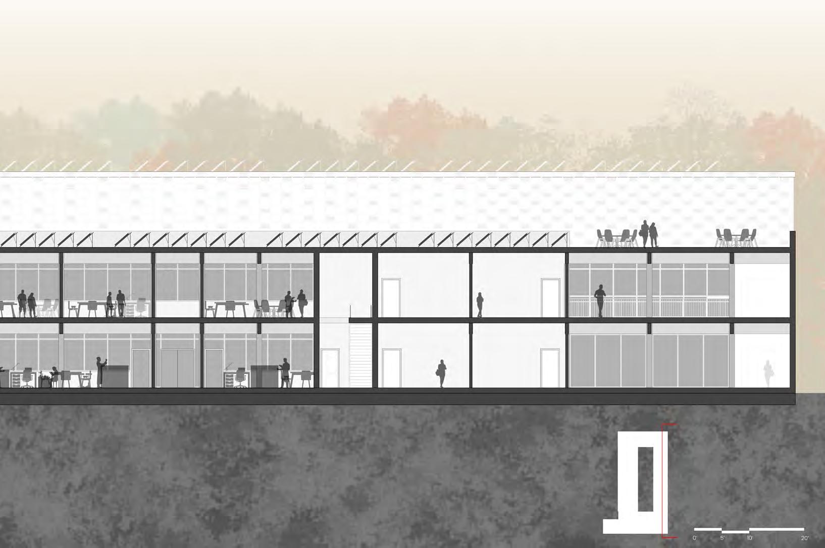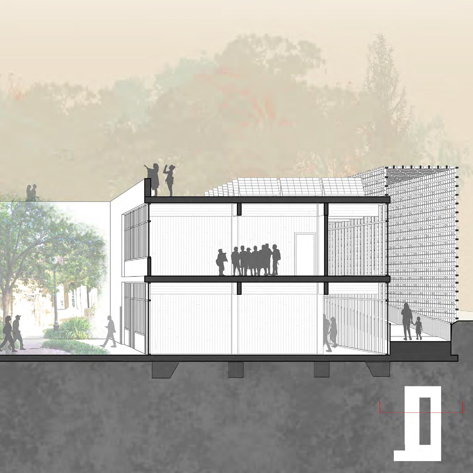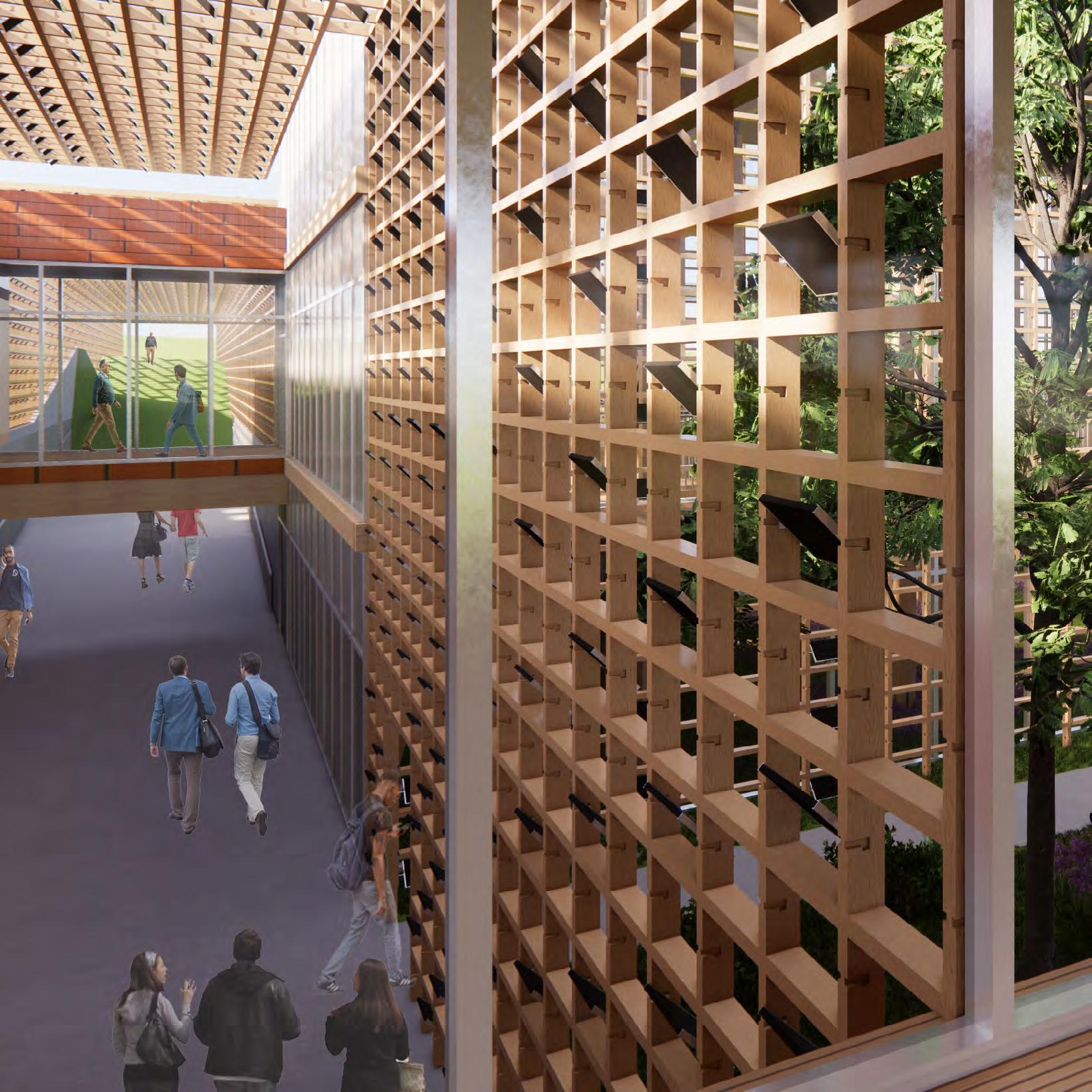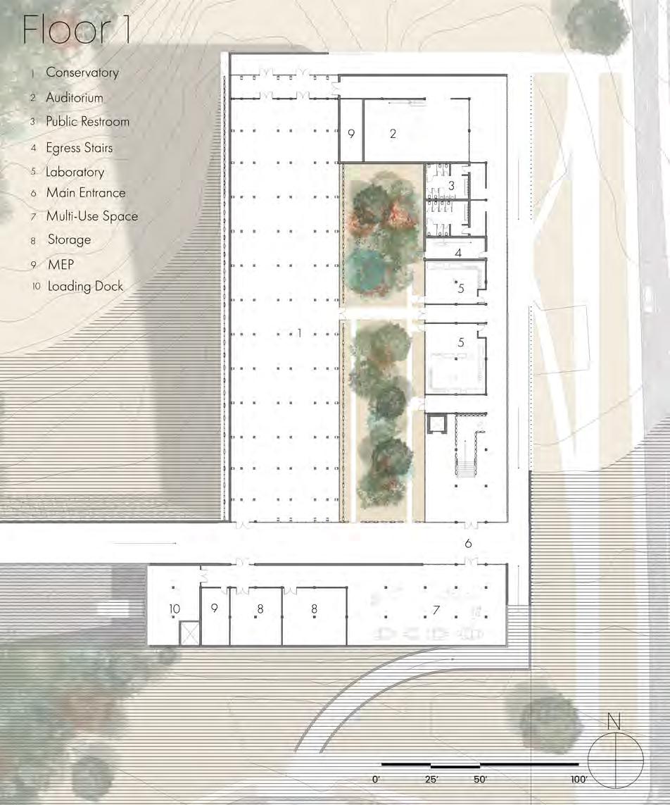 To help remedy the pollutants around the site, we use carbon biochar panels to capture and sequester the carbon dioxide and act as a shading device for our building. The sequestered carbon is then refined into fertilizer and applied within the conservatory to support native plants’ growth. Additionally, solar panels are installed on portions of the roof.
