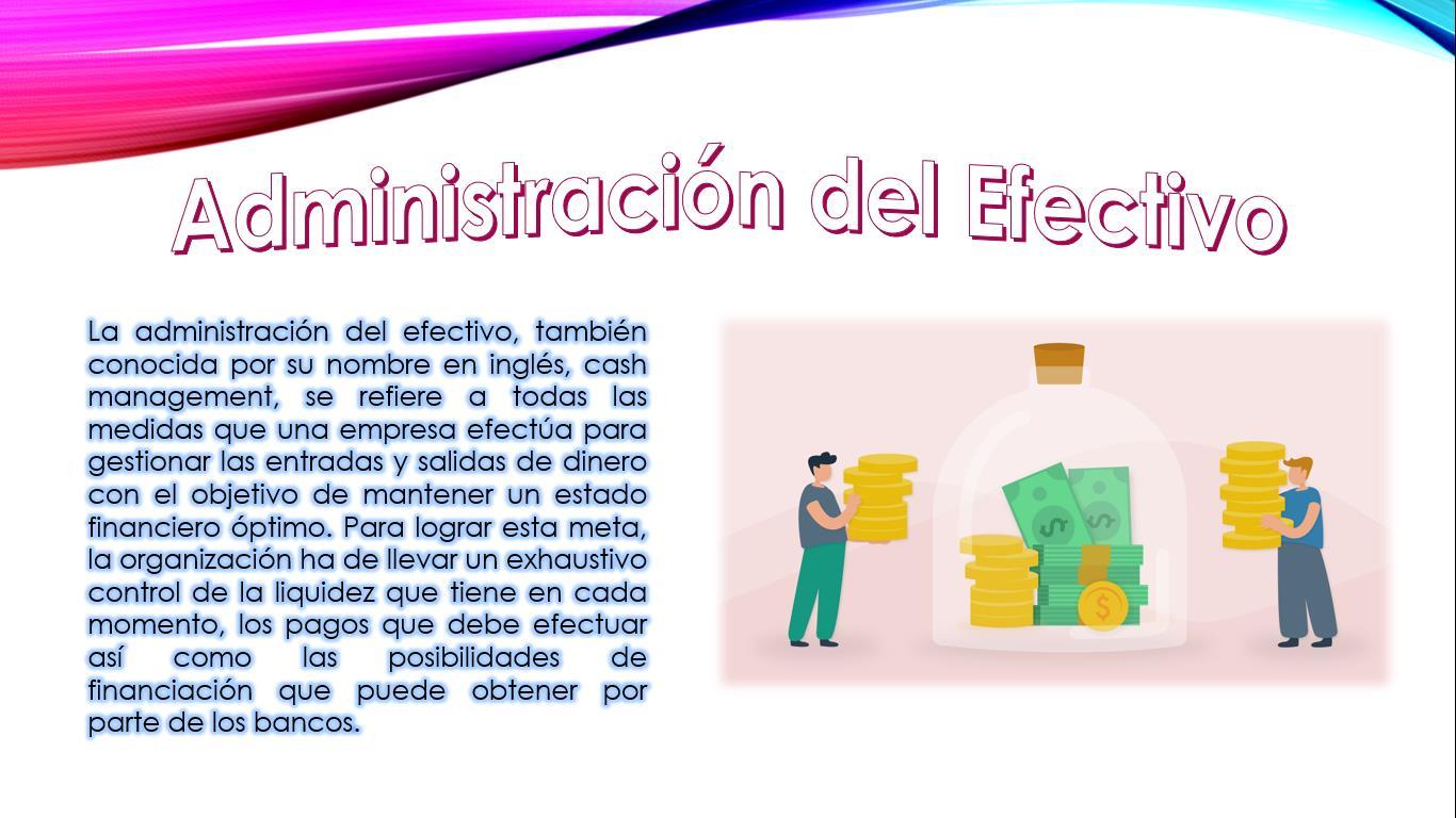 La administración del efectivo, también conocida por su nombre en inglés, cash management, se refiere a todas las medidas que una empresa efectúa para gestionar las entradas y salidas de dinero con el objetivo de mantener un estado financiero óptimo. Para lograr esta meta, la organización ha de llevar un exhaustivo control de la liquidez que tiene en cada momento, los pagos que debe efectuar así como las posibilidades de financiación que puede obtener por parte de los bancos.