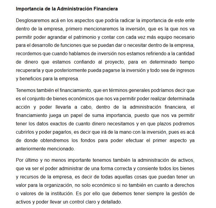 La administración financiera abarca mucho en una empresa, de igual forma en el sector educativo, como organizar, planificar, dirigir y controlar sus recursos económicos. Decide sobre inversiones, financiación y distribución de beneficios, desempeñando un papel crucial en la estabilidad y supervivencia de la empresa.