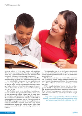 in teacher salaries by 2.75%, many teachers will supplement their incomes in a variety of ways. Although exam marking has always been a popular choice, many education professionals are increasingly looking towards tutoring as an alternative. One recent tutor to come through the doors at Gabbitas explained why he decided to tutor alongside his teaching career. ‘…it is the flexibility that attracts me most of all. Compared to exam marking where I would have to be holed up throughout the marking period, tutoring allows me greater flexibility. 2 years ago I had an online tutee whom I tutored throughout the summer and was able to continue to deliver lessons even when I went away for a week to Crete.’ This flexibility is one of the main factors that influences teachers to tutor in their spare time. Nevertheless, many tutors are not necessarily practicing teachers, and for these tutors the motivation may be different. Recent graduates who enter the working world will often want to keep in touch with their academic studies and, for many, tutoring will enable them to do this by delivering support to students who may be looking to follow in their academic footsteps. Tutors gain a huge amount of satisfaction in helping their students succeed and a recent graduate commented recently whilst attending an interview at Gabbitas: