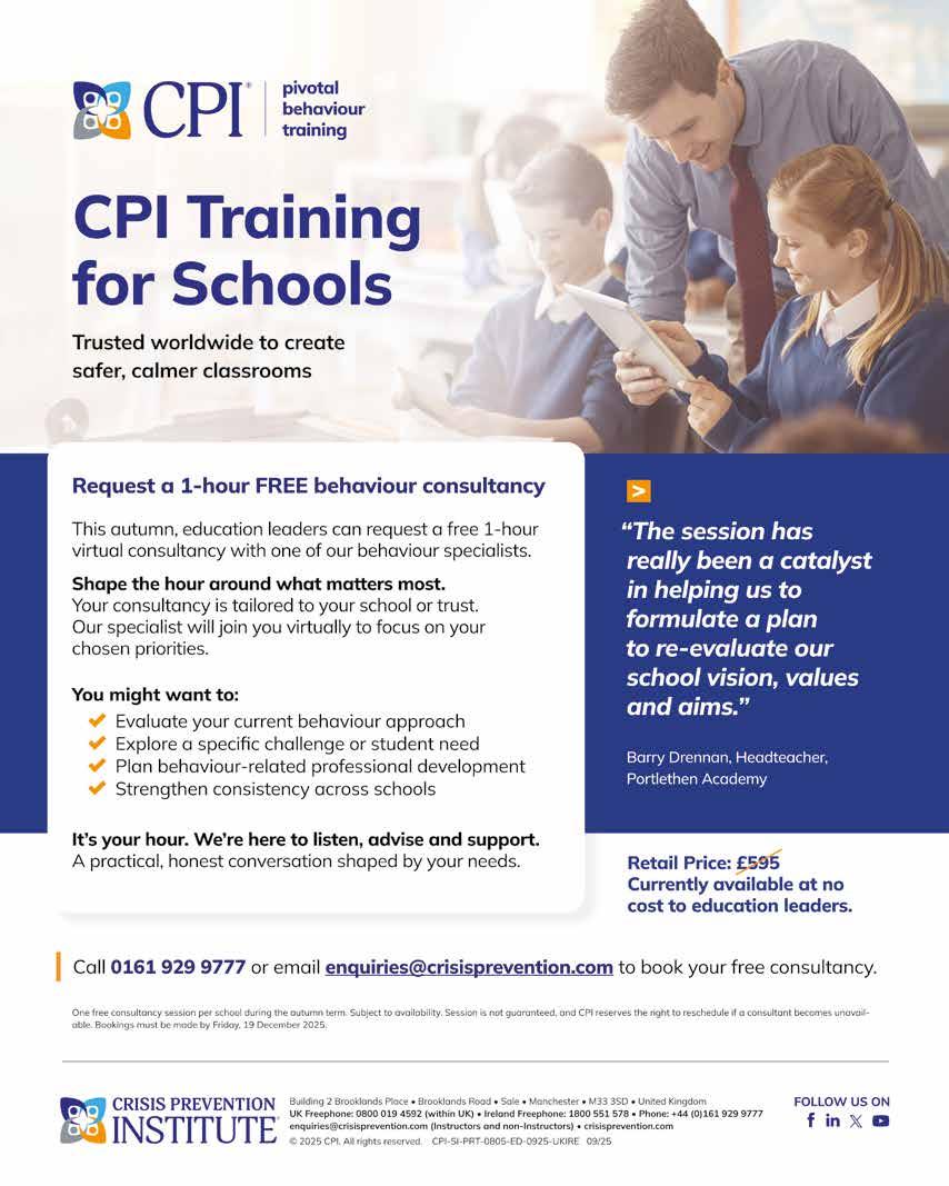 HUW LLOYD is Behaviour Expert, CPI. Partnering with CPI supports educators through evidence-based strategies to prevent conflict, de-escalate situations and build respectful learning environments. W: crisisprevention.com/en-GB/ cpi-360-education