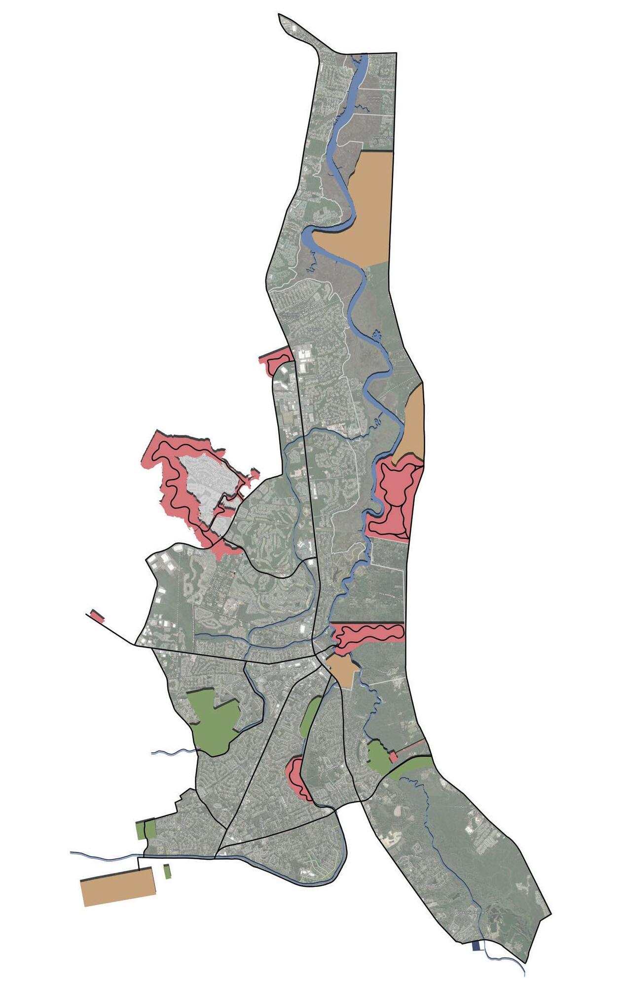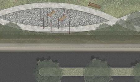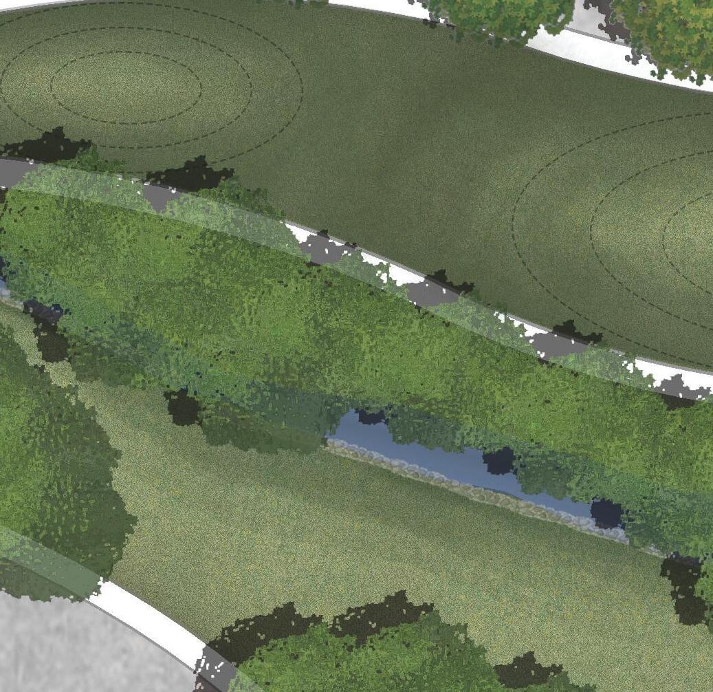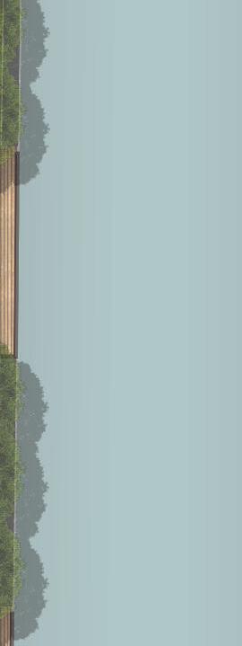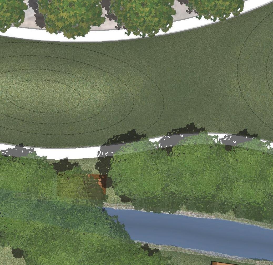 West Wedge Park transforms a compact, undeveloped site with mature oak trees and Bush Creek into an accessible, diverse space. The design provides entry points from the surrounding area and greenway, accommodates various demographics, and restores the oak savannah ecosystem. To the south, the Monkey Mounds offer elevated grassy hills for play and relaxation. The parkʼs revitalized oak savannah provides a serene experience with dense forest and wildflower plantings. Pedestrian bridges cross the creek, and waterfront decks offer immersive views of the riparian ecosystem.