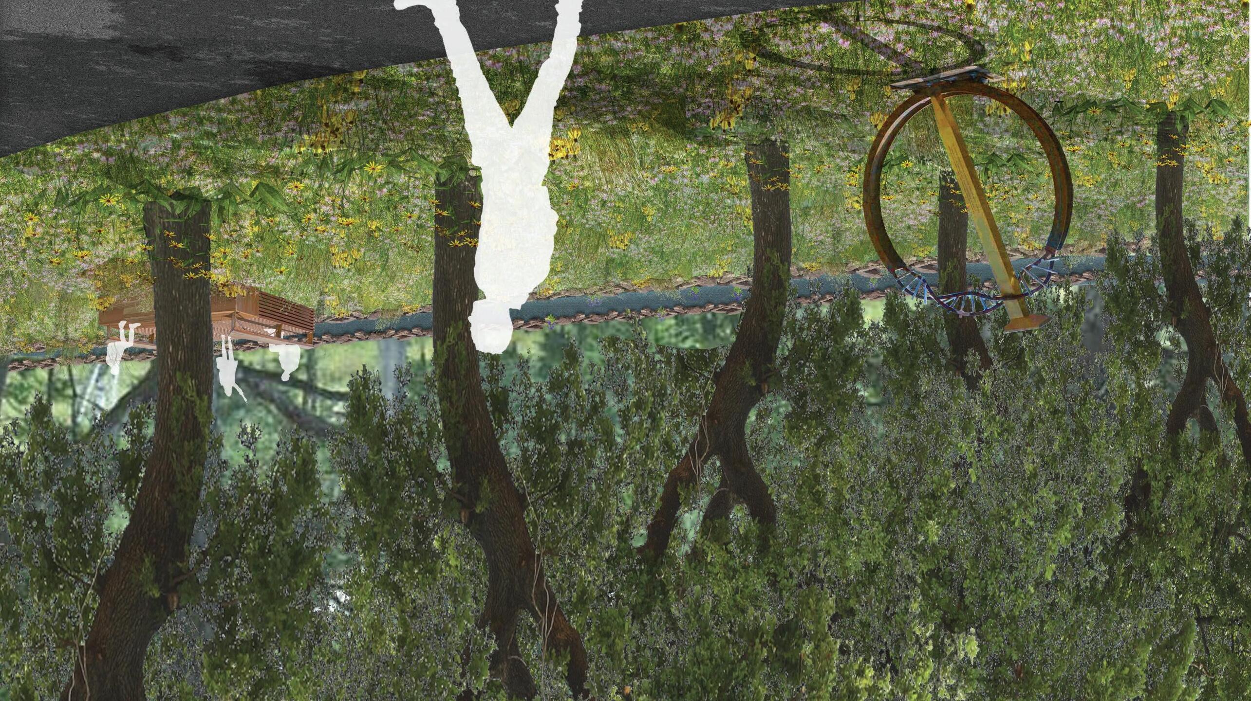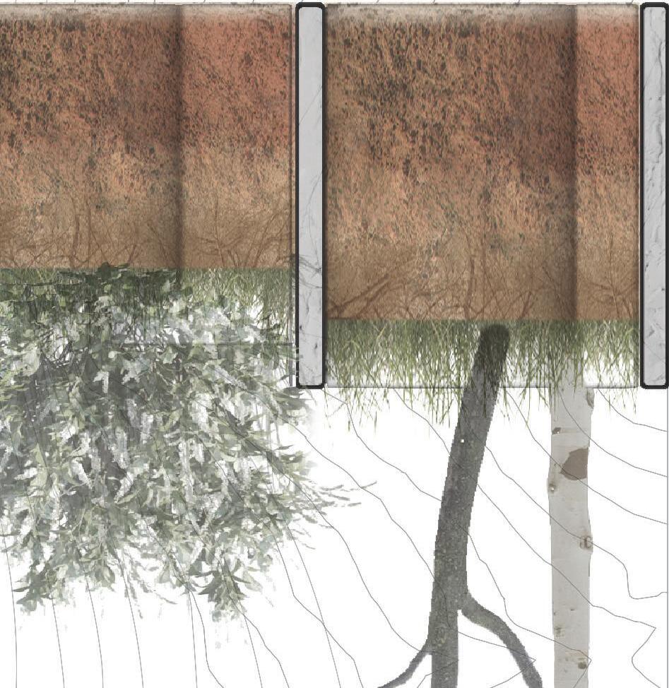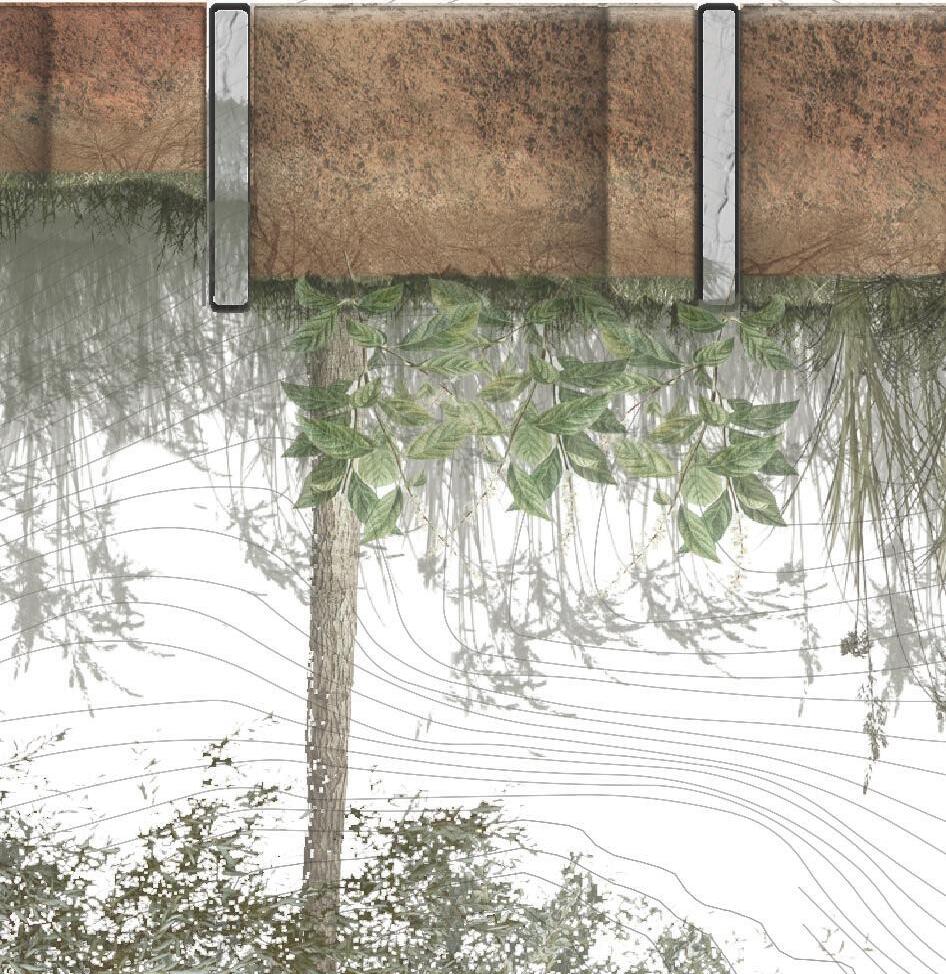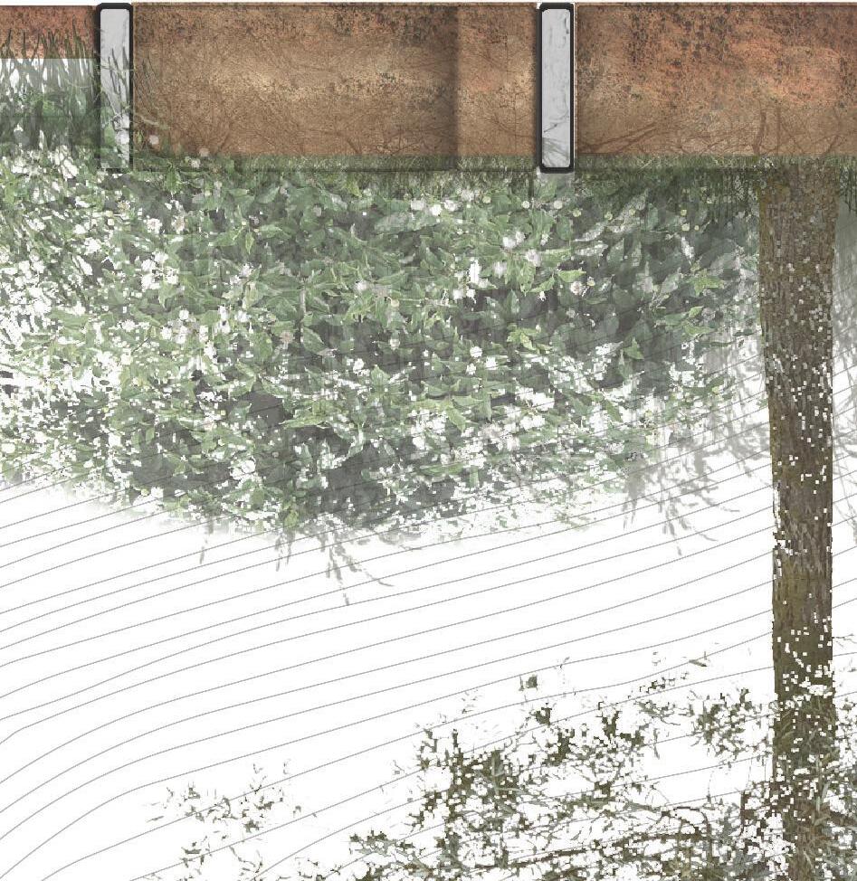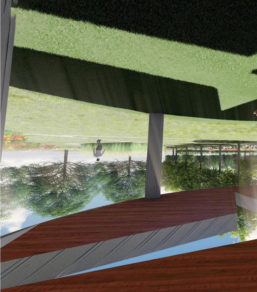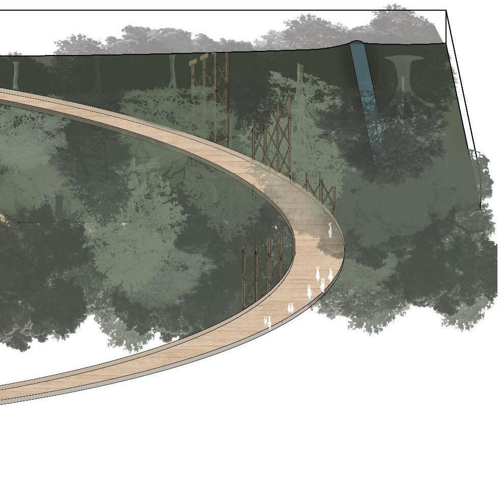 BOTTOM IMAGE: the section of the entrance to the Observable Forest conveys a sense of monumental scale through its structural design and expansive length of the entryway