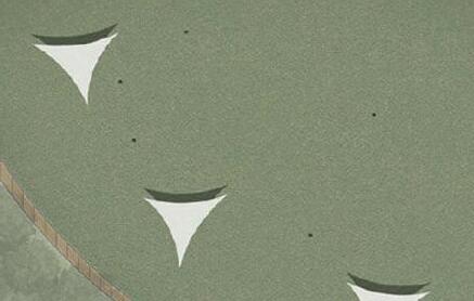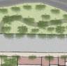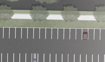RIGHT IMAGE: former parking area transformed into a central greenspace, featuring vegetated trails and stationary workout stations