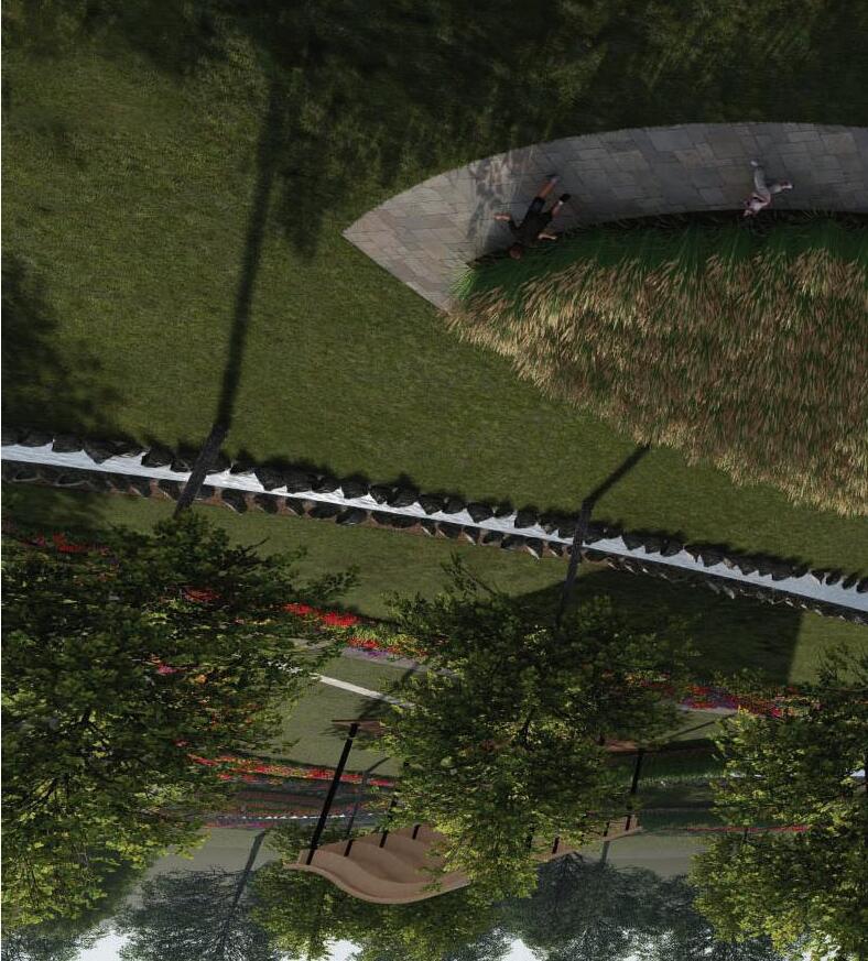 BOTTOM IMAGE: childrenʼs therapy garden with interactive planting beds, easy stream access for exploration, and shaded seating for supervision