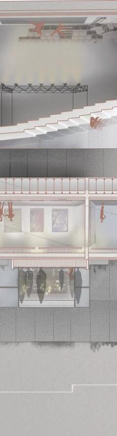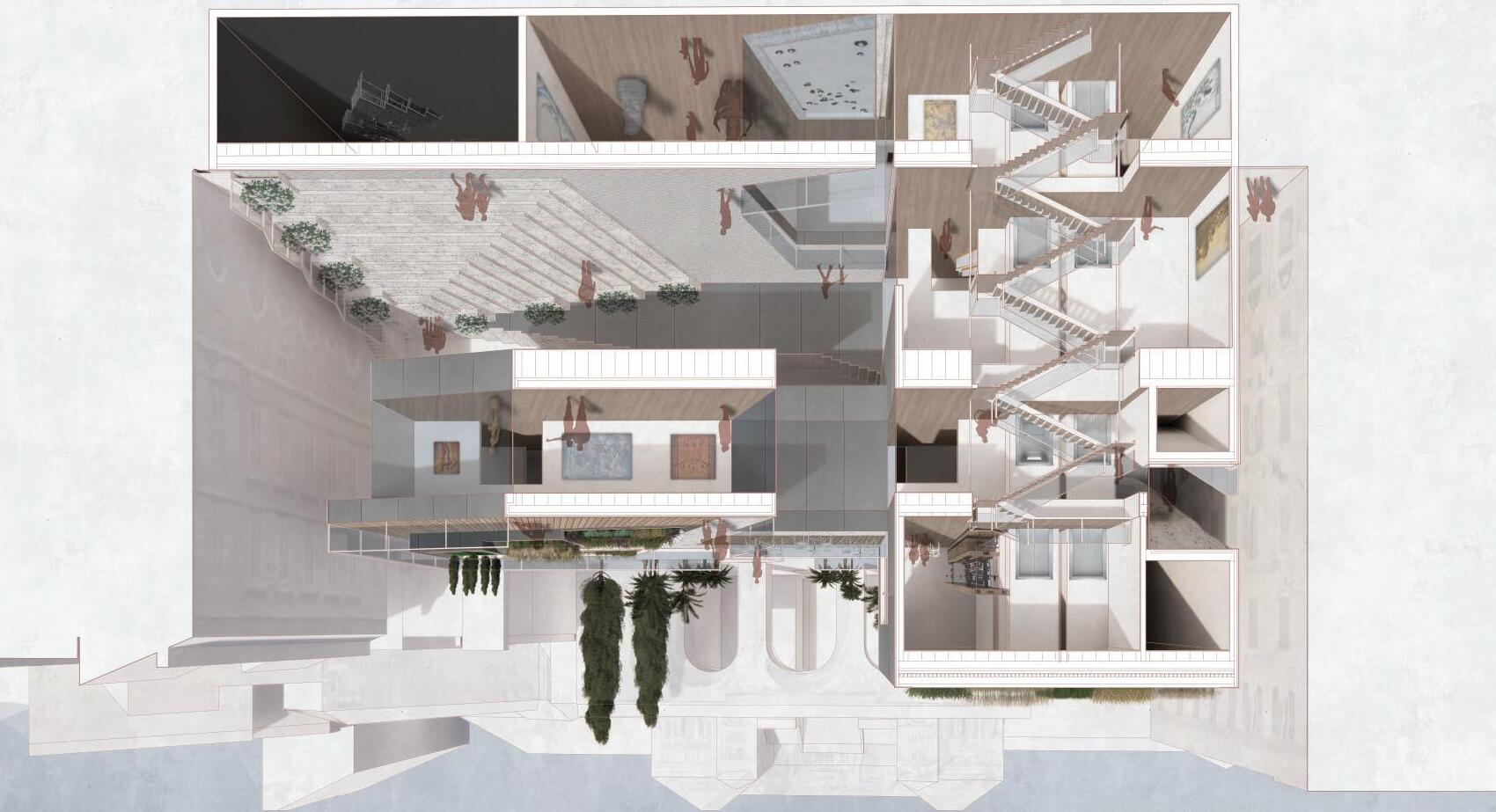 Our proposal features a cantilevered exhibition space for music and art, offering a dynamic experience with a sub-level exhibit and black-box theater, as well as a second-floor main exhibition area. The third floor includes an open-air café and rooftop garden with panoramic port views, connecting to the Palazzo Reale di Genova. A green roof helps manage stormwater and regulate the buildingʼs climate.