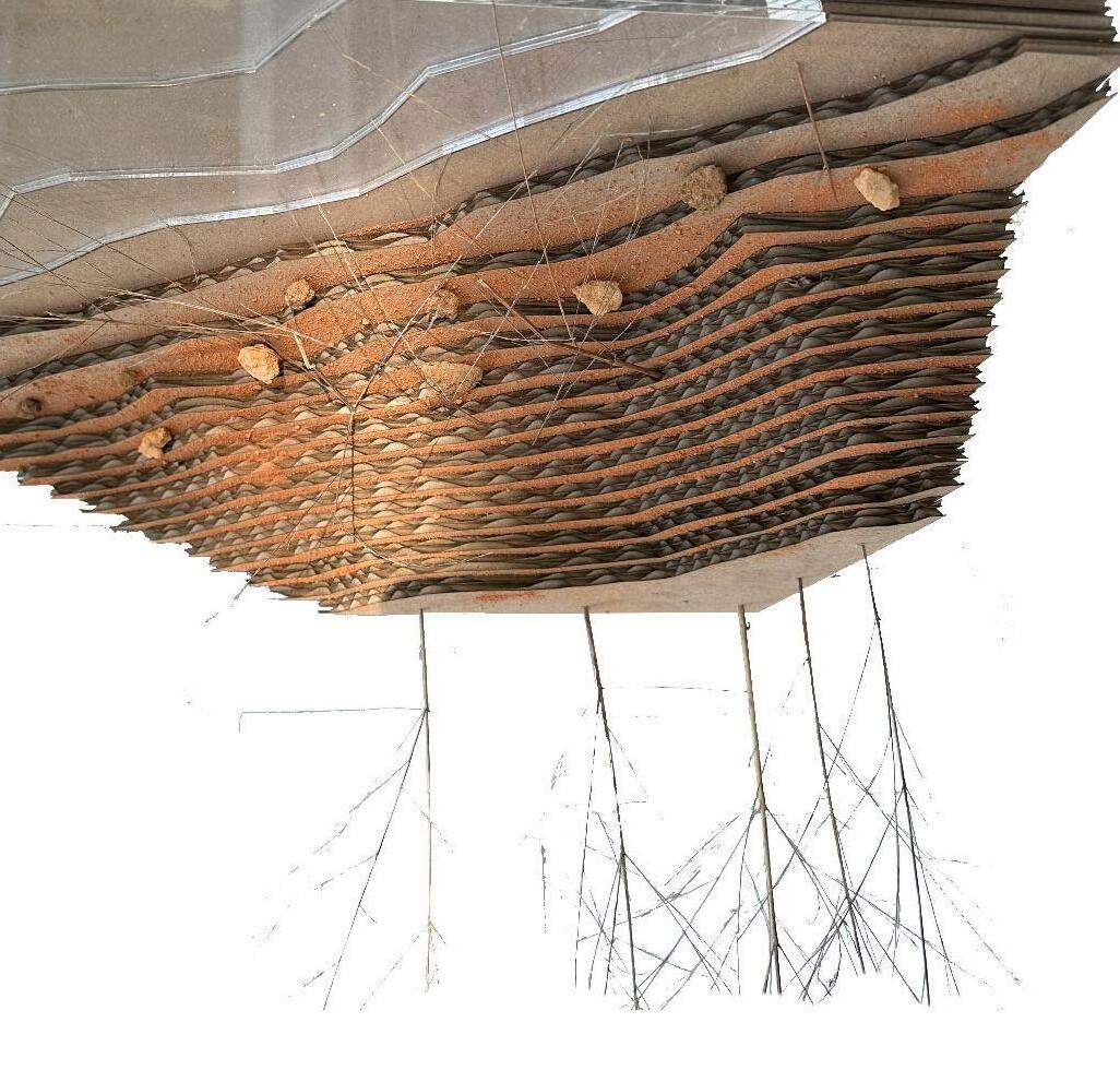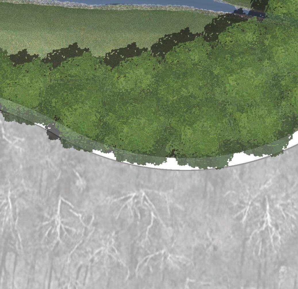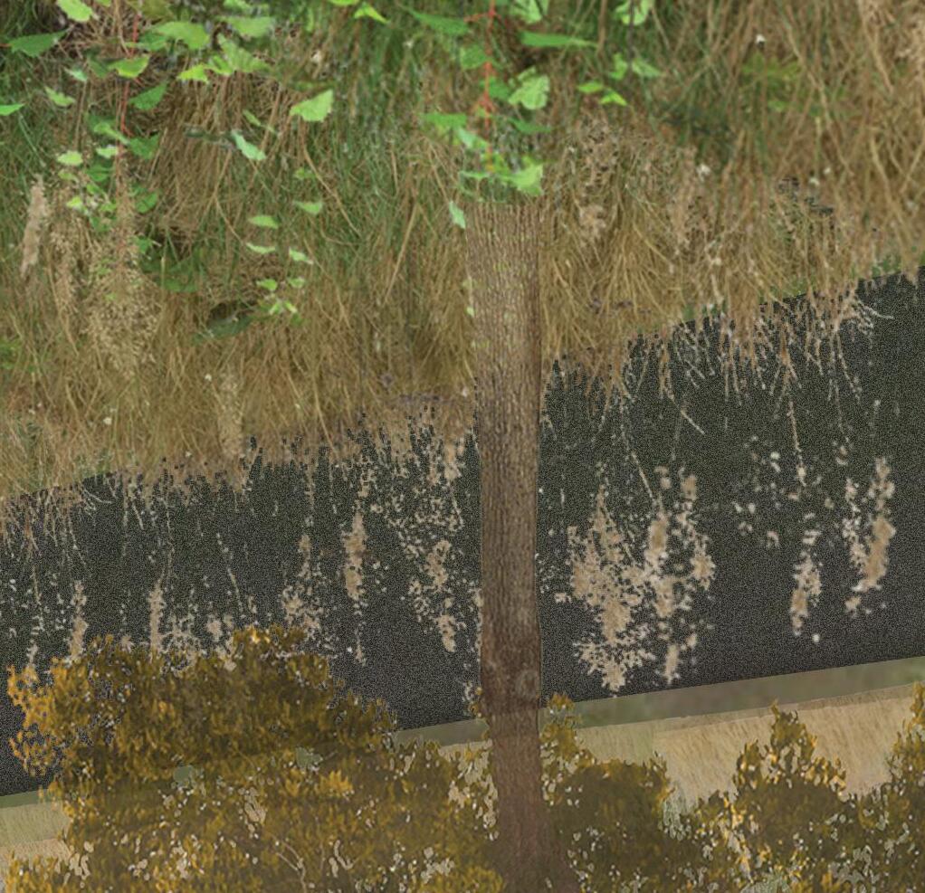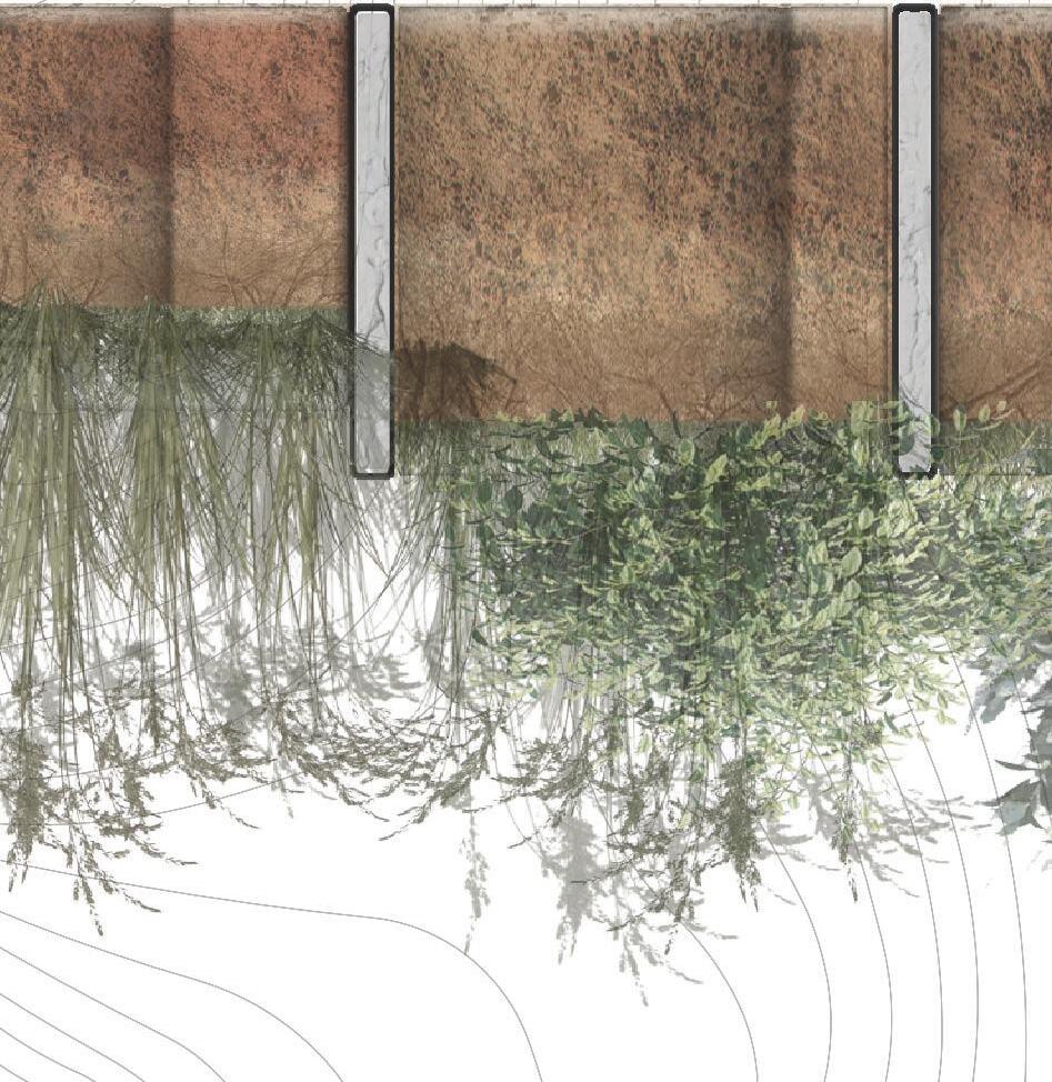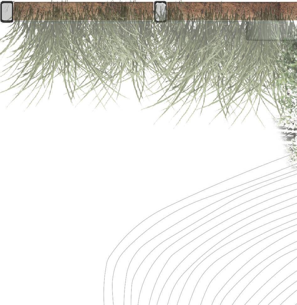 The models accurately represent the siteʼs contours, considering water level fluctuations. Four models, made from chipboard, acrylic, and site-sourced materials, illustrate the process. The first shows existing conditions. In year one, live stakes promote root growth. By year five, vegetation envelops the biostabilizer as roots establish and biodegradation begins. By year ten, the biostabilizer fully decomposes, leaving a selfsustaining ecosystem.