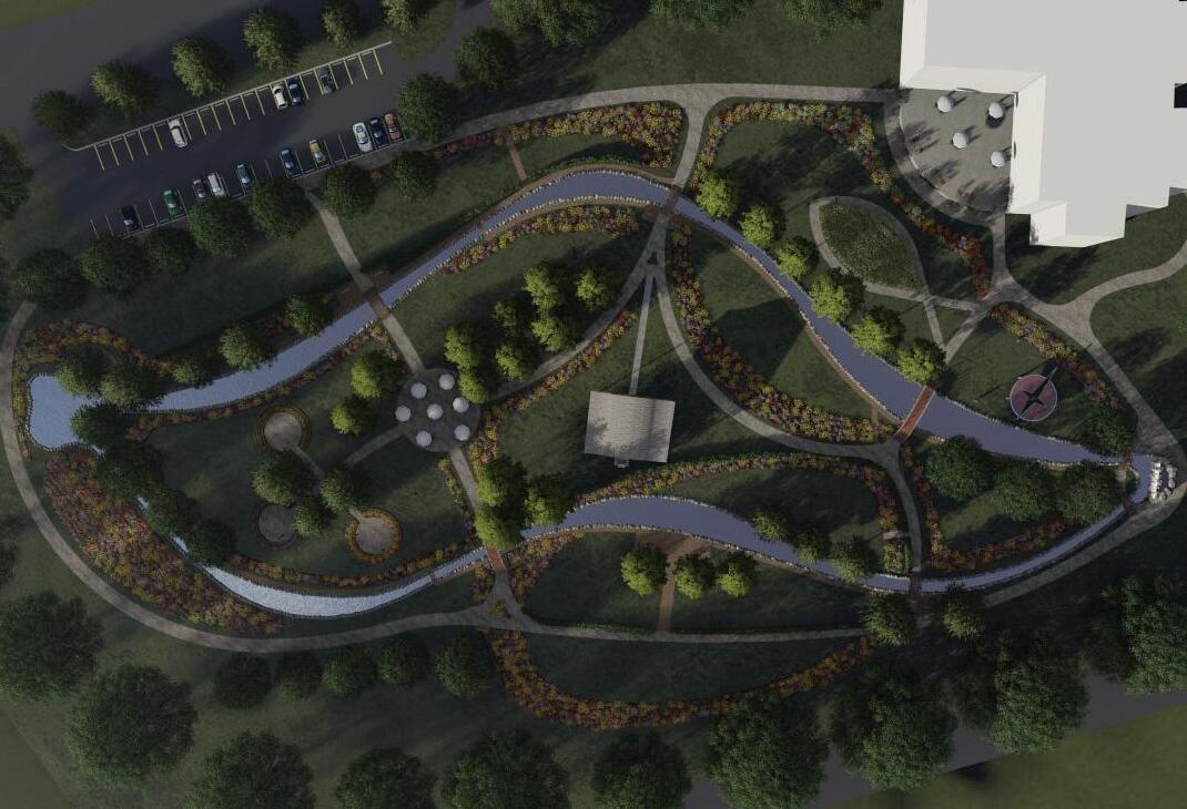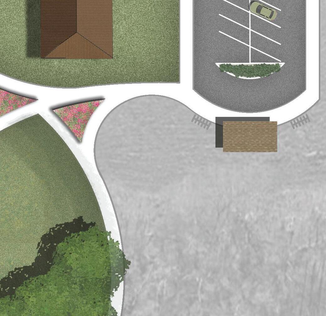 A healing center is planned across from Connie Maxwell Baptist Church to focus on trauma and mental health research, education, and practices. Guided by the principles of Collaboration, Cooperation, Continuity, and Communication, the center serves as a beacon of hope. The surrounding lawn is designed to reflect its mission, with distinct areas for different purposes: a communal prayer zone, a private garden, and a childrenʼs therapy garden with seasonal planting beds. A gently flowing stream connects these spaces, creating a cohesive and harmonious landscape.