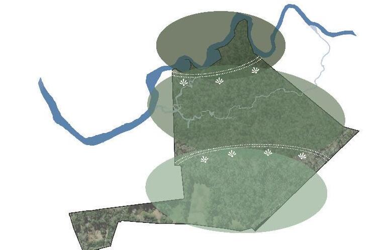 BOTTOM IMAGE: a glimpse into the savannah oak ecosystem, winding alongside Bush Creek, featuring one of several strategically placed waterfront decks
