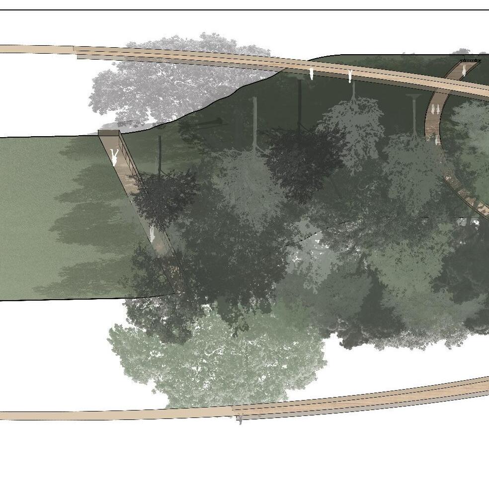 LEFT IMAGE: the Big O boardwalk winds through the tree canopy, with the Bean guiding visitors in between its trestles, offering a unique journey through the heart of the lower wetland ecosystem