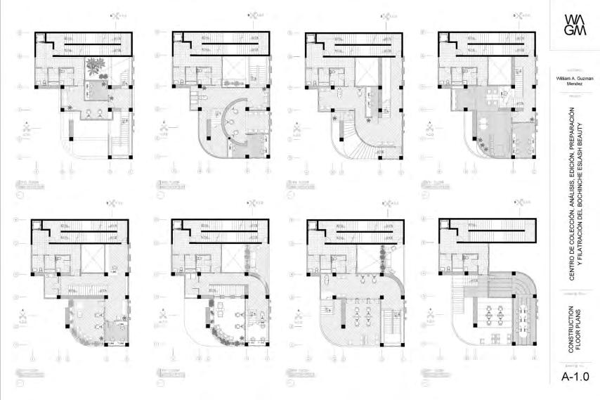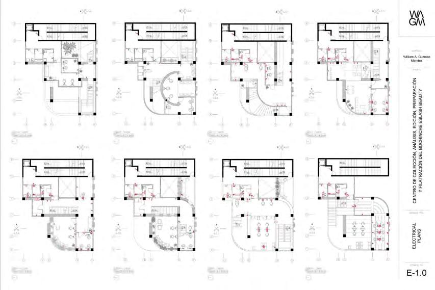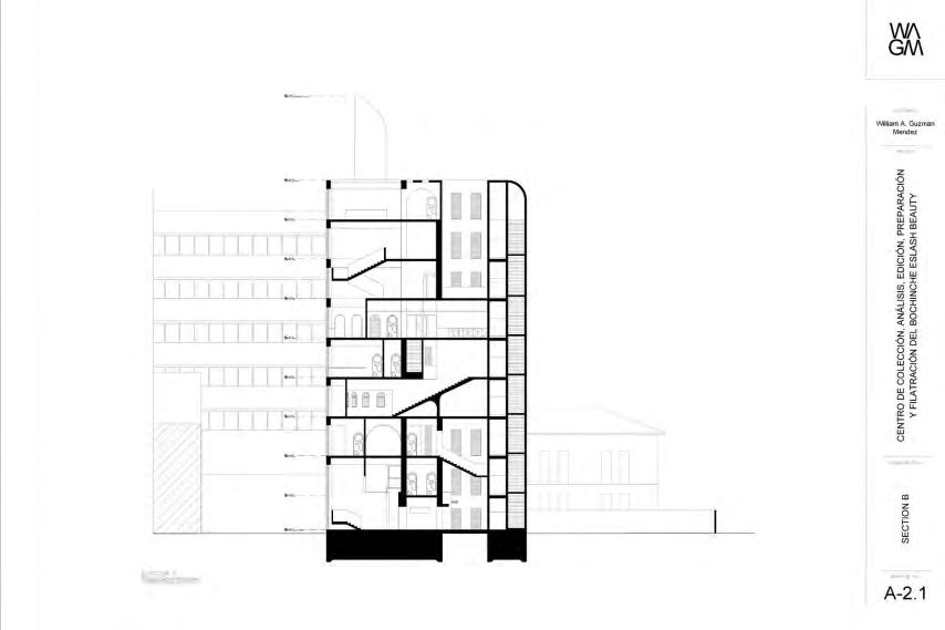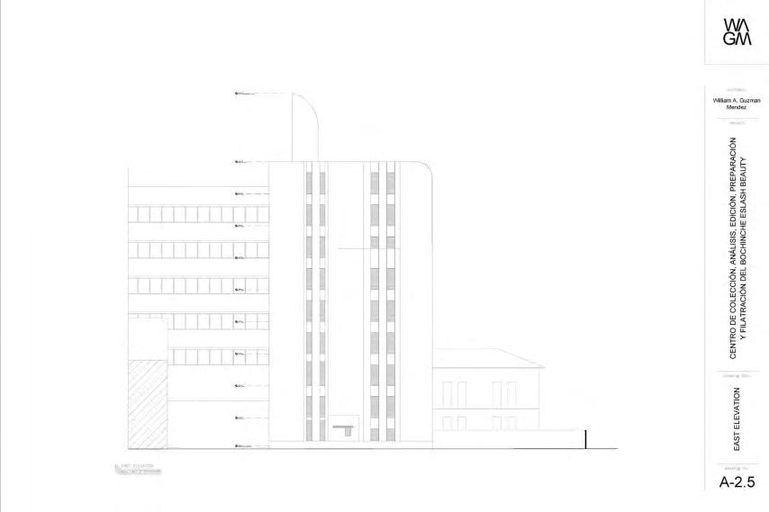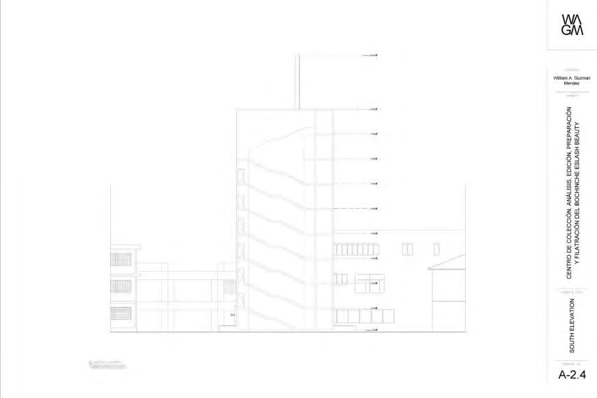 El Centro de Colección, Análisis, Filtración, Preparación y Propagación del Bochinche, Eslash Beauty, consta de 9 niveles de programa mezclados entre el Beauty y el Centro de Colección. La expansión de lo existente se convierte en un tipo de tumor que exagera el diseño del antiguo telégrafo, explotando y parodiando su propio estilo arquitectónico: el art deco. La verticalidad del edificio se da gracias a las restricciones del sitio, lo cual implica que el resultado del diseño será un objeto que rompe con la visual común de su contexto. Esto, a su vez, se convierte en su ventaja, ya que necesitamos atraer a una clientela; y qué mejor manera de lograr esto que crear un tipo de “click-bait” arquitectónico o, como en el caso de los programas de chismes, una noticia controversial. Sus colores, evocativos de un circo, surgen de la necesidad de crear una imagen de un edificio que no se toma en serio.