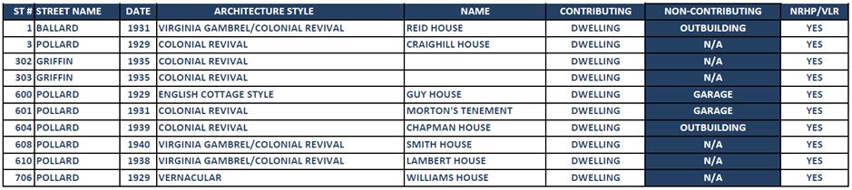 Buildings and neighborhoods listed on or eligible for the National Register of Historic Places and other contributing and noncontributing buildings are designated by neighborhood in Chapter 4. These neighborhood lists contain buildings from the 1992 survey performed by Frazier and Associates and recent staff updates identifying contributing and noncontributing buildings in the City. Based on National Register criteria, Frazier and Associates recommended potential individual buildings and neighborhoods that would qualify as historic districts on the National Register of Historic Places. The purpose of the inventory of buildings and neighborhoods listed on or eligible for the National Register of Historic Places is not to mandate preservation and protection of the listed property. Rather, the list alerts the Architectural Review Board to the fact that the property has some significance in defining the City’s character by representing architectural styles and cultural periods from the City’s past, and, in specifically, that the property contributes to the character of the neighborhood and surrounding area. When the Architectural Review Board reviews development proposals for the site of a listed property or property in the vicinity of a listed property, the Architectural Review Board considers the character of the property, the role it plays in the surrounding area, and the value of preservation of the resource. It weighs it against the current state of the property and the surrounding area and the proposal for alteration or redevelopment of the site. If the property in its current state has lost much of the integrity which made it significant or contributory, and if the proposed new development would improve the character of the surrounding area, the Architectural Review Board may decide that alteration