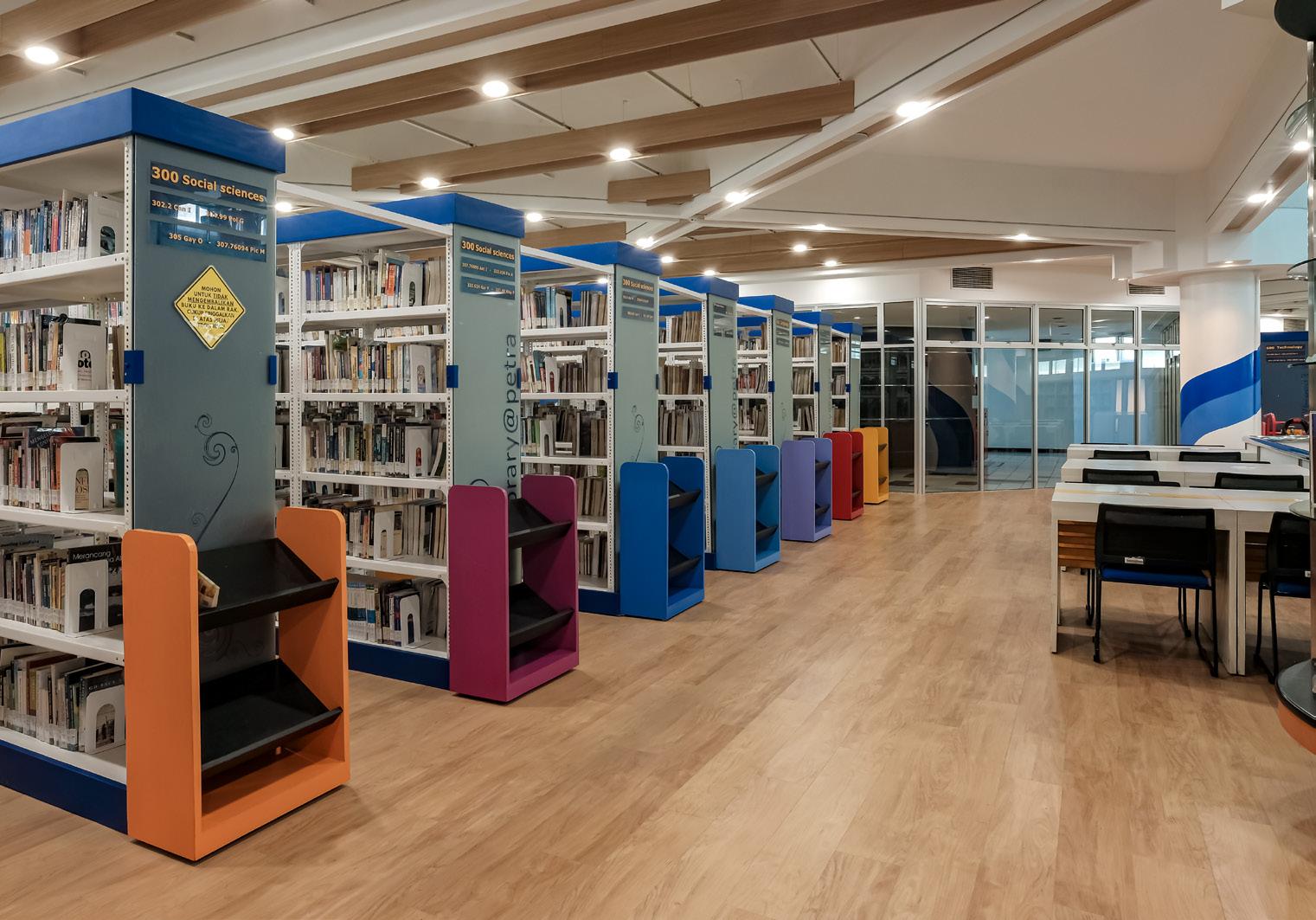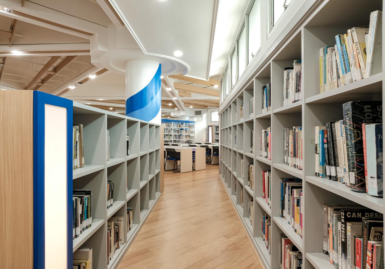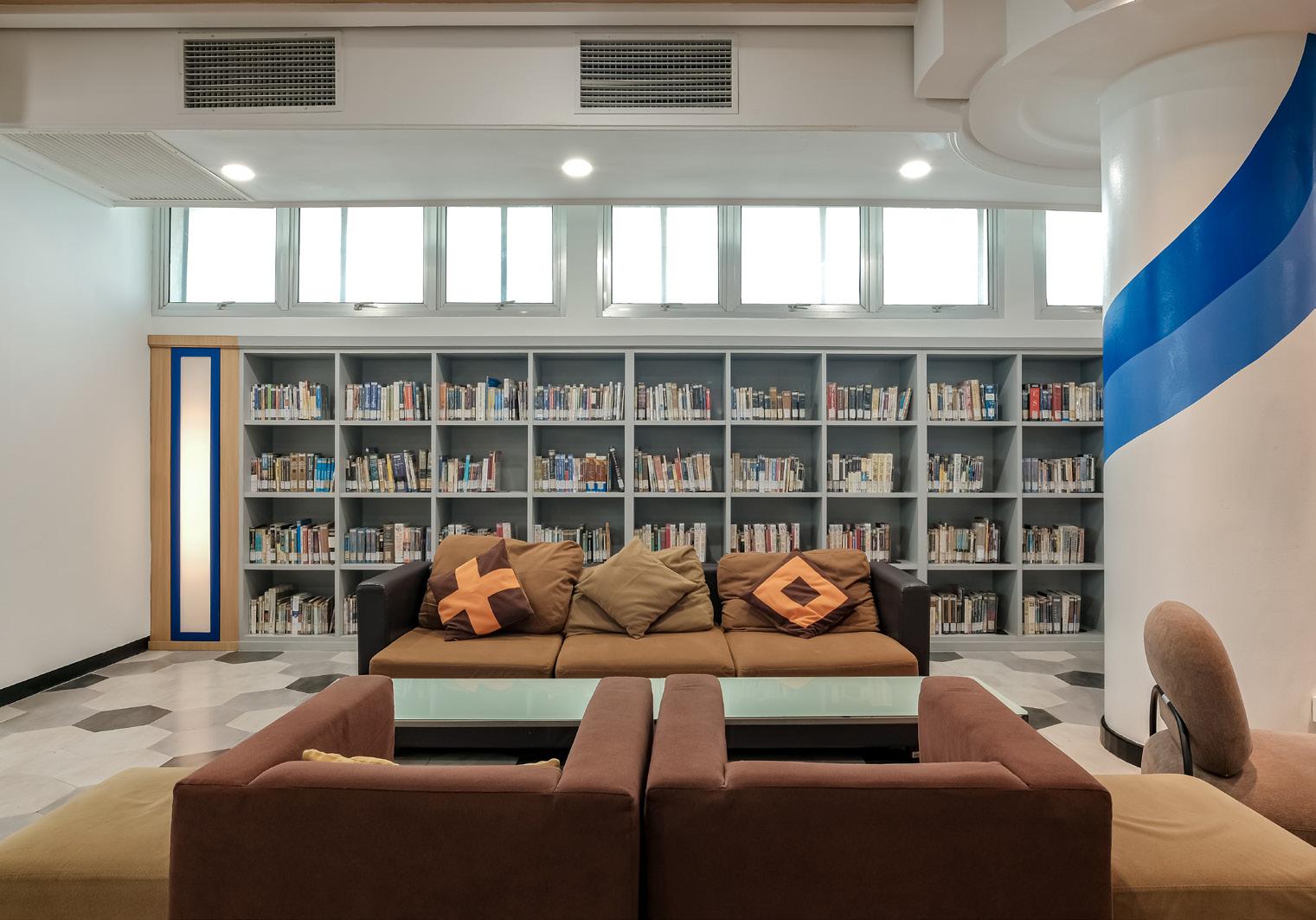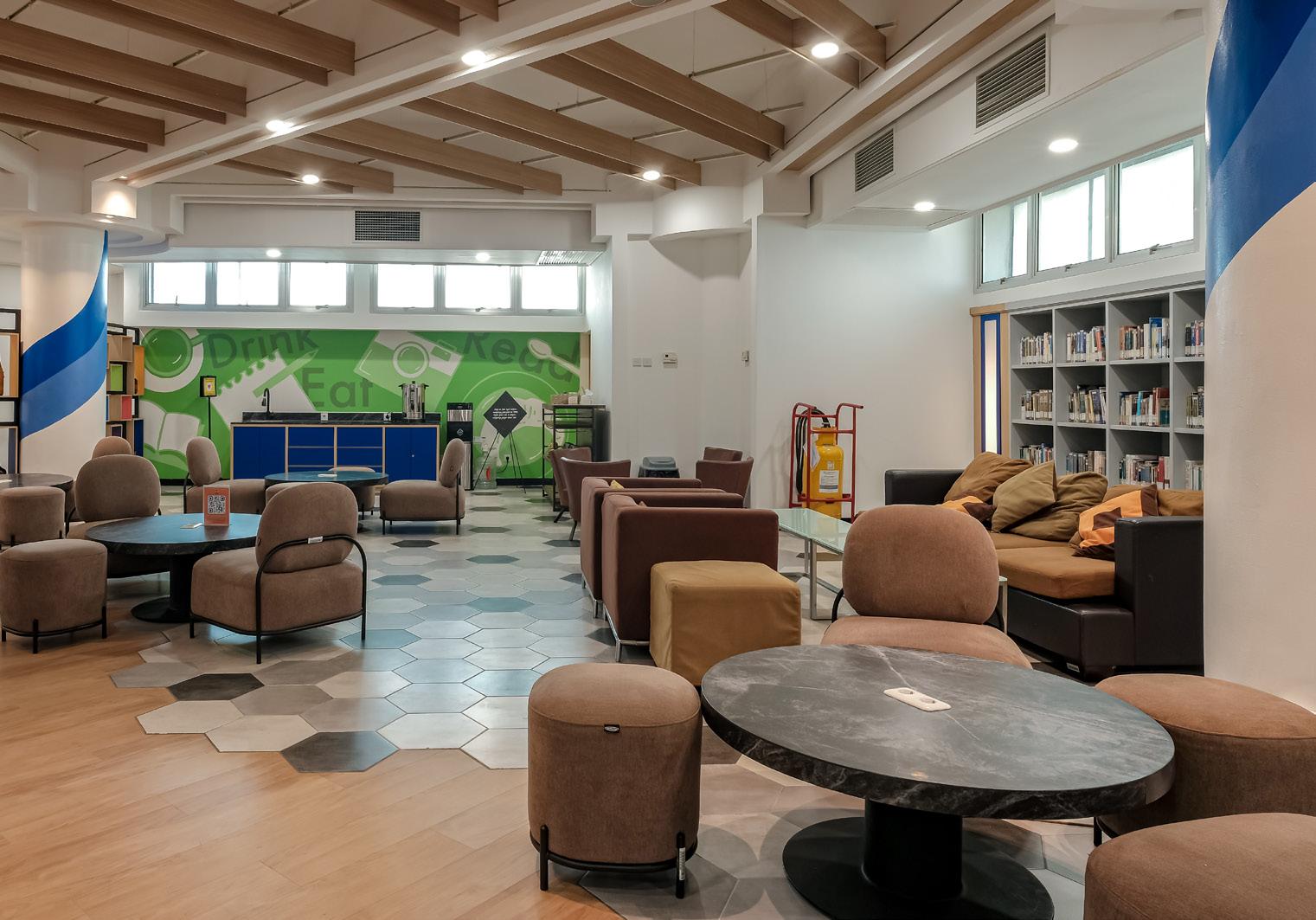 Desain interior perpustakaan yang mengubah kesan perpustakaan lama yang jadul, terlalu banyak lemari buku-buku, dan kurang bisa memenuhi kebutuhan mahasiswa zaman sekarang, menjadi wajah perpustakaan baru yang mengarah pada aspek open & collaborative environment dimana para mahasiswa bisa saling berkumpul dan berkolaborasi satu sama lain dalam suasana ruang yang terbuka dan didukung juga dengan fasilitas pendukung yang nyaman untuk bekerja santai baik secara berkelompok atau individu, public maupun private.