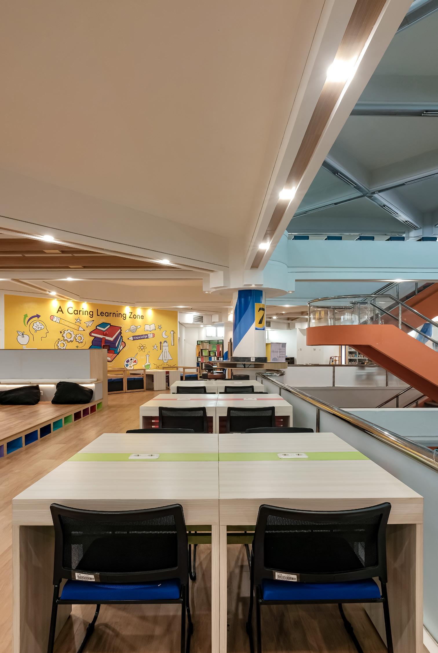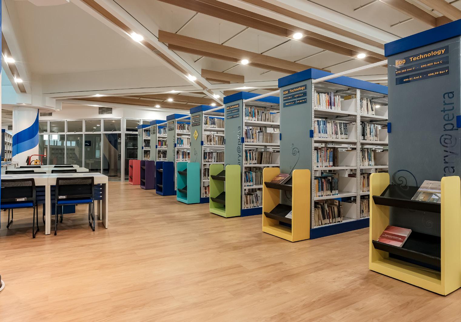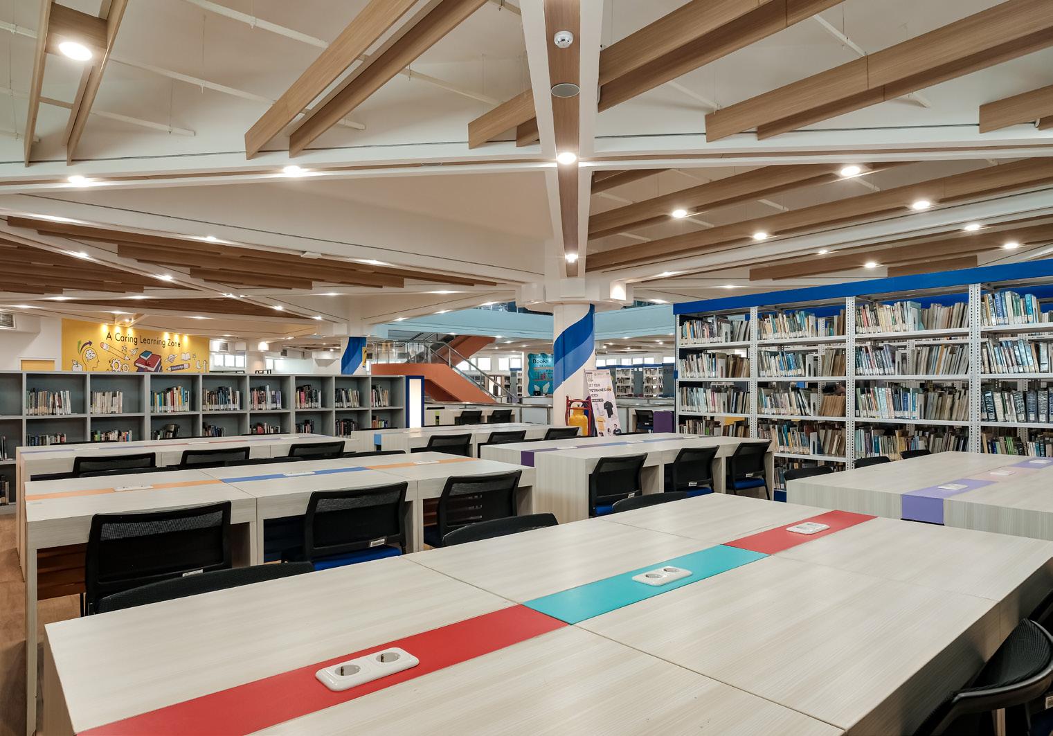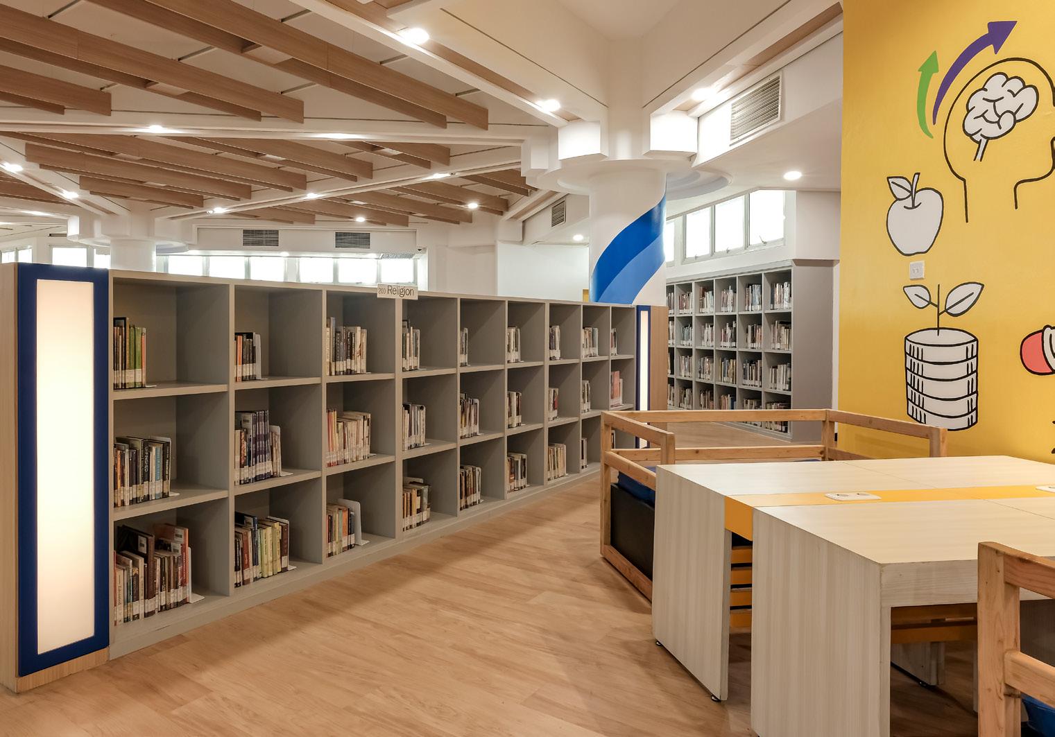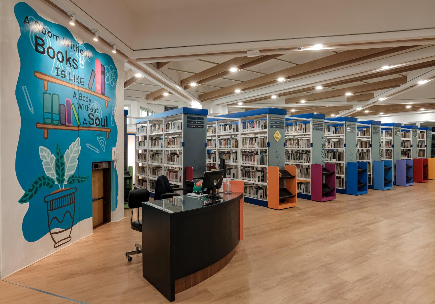Desain interior perpustakaan yang mengubah kesan perpustakaan lama yang jadul, terlalu banyak lemari buku-buku, dan kurang bisa memenuhi kebutuhan mahasiswa zaman sekarang, menjadi wajah perpustakaan baru yang mengarah pada aspek open & collaborative environment dimana para mahasiswa bisa saling berkumpul dan berkolaborasi satu sama lain dalam suasana ruang yang terbuka dan didukung juga dengan fasilitas pendukung yang nyaman untuk bekerja santai baik secara berkelompok atau individu, public maupun private.