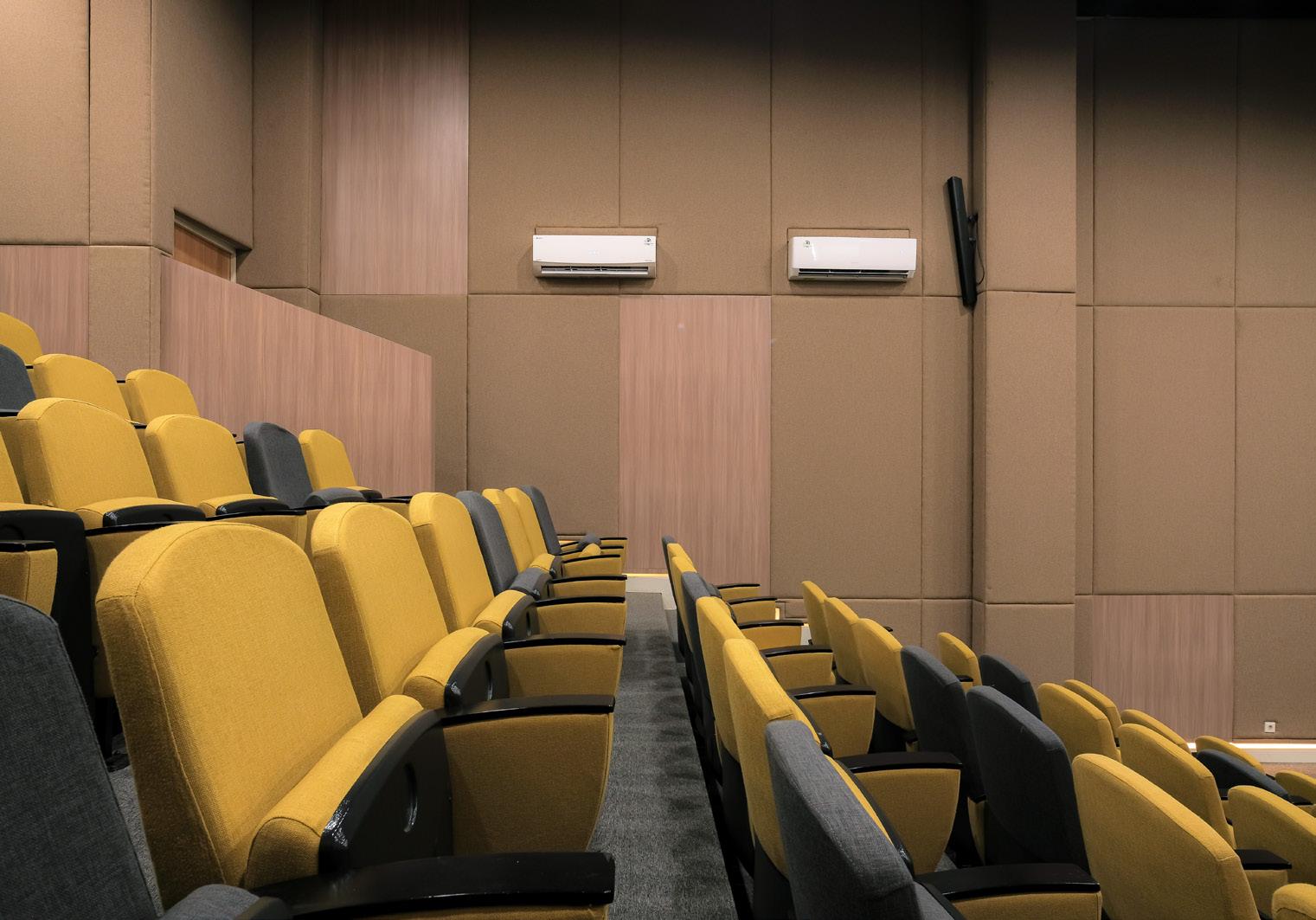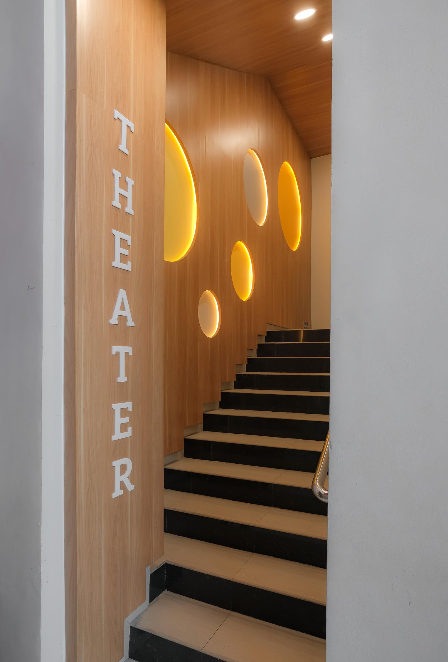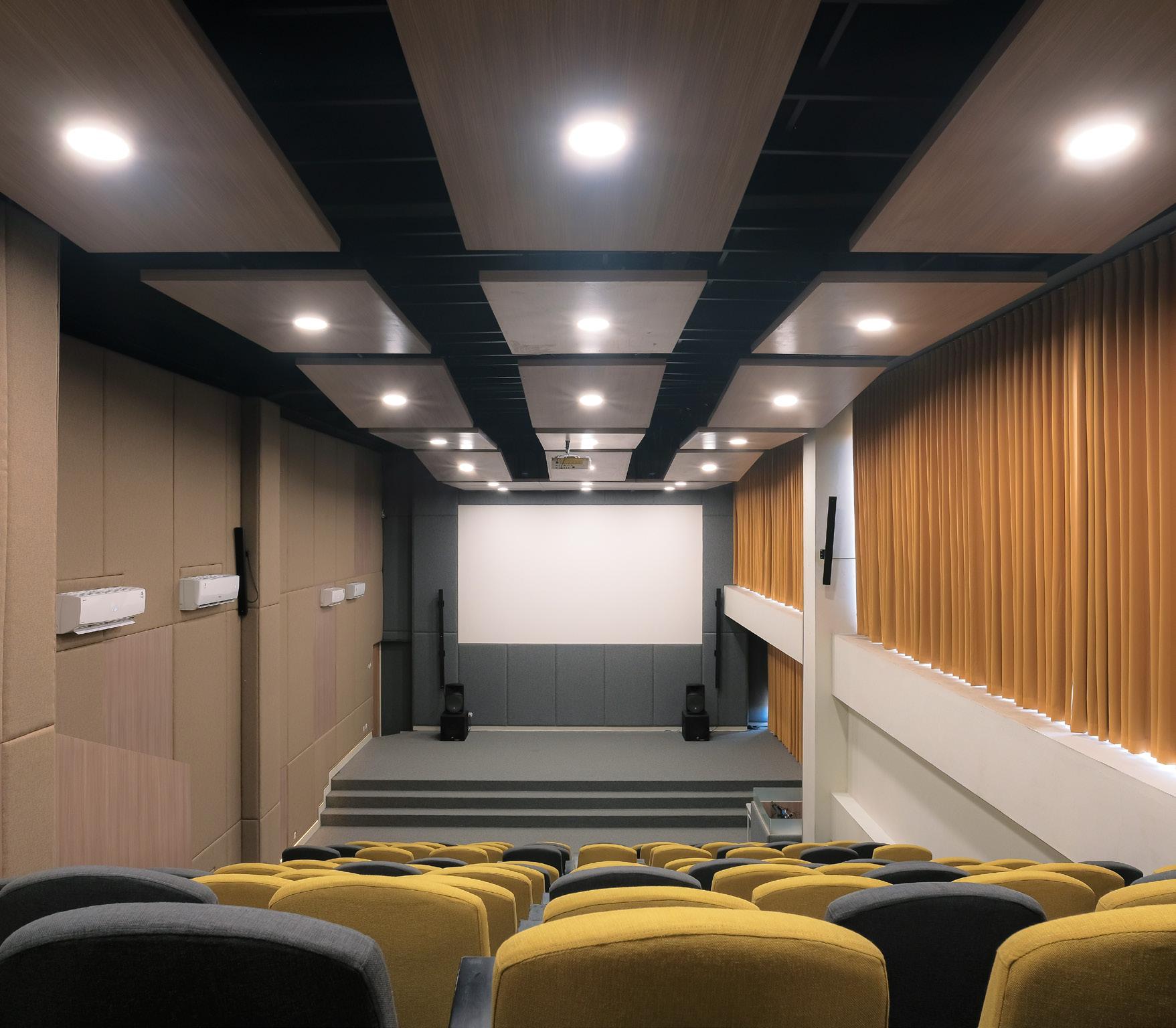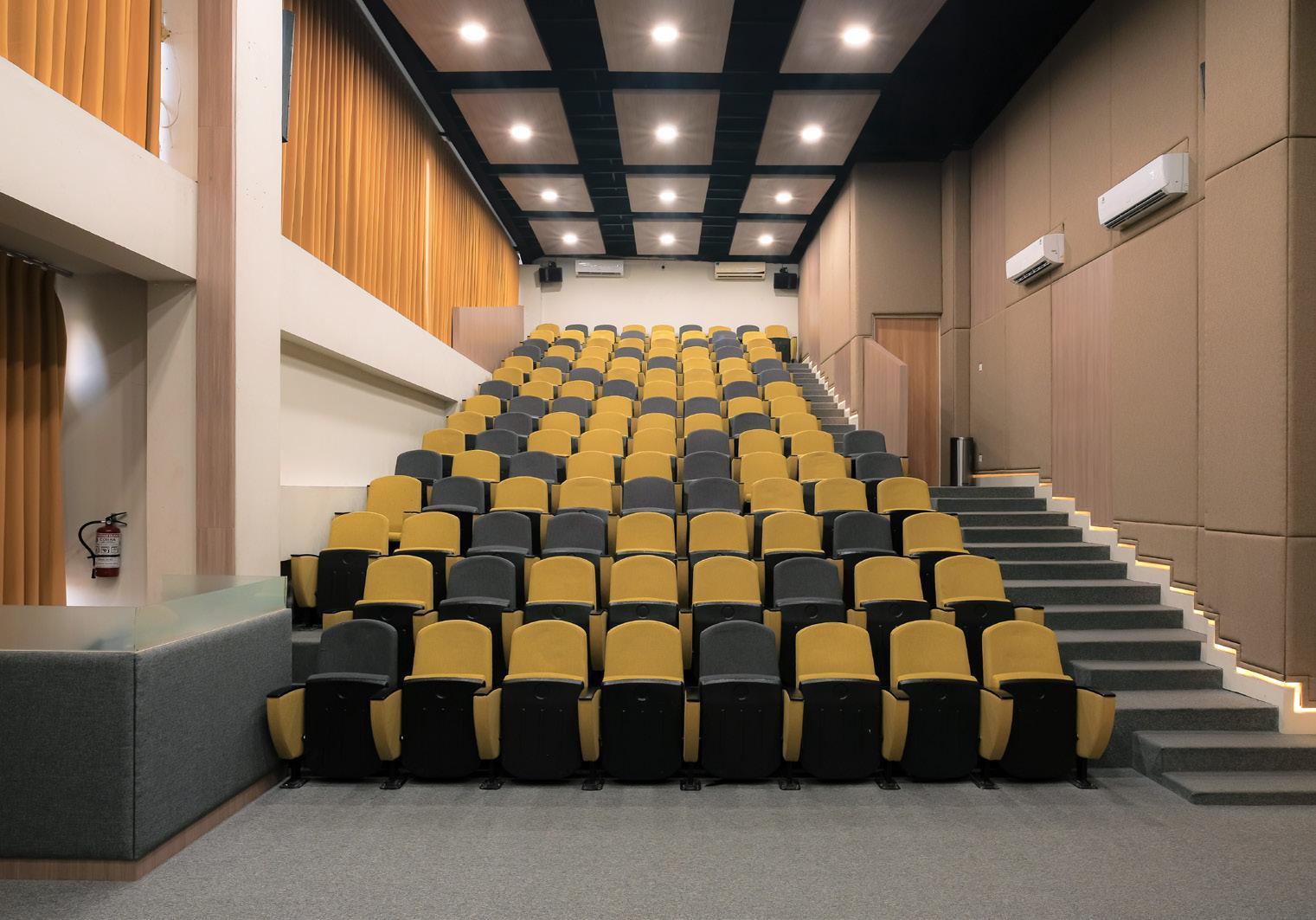 Desain interior theater hall dengan konsep form follow function yang mempertimbangkan kondisi existing dengan kebutuhan desain akustik yang baik guna mencapai fungsi audiovisual yang maksimal. Perpaduan warna brand identity biru dan kuning yang diaplikasikan dalam elemen interior membuat suasana menjadi lebih fun bagi para siswa ketika beraktivitas dalam ruang ini. Dengan penggunaan kombinasi warna dan material yang senada menciptakan kesan pelingkup ruang yang menjadi satu kesatuan komposisi yang tidak terpisahkan..