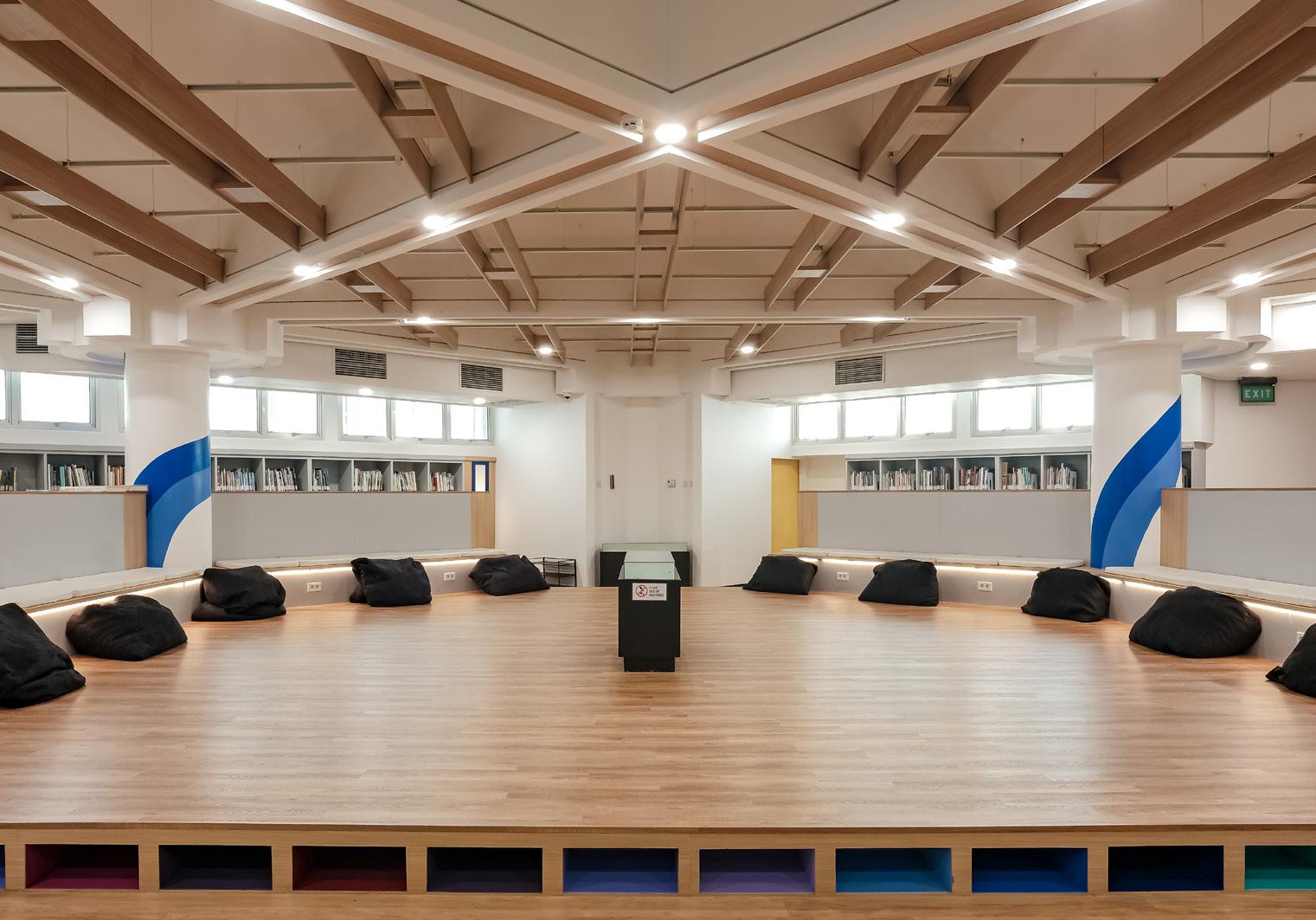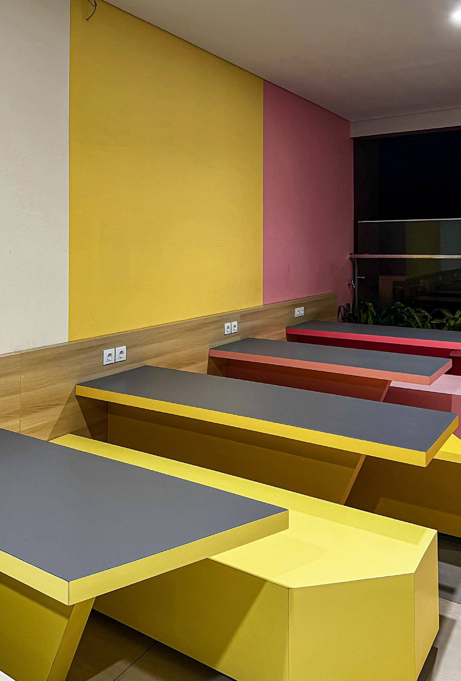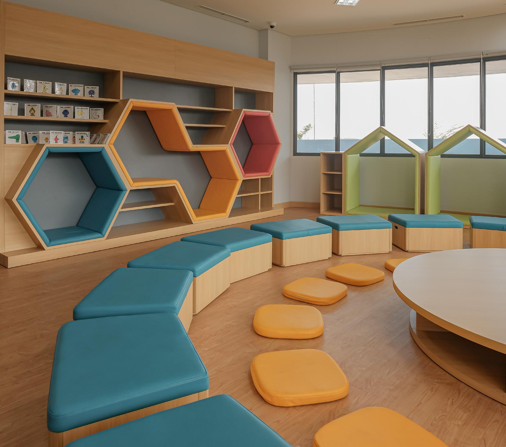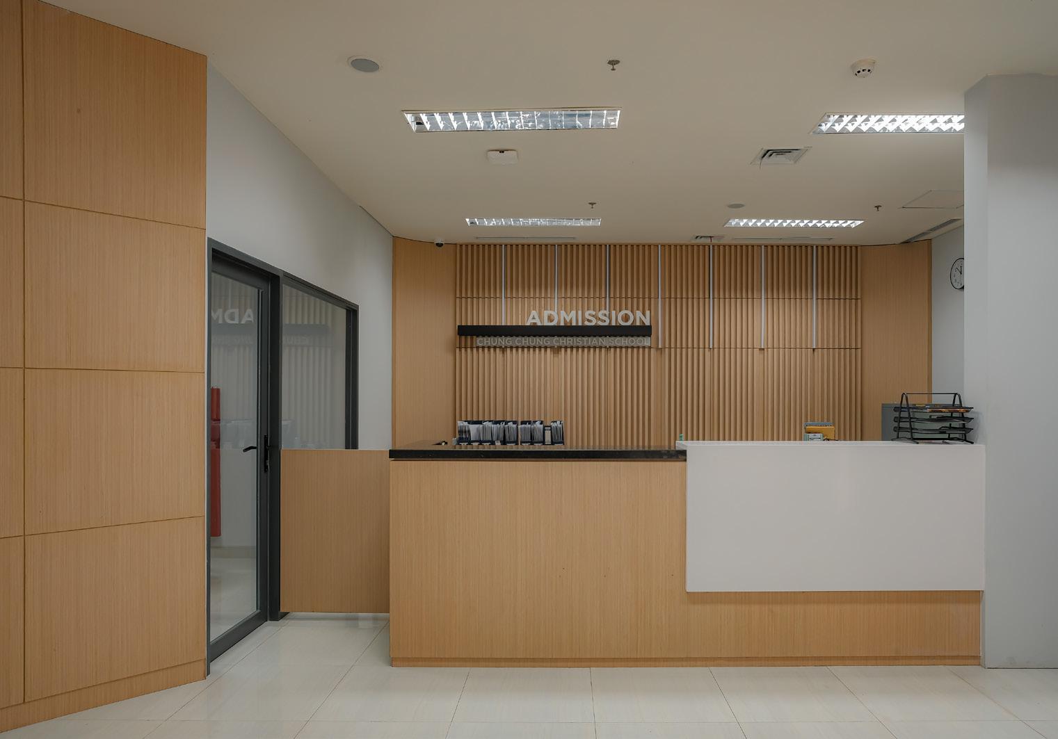 Desain interior theater hall dengan konsep form follow function yang mempertimbangkan kondisi existing dengan kebutuhan desain akustik yang baik guna mencapai fungsi audiovisual yang maksimal. Perpaduan warna brand identity biru dan kuning yang diaplikasikan dalam elemen interior membuat suasana menjadi lebih fun bagi para siswa ketika beraktivitas dalam ruang ini. Dengan penggunaan kombinasi warna dan material yang senada menciptakan kesan pelingkup ruang yang menjadi satu kesatuan komposisi yang tidak terpisahkan..
