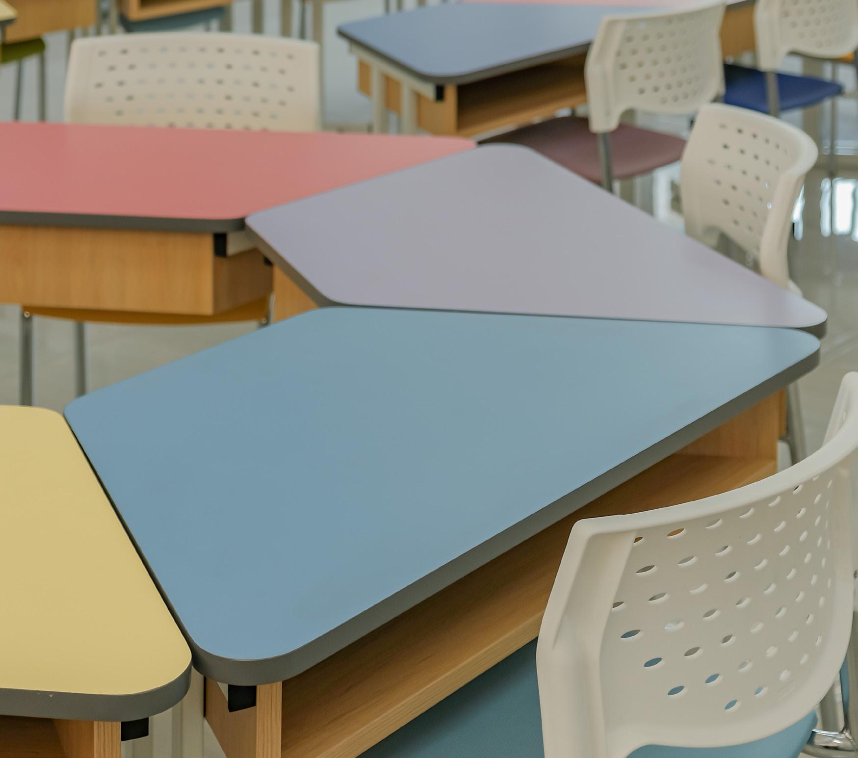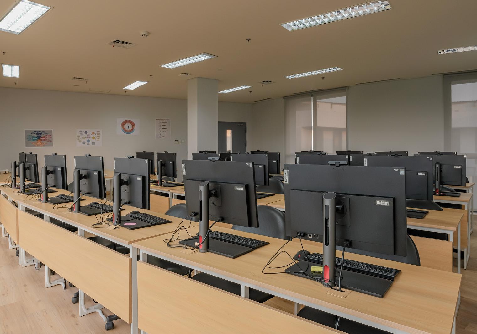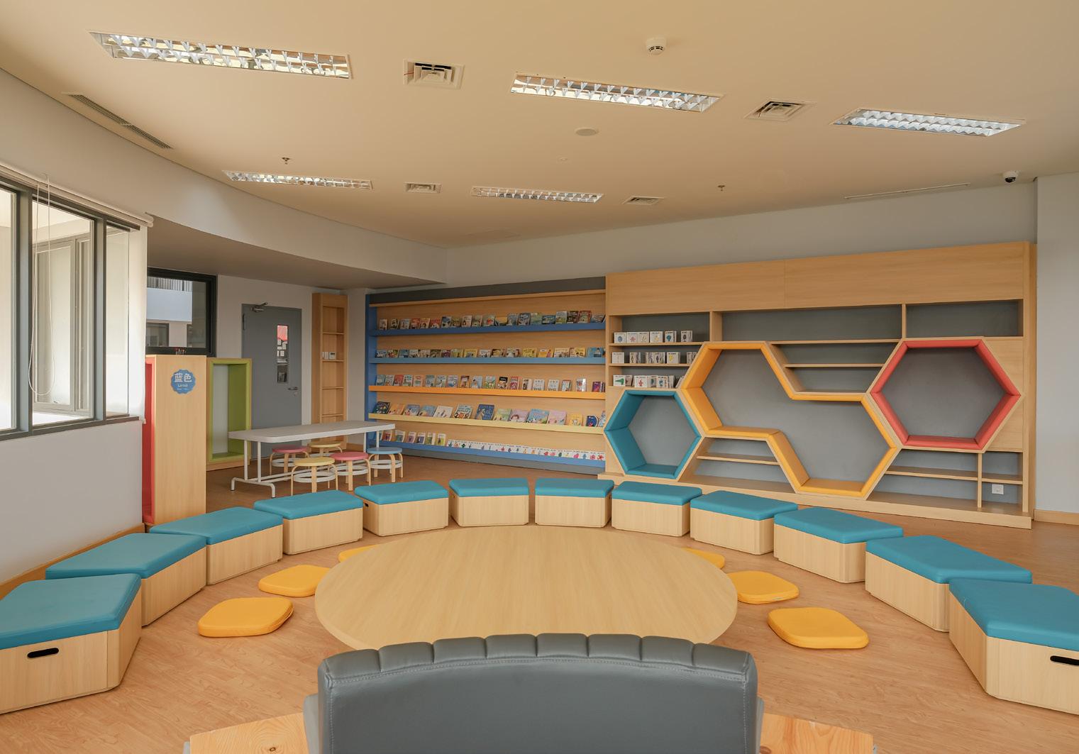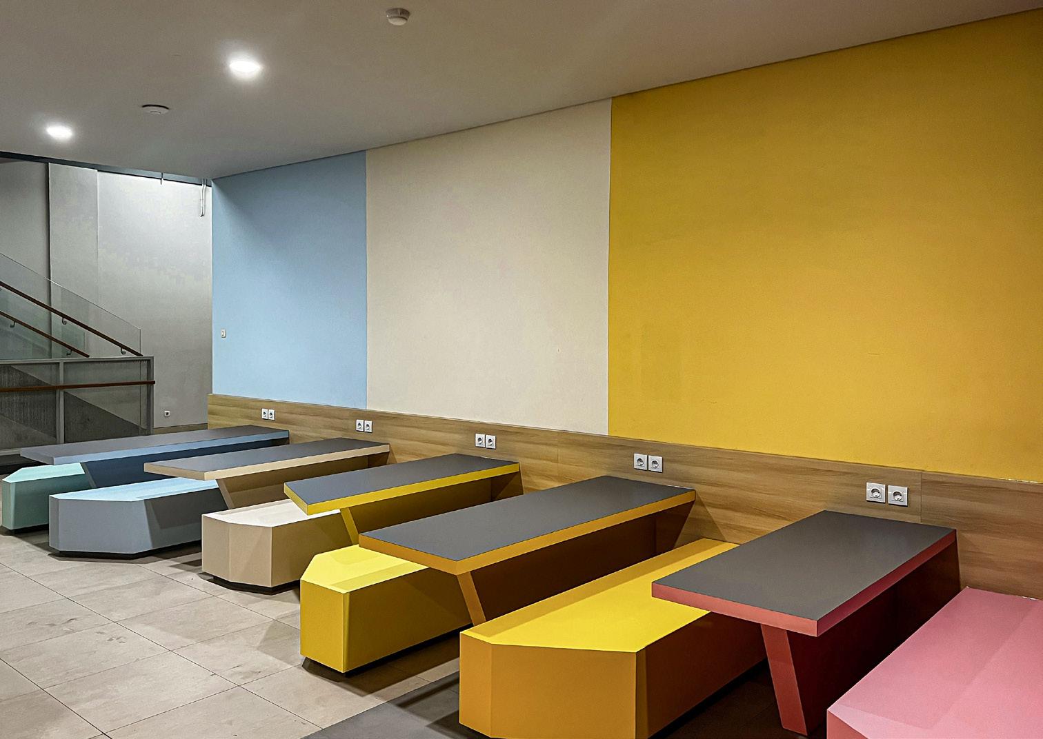 Desain interior theater hall dengan konsep form follow function yang mempertimbangkan kondisi existing dengan kebutuhan desain akustik yang baik guna mencapai fungsi audiovisual yang maksimal. Perpaduan warna brand identity biru dan kuning yang diaplikasikan dalam elemen interior membuat suasana menjadi lebih fun bagi para siswa ketika beraktivitas dalam ruang ini. Dengan penggunaan kombinasi warna dan material yang senada menciptakan kesan pelingkup ruang yang menjadi satu kesatuan komposisi yang tidak terpisahkan..