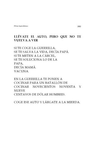 LLÉVATE EL AUTO, PERO QUE NO TE VUELVA A VER SI TE COGE LA GUERRILLA, SE TE SALVA LA VIDA, DECÍA PAPÁ. SI TE METEN A LA CÁRCEL, SE TE SOLUCIONA LO DE LA PAPA, DECÍA MAMÁ. VACUNA. EN LA GUERRILLA TE PONEN A COCINAR PARA UN BATALLÓN DE COCINAR NOVECIENTOS NOVENTA NUEVE CENTAVOS DE DÓLAR HOMBRES.