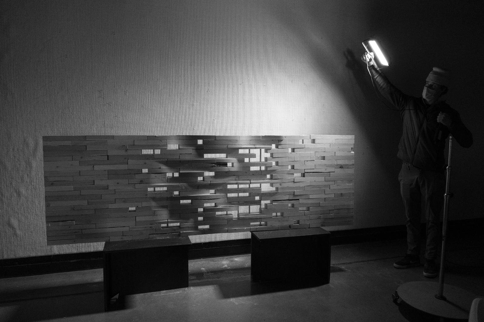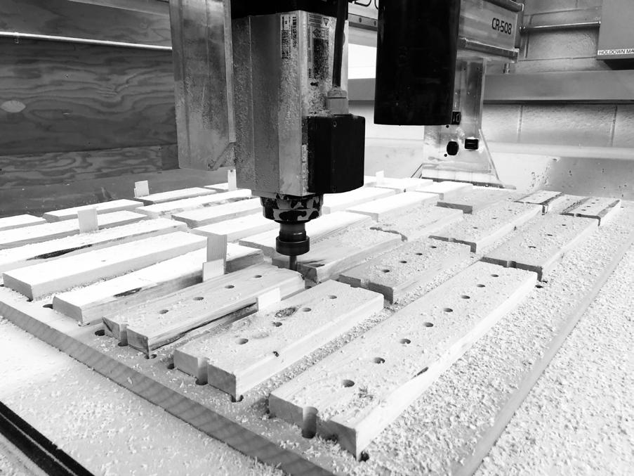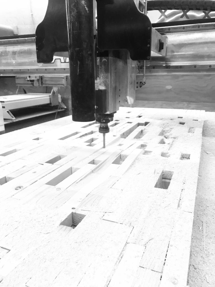 Once put together, the wall assembly was then drilled into plywood and placed back into the CNC to add aesthetic interest by playing with light and curves.