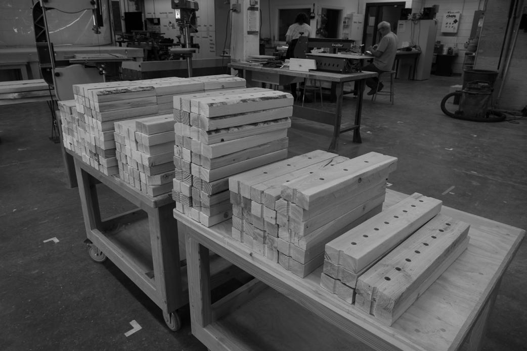 A template was created that allowed for a factory-like production of standardized pieces of 2x4. In addition, precise holes were drilled to allow for dowel lamination.