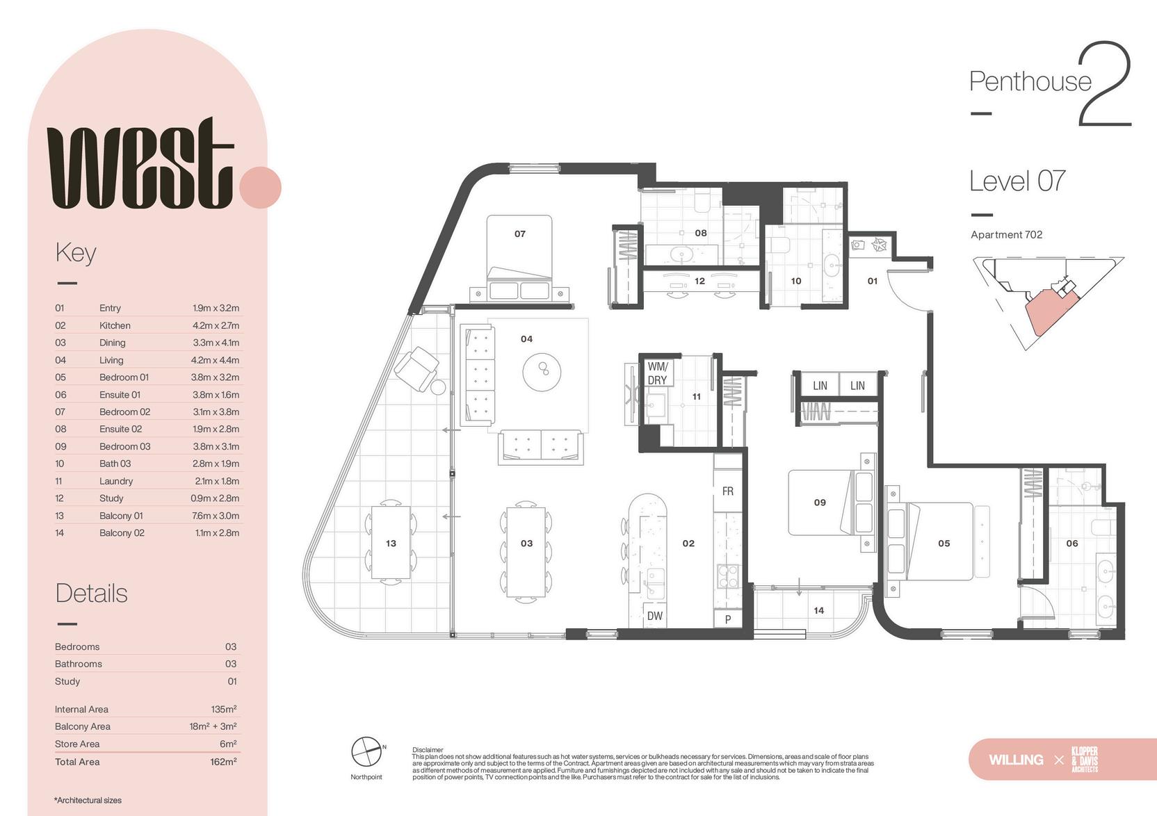 DW WM/ DRY P FR LIN LIN 11 03 08 04 10 09 02 01 07 05 06 12 01 02 03 04 05 06 07 08 09 10 11 12 Bedrooms Bathrooms Powder Room InternalArea BalconyArea StoreArea TotalArea Entry Kitchen Dining Living Bedroom01 Ensuite01 Bedroom02 Bedroom03 Bath02 Laundry/Powder Balcony01 Balcony02 1 9mx1 5m 4 2mx2 7m 3 4mx4 1m 4 1mx4 4m 3 8mx3 1m 3 8mx1 6m 3 9mx3 1m 3 1mx4 0m 2 7mx1 9m 2 1mx1 7m 7 5mx2 9m 1 0mx2 8m 03 02 01 123m2 18m2+3m2 4m2 148m2 Key Details Type K *Architectural sizes Level 03-06 Apartments 302, 402, 502, 602 Northpoint Disclaimer Th s plan does not show addit onal features such as hot water systems serv ces or bulkheads necessary or services D mensions areas and sca e of floor p ans are approximate only and sub ect to the terms of the Contract Apartment areas g ven are based on architectura measurements which may vary rom strata areas as d fferent methods of measurement are appl ed Furn ture and furnish ngs dep cted are not inc uded w th any sale and should not be taken to nd cate the final posit on of power points TV connection po nts and the l ke Purchasers must refer to the contract for sa e for the l st of nclus ons N
