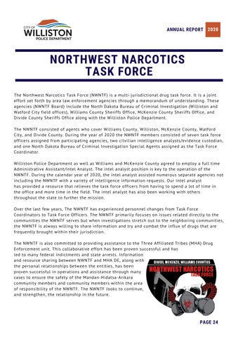 The NWNTF consisted of agents who cover Williams County, Williston, McKenzie County, Watford City, and Divide County During the year of 2020 the NWNTF members consisted of seven task force officers assigned from participating agencies, two cilvilian intelligence analysts/evidence custodian, and one North Dakota Bureau of Criminal Investigation Special Agents assigned as the Task Force Coordinator