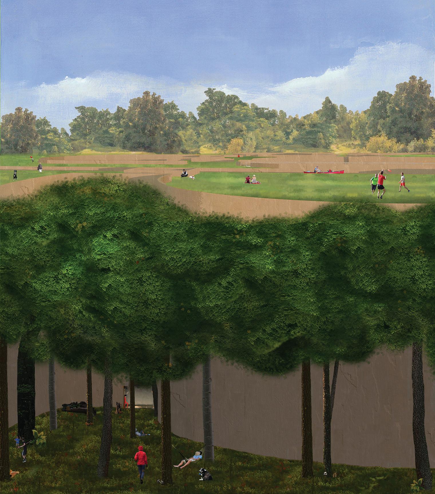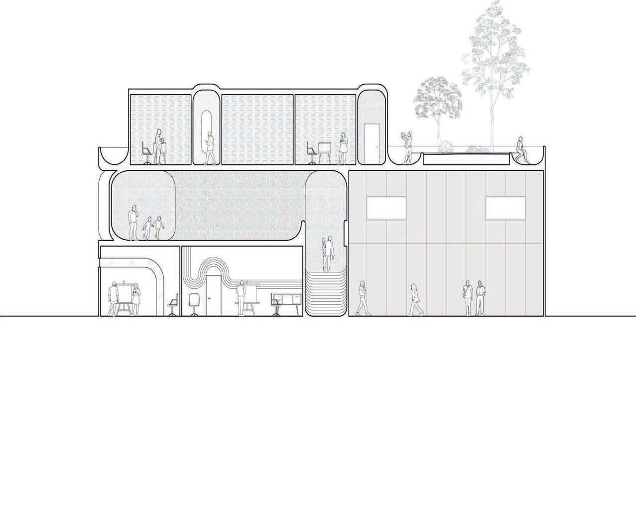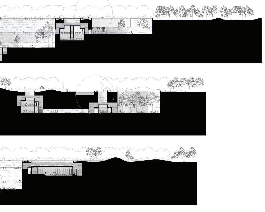 The community center’s strategic placement on the canal encourages local usage of the canal trail and tourist activity by becoming a destination whose primary entrance is along the trail. The territory’s entrance turns the trail into a bridge on a gridded circulatory system that guides one through excavations, tunnels, and underground chambers which house buildings. .