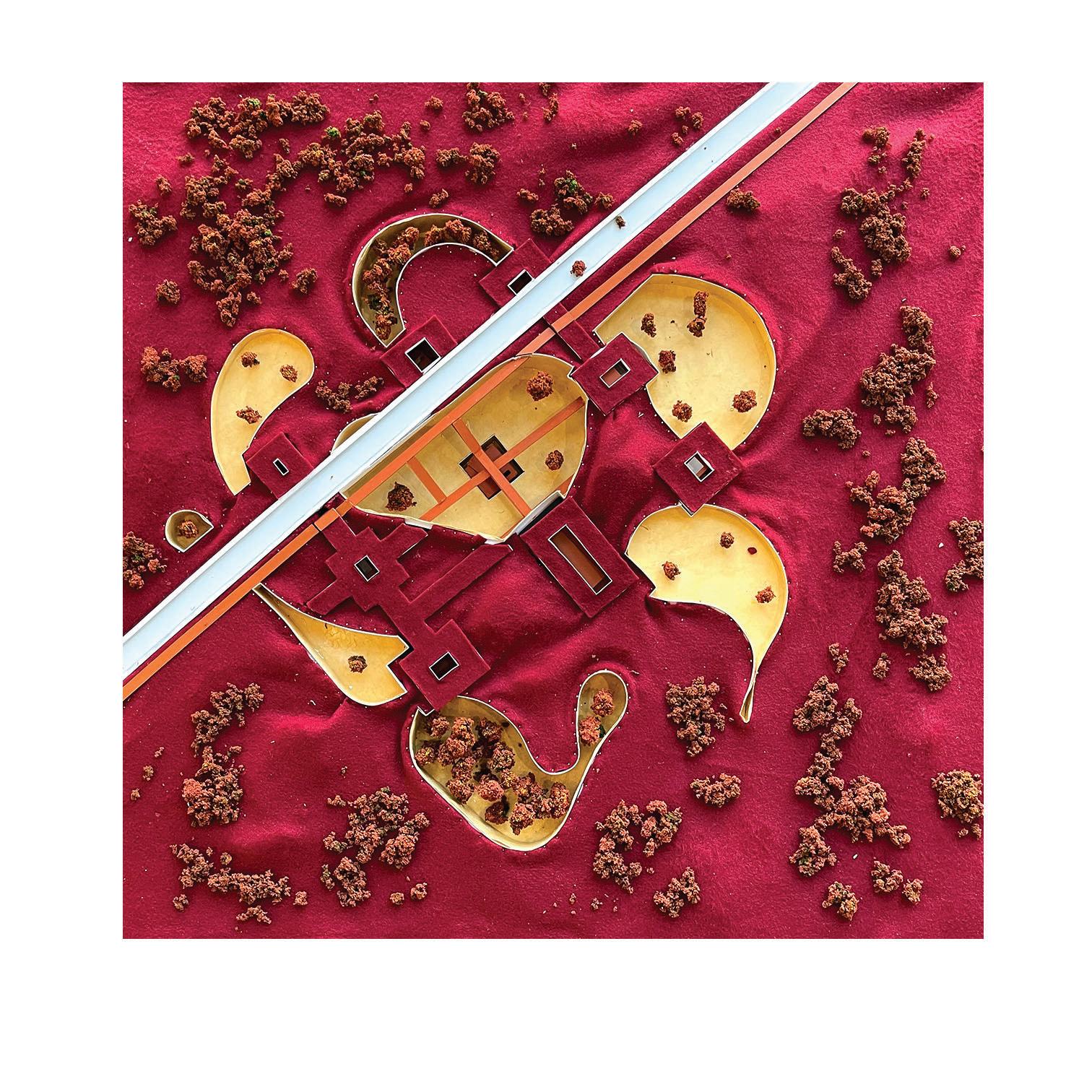 The highest tier is a single large concrete room whose form is sacred. On the opposite end, at the bottom of the hierarchy is an orange space covered in felt that acts like a liquid, filling in gaps between rooms and creating curved geometries. This space questions the traditional definition of a room by expanding and contracting in a playful way to create ambiguous spaces. In the middle tier of this hierarchy are rooms like offices and art studios which take the form of a traditional room, but which react to the orange space at localized points by picking up curves.
