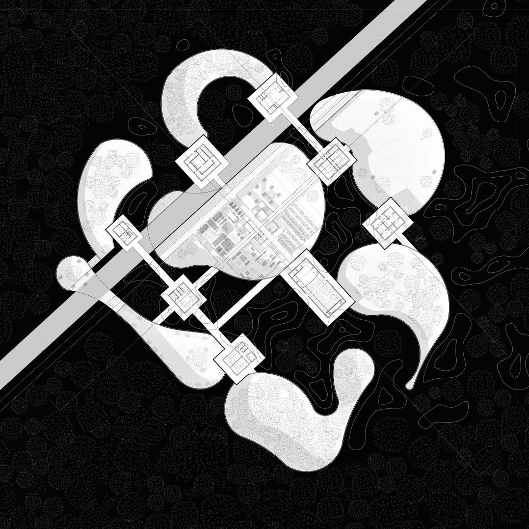 Buildings are divided by program and placed within underground chambers at nine points on the grid where circulation paths intersect.