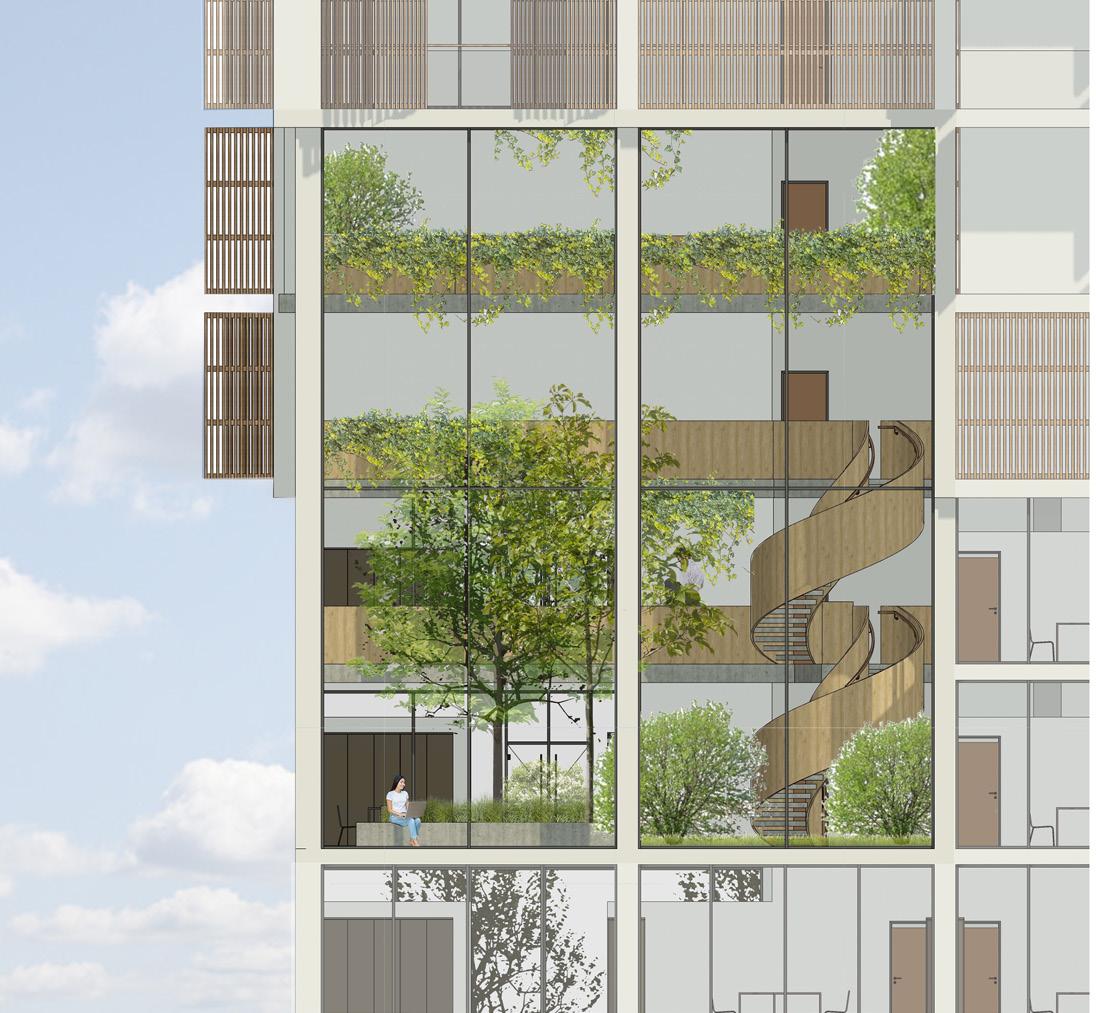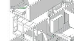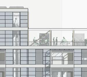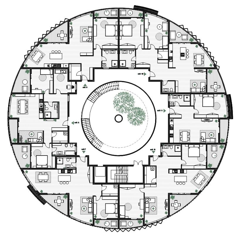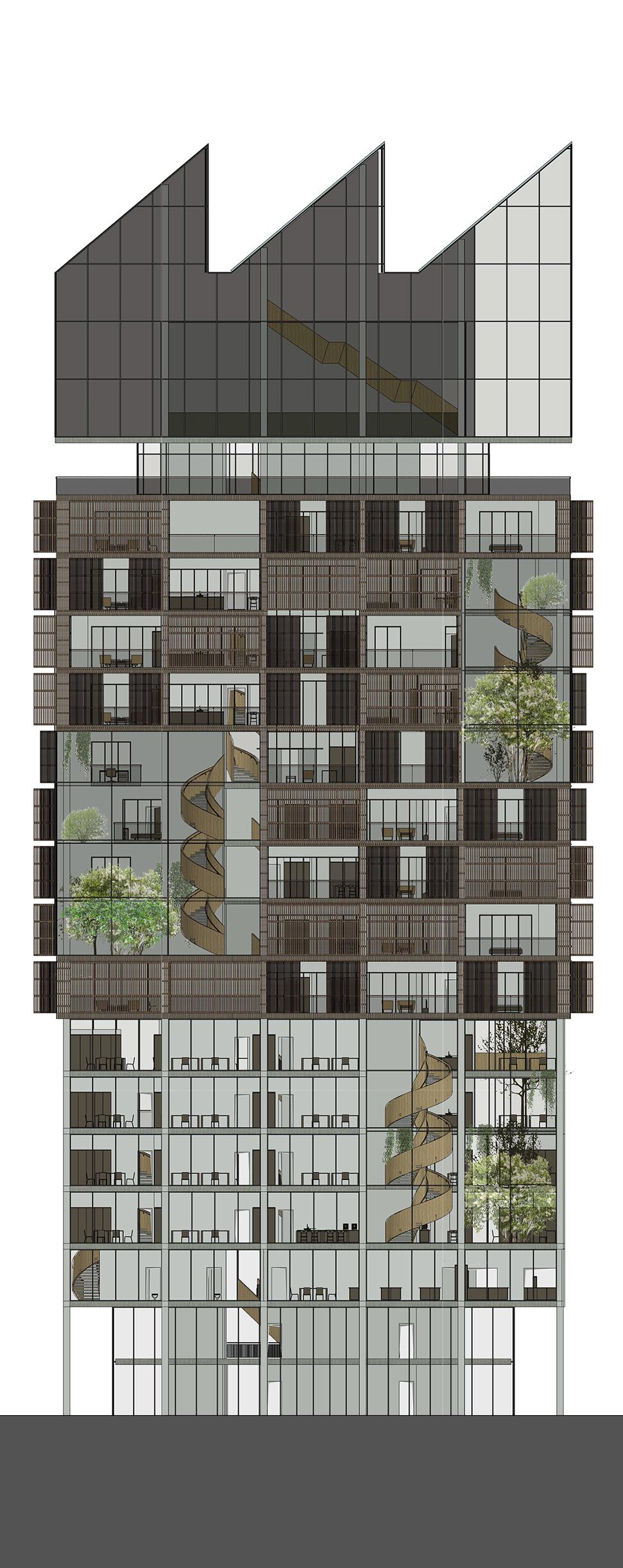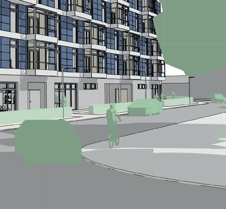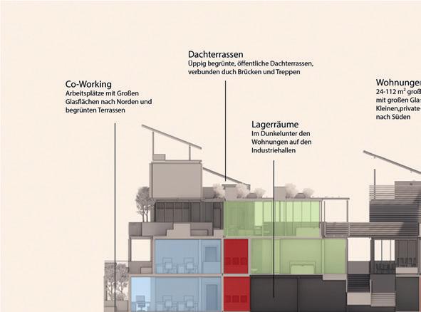 Grüner Hügel_Fünf- bis sechsgeschossiger, terrassierter, begrünter Wohn-“Hügel“. Hier liegt der Fokus auf Fragen der Wohnungserschließung und Schachtführung, der Belichtung (Wohnungstiefe) und dem wohnungsnahen Grün in Form von Dachgärten. Die gewerbliche Nutzung sollte zum Schnitt des Gebäudes passen, der unter den Wohnungen einen ebenfalls umgekehrt terrassierten, sehr tiefen Raum aufweist