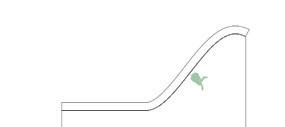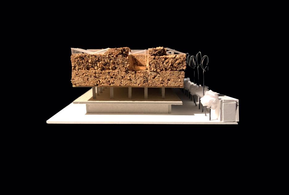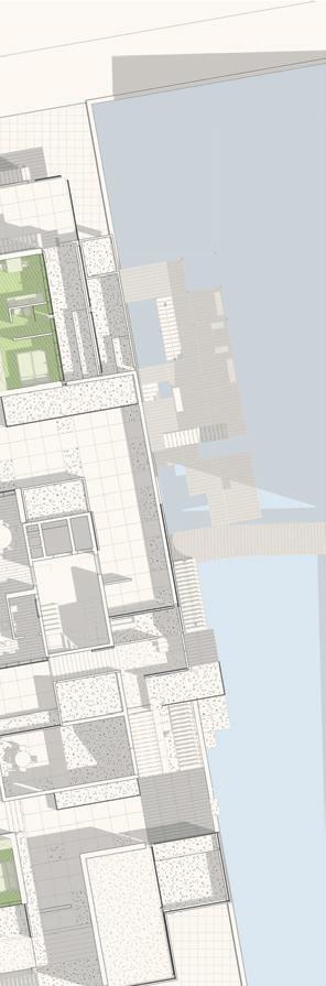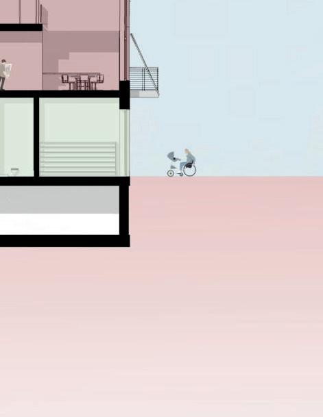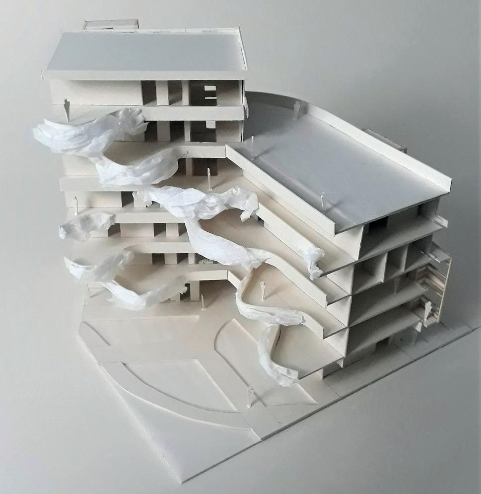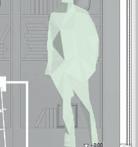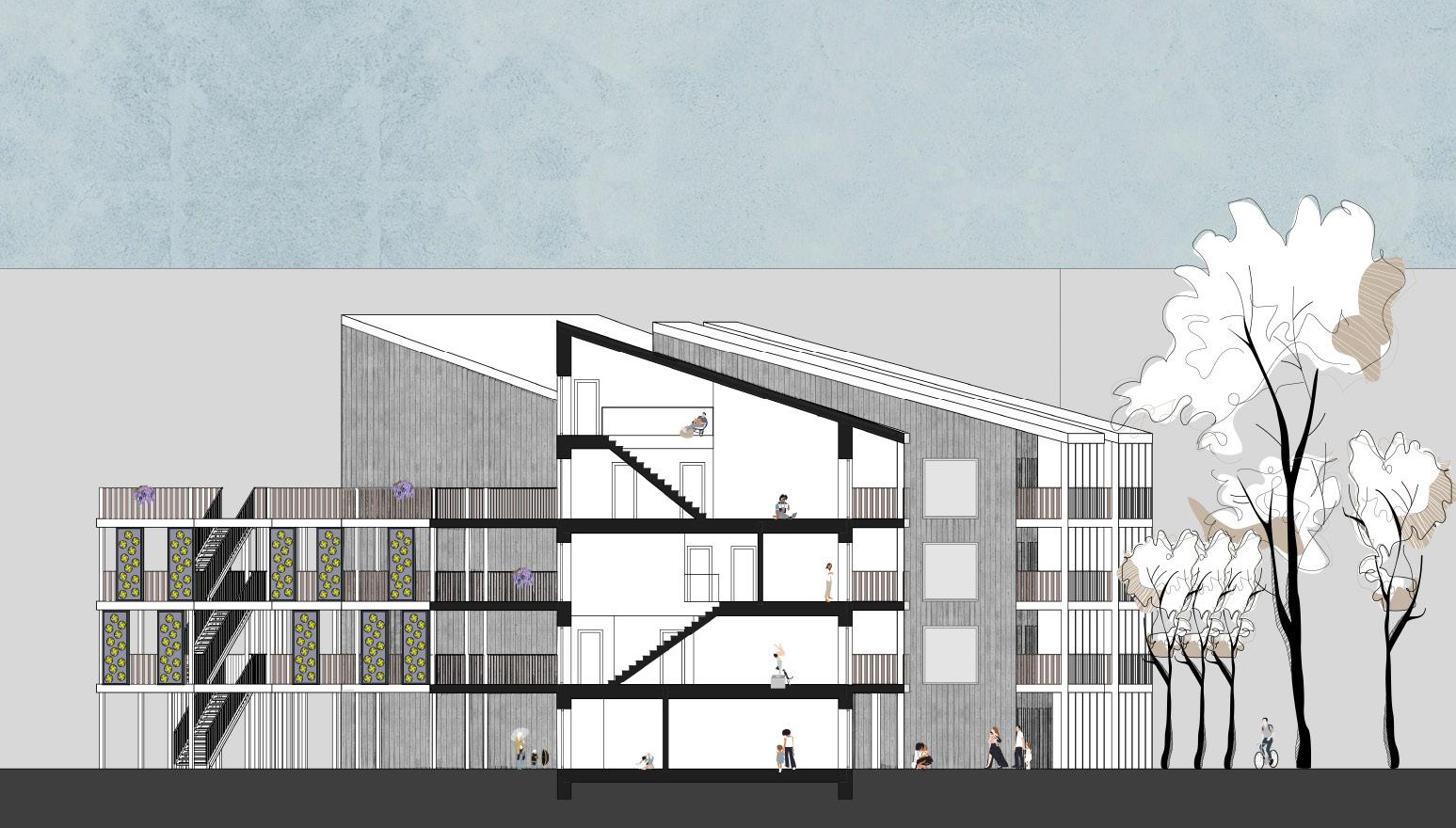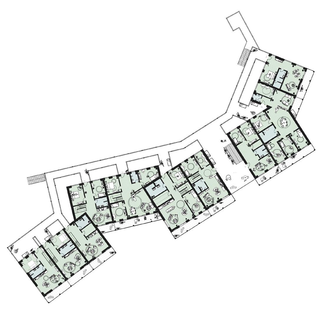 Grüner Hügel_Fünf- bis sechsgeschossiger, terrassierter, begrünter Wohn-“Hügel“. Hier liegt der Fokus auf Fragen der Wohnungserschließung und Schachtführung, der Belichtung (Wohnungstiefe) und dem wohnungsnahen Grün in Form von Dachgärten. Die gewerbliche Nutzung sollte zum Schnitt des Gebäudes passen, der unter den Wohnungen einen ebenfalls umgekehrt terrassierten, sehr tiefen Raum aufweist