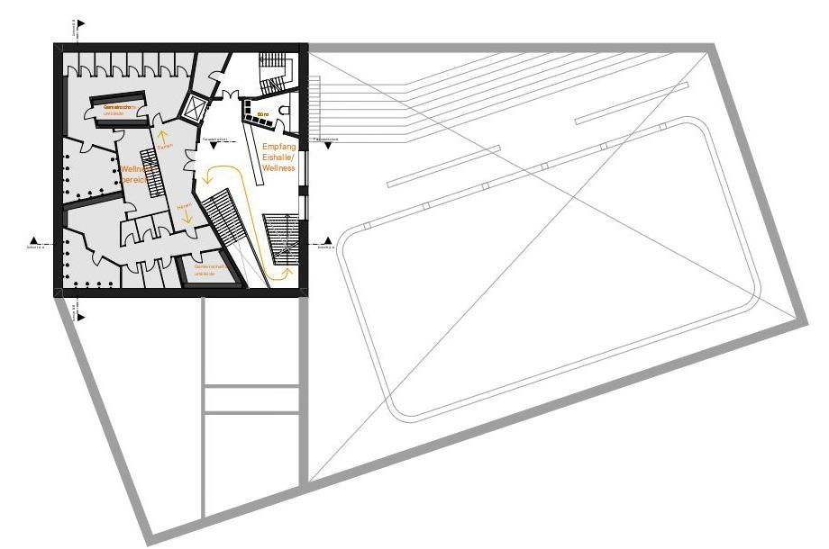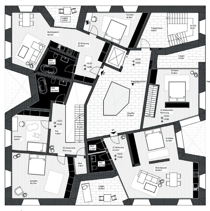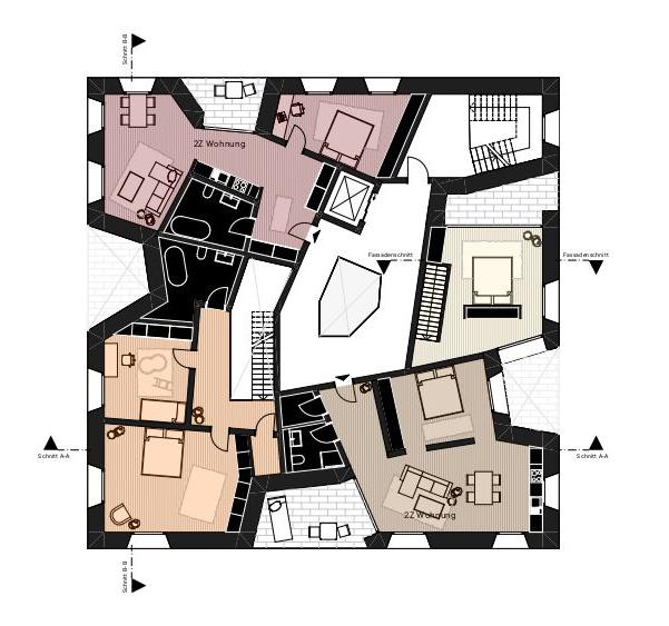 Höhle_Punkthaus, sechsgeschossig, Außenwände mit einer Stärke von 75 cm und mehr, Netto-Abmessungen ca. 21 x 21 m, Grundrissdisposition höhlenartig (Massivität). Gewerbe: Sauna, Spa, Hallenbad