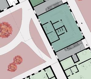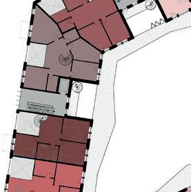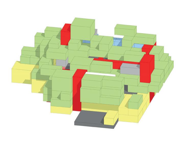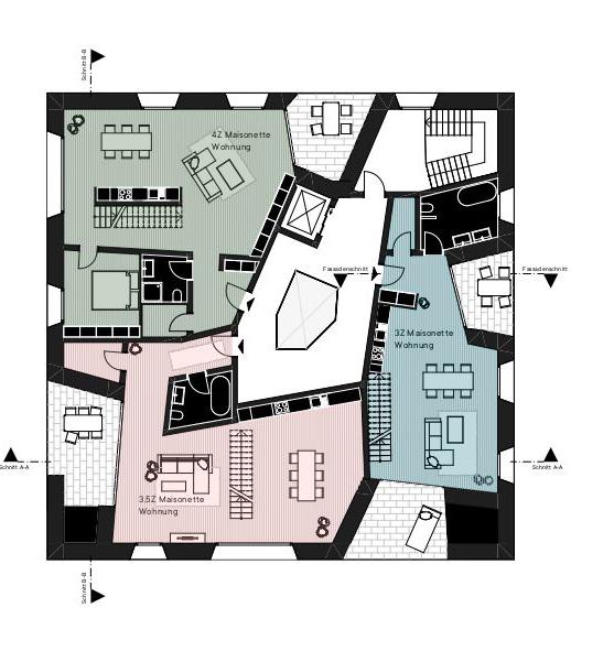 Druse_Klassischer Wohnblock, viergeschossig, allerdings mit maximaler Fassadenabwicklung im Hof analog zur mineralischen Druse. Der vielfach kristallin gebrochene Hohlraum der Druse (mineralogischer Fachterminus) ist hier die Analogie für den Hof. Gewerbe, z.B. Arztpraxen, Läden, Büros im EG zu den Straßen.