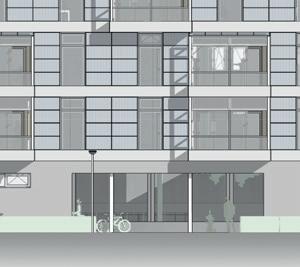 Schlanker Riegel_Zum Beispiel als Grenze nach Norden und/oder Osten, Nutzungstiefe max. ca. 8,50 m. Geschosse können terrassenartig gestaffelt sein, auf Terrassen/Loggien kann zugunsten einer weitgehenden Öffenbarkeit der Fassade verzichtet werden, Gewerberäume im UG/EG können tiefer ausfallen