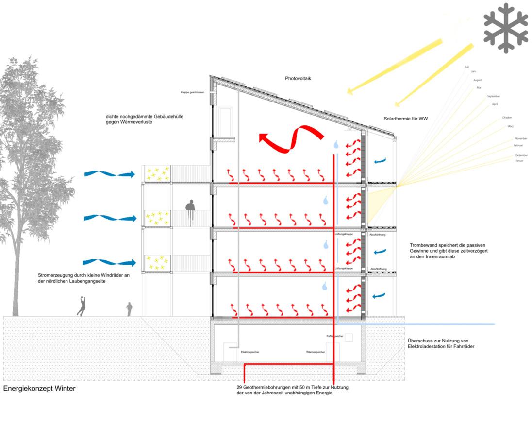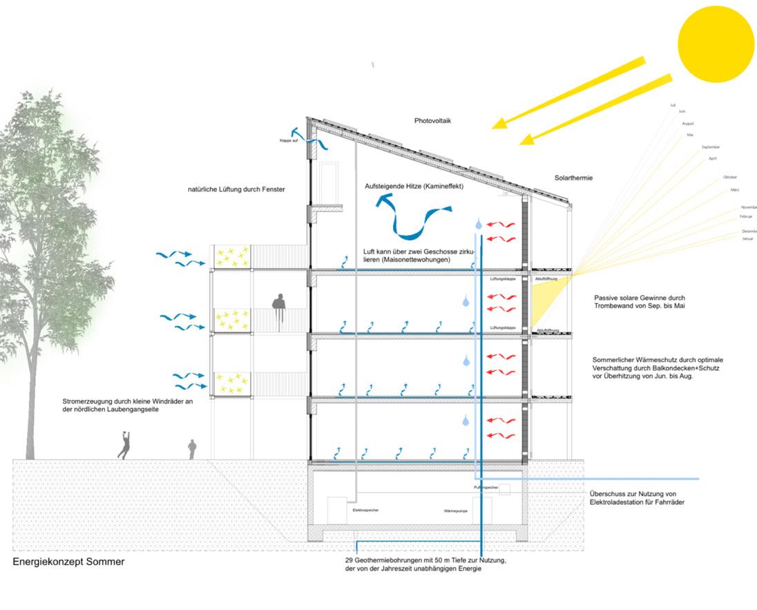 Die Straßenfassaden im Osten und Süden sind mit ihren PhotovoltaikPaneelen und Wintergärten neben der Solarthermie auf dem Dach und den Geothermie-Bohrungen Teil des Energiekonzepts. Die Effektivität der vertikalen Photovoltaik-Elemente ist zwar nicht so hoch wie die herkömmlicher Elemente, allerdings macht hier die Masse den Unterschied. So kommt das Gebäude sowohl beim Strombedarf als auch beim Heizenergiebedarf in den Plusbereich. Es produziert also mehr Energie, als es selbst verbraucht. Die überschüssige Energie kann entweder gespeichert, oder dem Quartier zur Verfügung gestellt werden.Die Begrünung der Fassade auf der quartierszugewandten Seite sorgt für Verdunstungskälte und produziert Sauerstoff, der durch Querlüftung direkt in den Wohnungen ankommt.