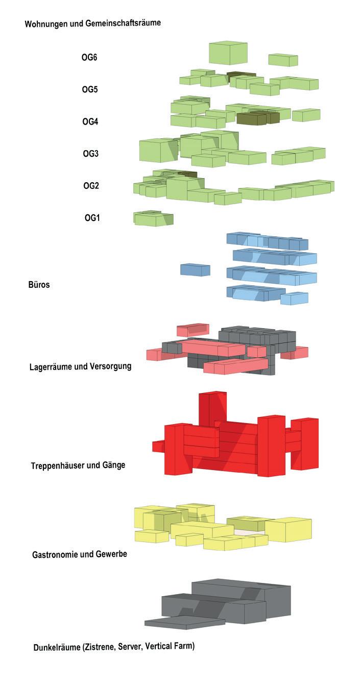 Gerüst_sechsgeschossig, Fill-Ins im Selbstbau mit viel Offenheit in der Vertikalen, Netto-Abmessungen ca. 21 x 21 m, Gewerbe eingeflochten auf allen Etagen