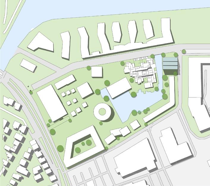 Quartiersentwurf_Ein derzeit als reines Gewerbegebiet genutztes Gelände südlich des Oldenburger Hafens soll zu einem neuen Quartier für Wohnen und Arbeiten werden. Das Areal wird zu einem so genannten Urbanen Gebiet gem. § 6a BauNVO (Baunutzungsverordnung) umgewidmet. Diese neue, 2017 zum Zweck der innerstädtischen Verdichtung und leichteren Nutzungsmischung eingeführte Gebietskategorie dient „dem Wohnen sowie der Unterbringung von Gewerbebetrieben und sozialen, kulturellen und anderen Einrichtungen, die die Wohnnutzung nicht wesentlich stören“. Die vorhandene Bebauung auf dem Gelände kann als abgängig angesehen werden, kann aber unter dem Aspekt der Ressourcenschonung z.T. auch erhalten und ggf. umgenutzt werden.