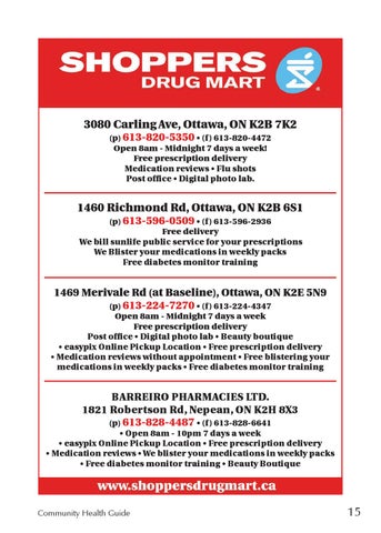 3080 Carling Ave, Ottawa, ON K2B 7K2 (p) 613-820-5350 • (f) 613-820-4472 Open 8am - Midnight 7 days a week! Free prescription delivery Medication reviews • Flu shots Post office • Digital photo lab.
