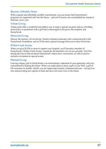 Become a Monthly Donor With a regular and affordable monthly commitment, you can ensure that Sunnybrook’s programs are supported well into the future – and you’ll receive one consolidated tax receipt in February every year.
