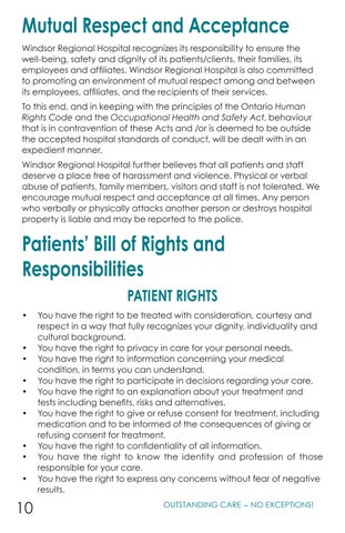 Mutual Respect and Acceptance Windsor Regional Hospital recognizes its responsibility to ensure the well-being, safety and dignity of its patients/clients, their families, its employees and affiliates. Windsor Regional Hospital is also committed to promoting an environment of mutual respect among and between its employees, affiliates, and the recipients of their services. To this end, and in keeping with the principles of the Ontario Human Rights Code and the Occupational Health and Safety Act, behaviour that is in contravention of these Acts and /or is deemed to be outside the accepted hospital standards of conduct, will be dealt with in an expedient manner. Windsor Regional Hospital further believes that all patients and staff deserve a place free of harassment and violence. Physical or verbal abuse of patients, family members, visitors and staff is not tolerated. We encourage mutual respect and acceptance at all times. Any person who verbally or physically attacks another person or destroys hospital property is liable and may be reported to the police.