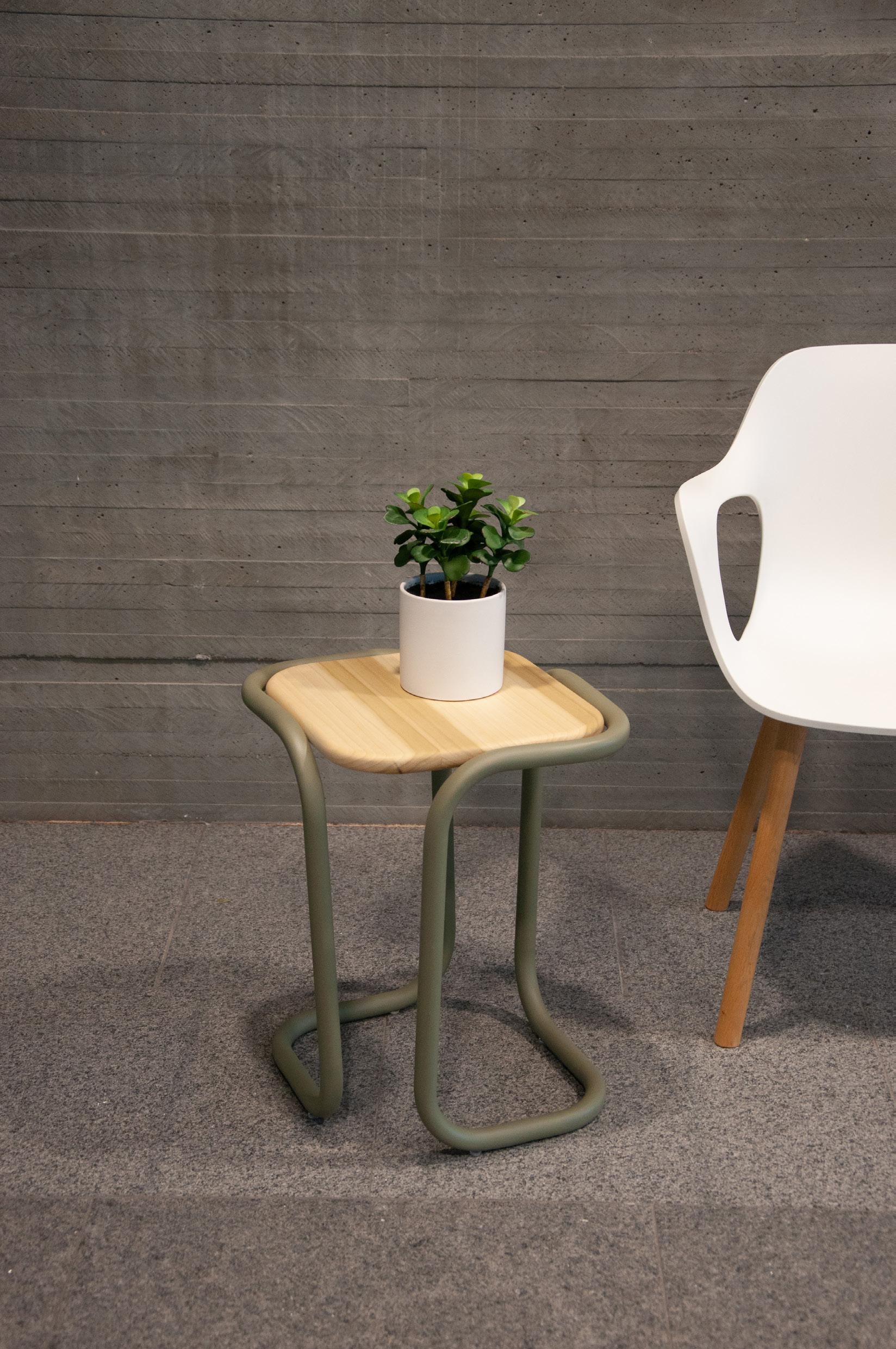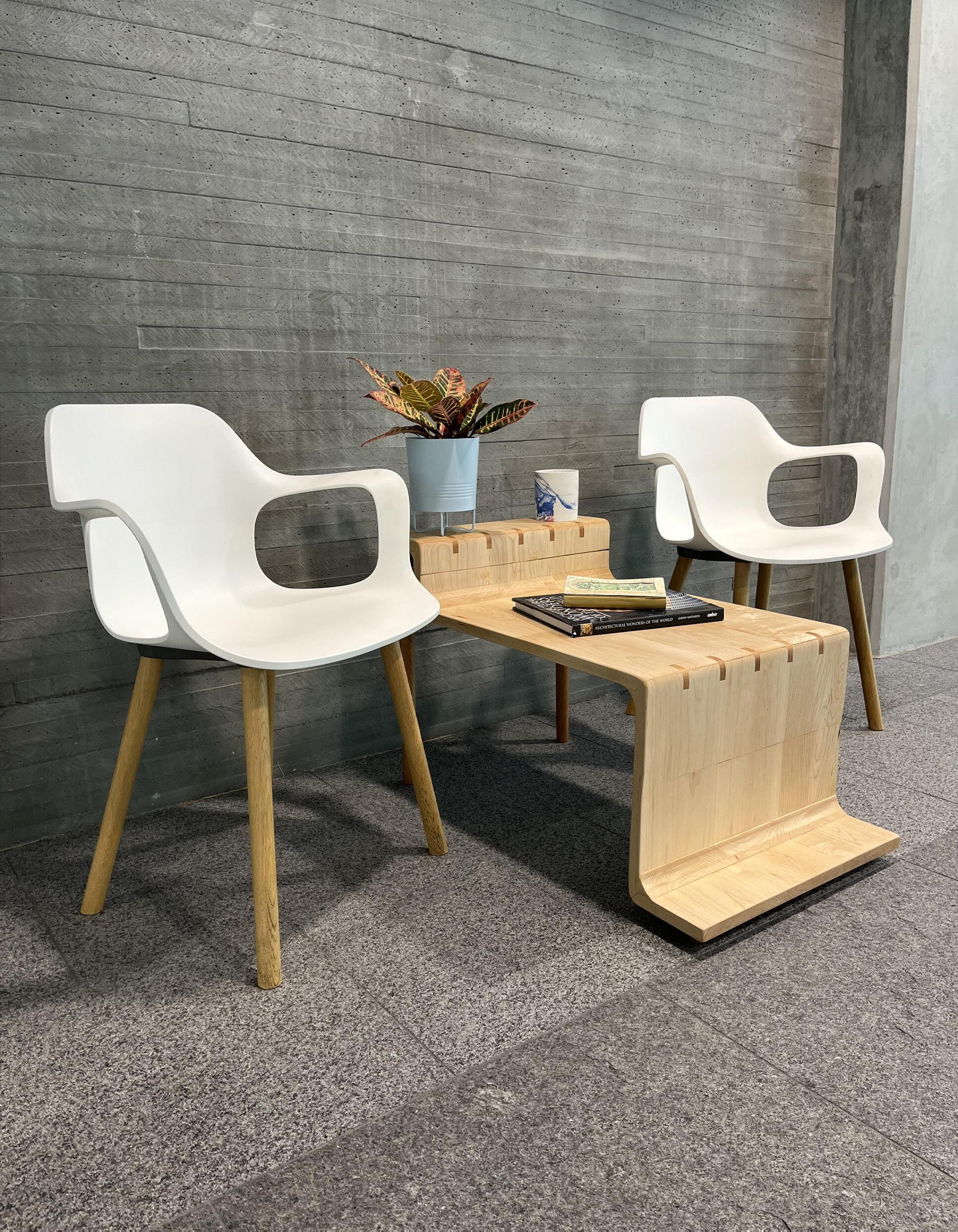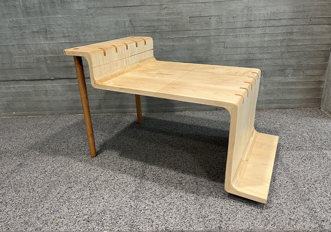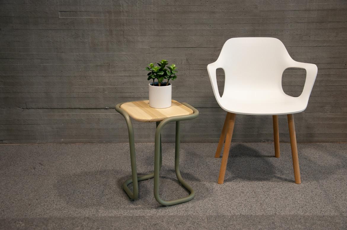 Called Embrace, the concept reflects the idea of the metal legs wrapping around the table top. This relationship creates a form in which the legs seems to reach upwards and lift the wood in a soft handhold like embrace. Metal tube was bent in three axis and welded together to create continuous wrapping legs. The legs wrap two corners, leaving the other two exposed allowing for both wood movement and handholds.