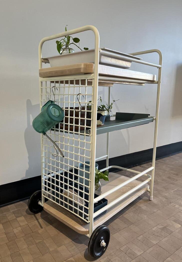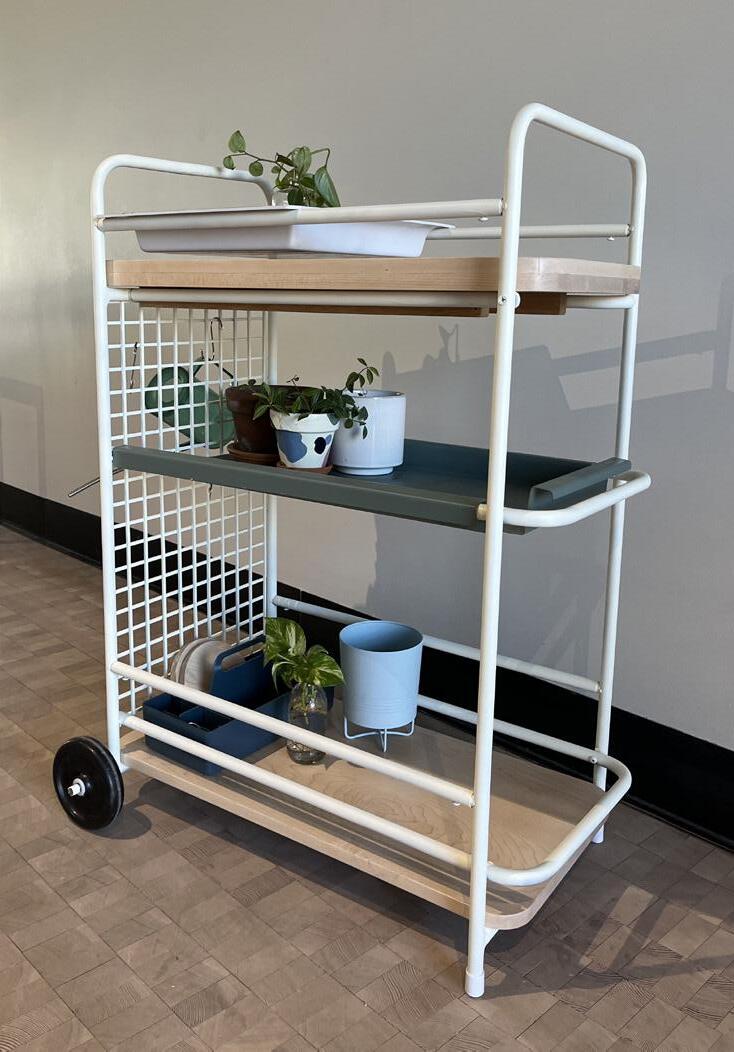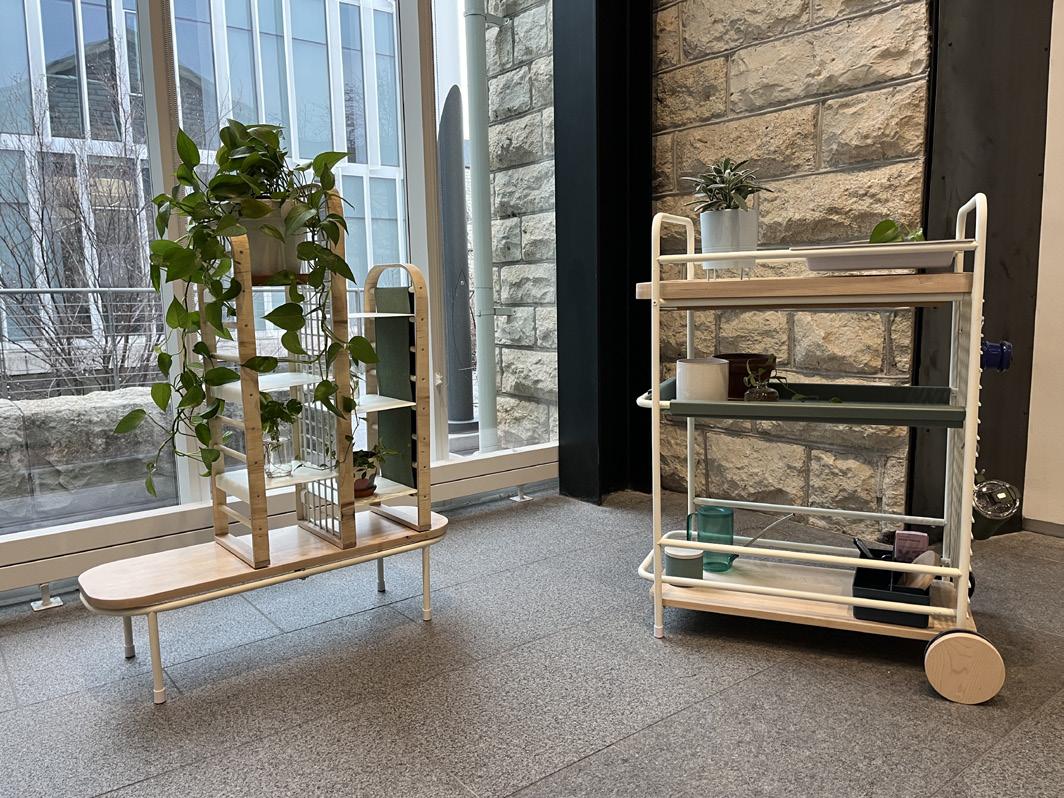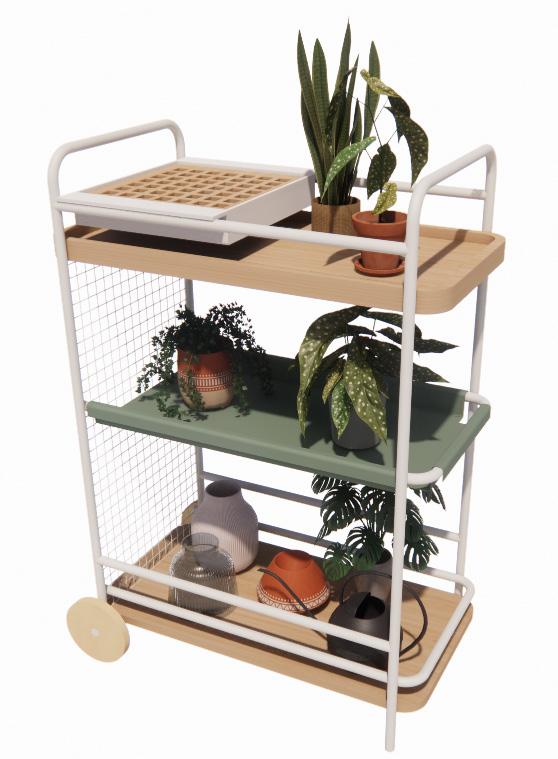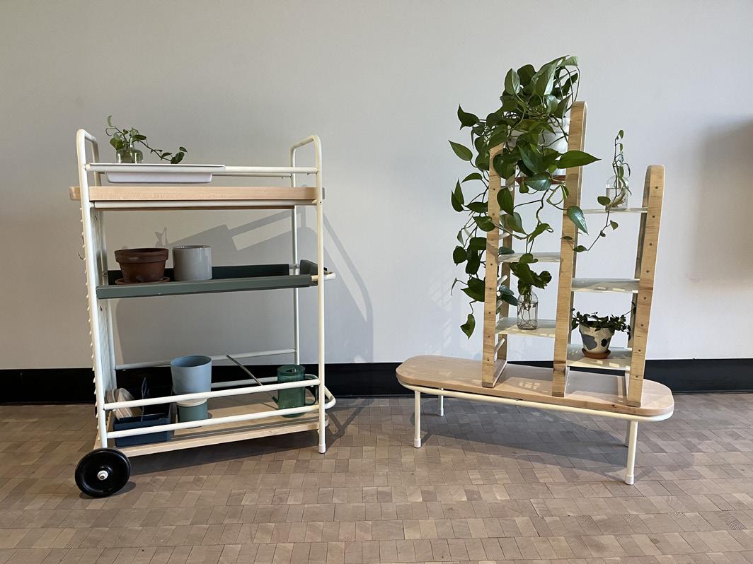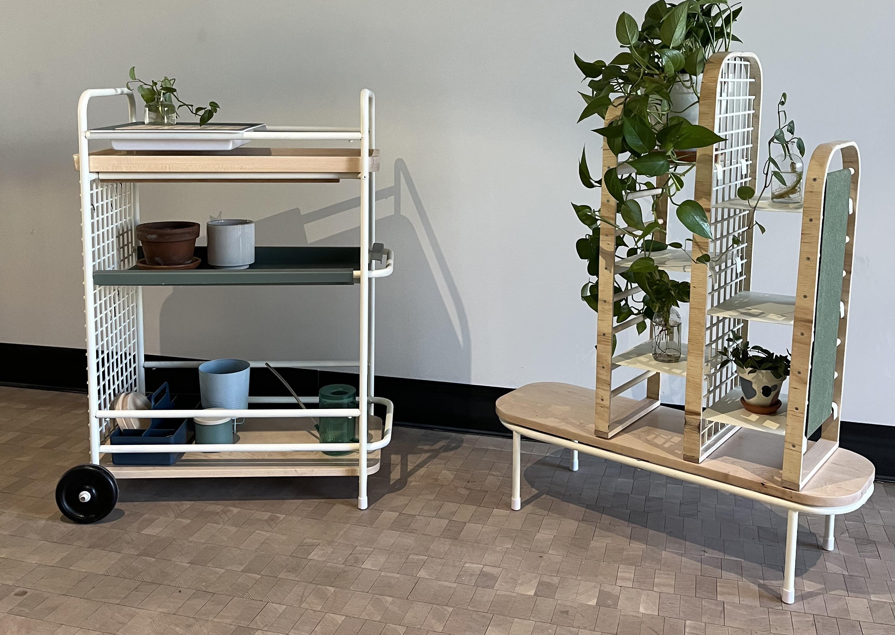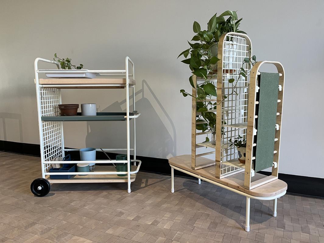 The plant care cart acts as a portable workstation for watering, potting plants, and storage. It includes a thermoformed plastic watering tray, sliding work surface, and grid storage component. The plant stand celebrates plant display with its multilevel shelving system featuring adjustable shelves that adapt to plant size. Both pieces were designed to be dissembled and flat packed for easy transportation and storage.