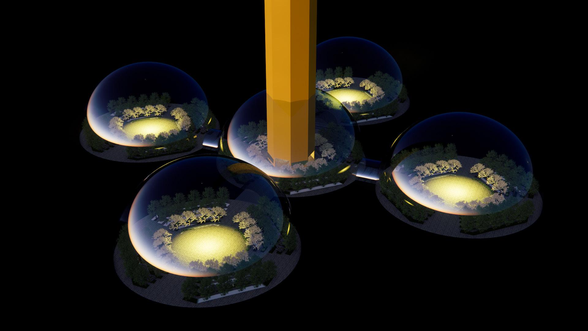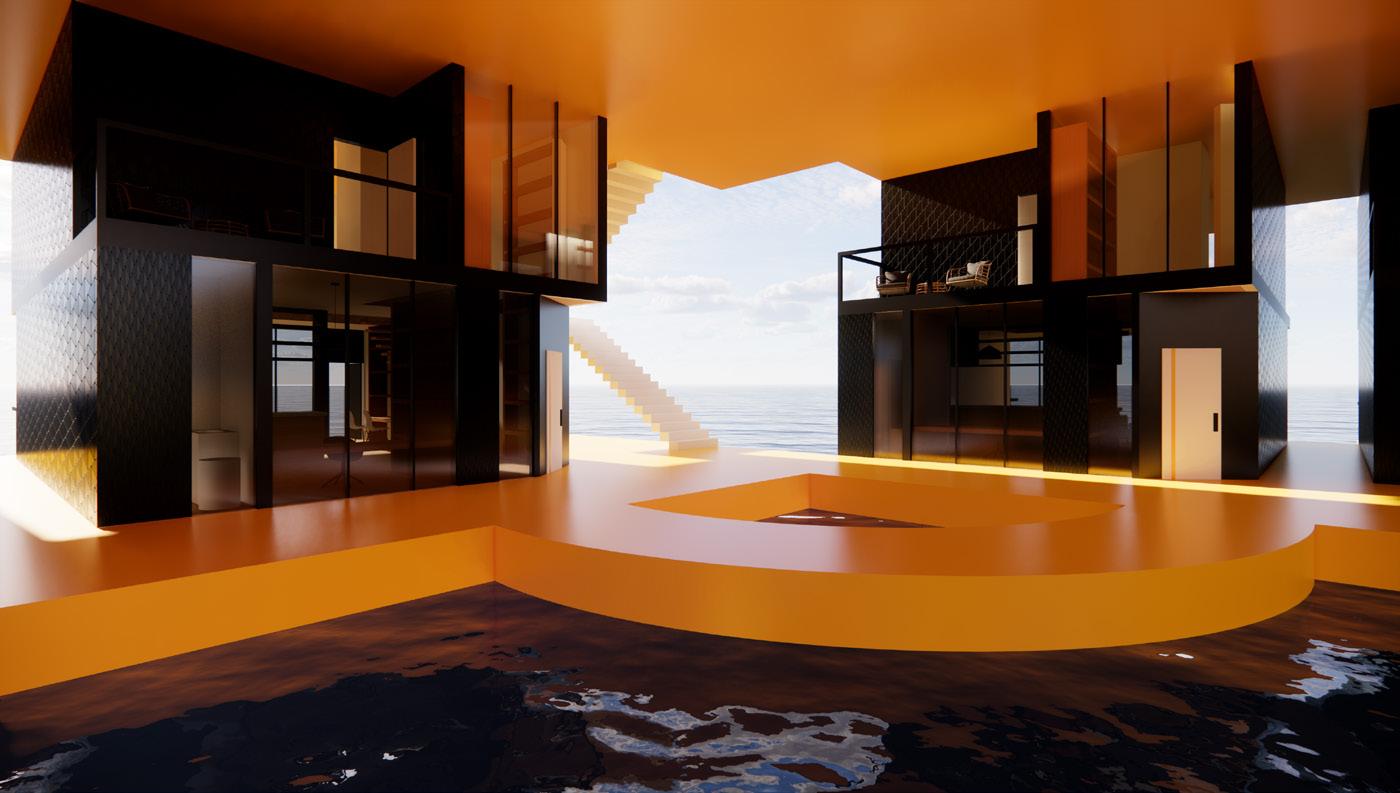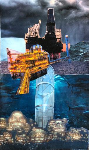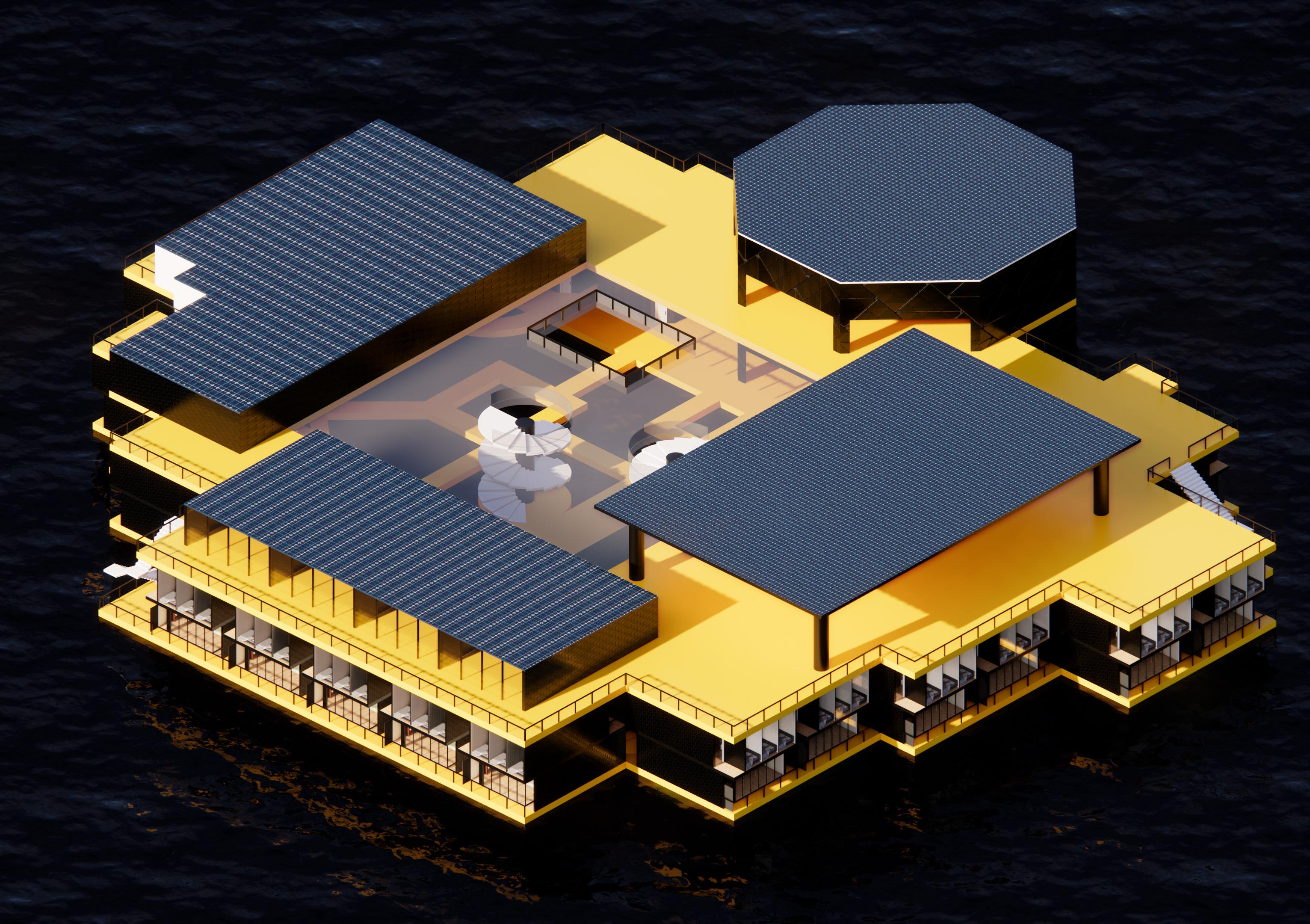 This design, called harmonious tether, utilized an off shore oil rig as housing for a community surviving an apocalypse in which the world floods. The design sought to use the rig as a way to lift humanity up while also connecting them to the earth with a tether.