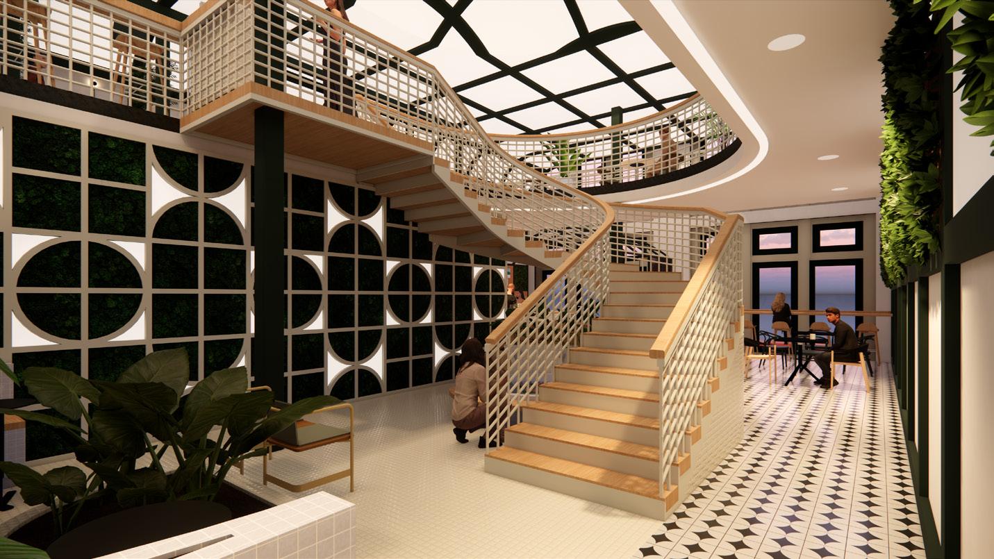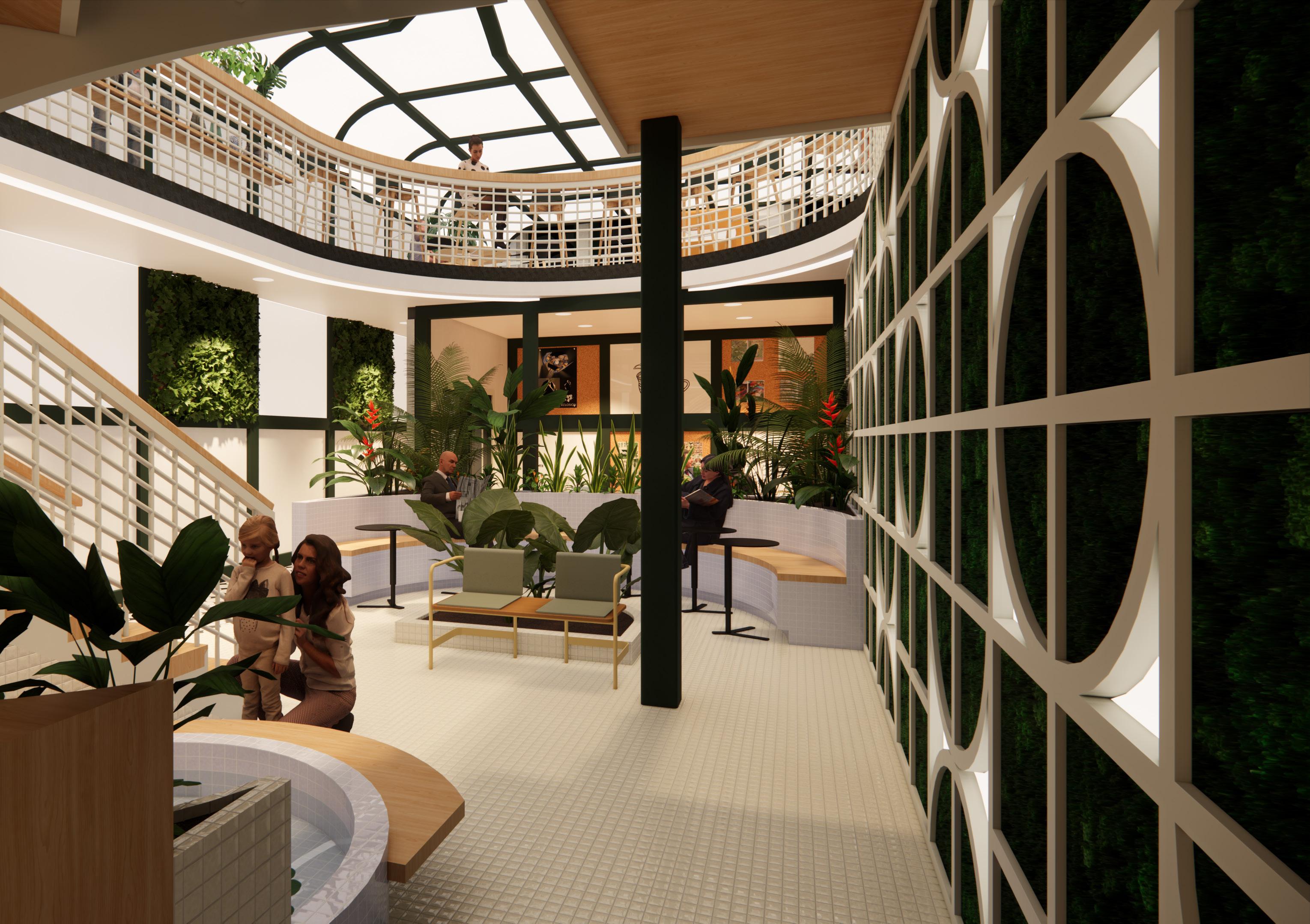 Biophilia brings life into the space in the form of planters, green-walls, a small water feature, and an artificial skylight mimicking natural day light. The design combines the energy and life from plants with the energy of coffee to rejuvenate its users both emotionally and physically.