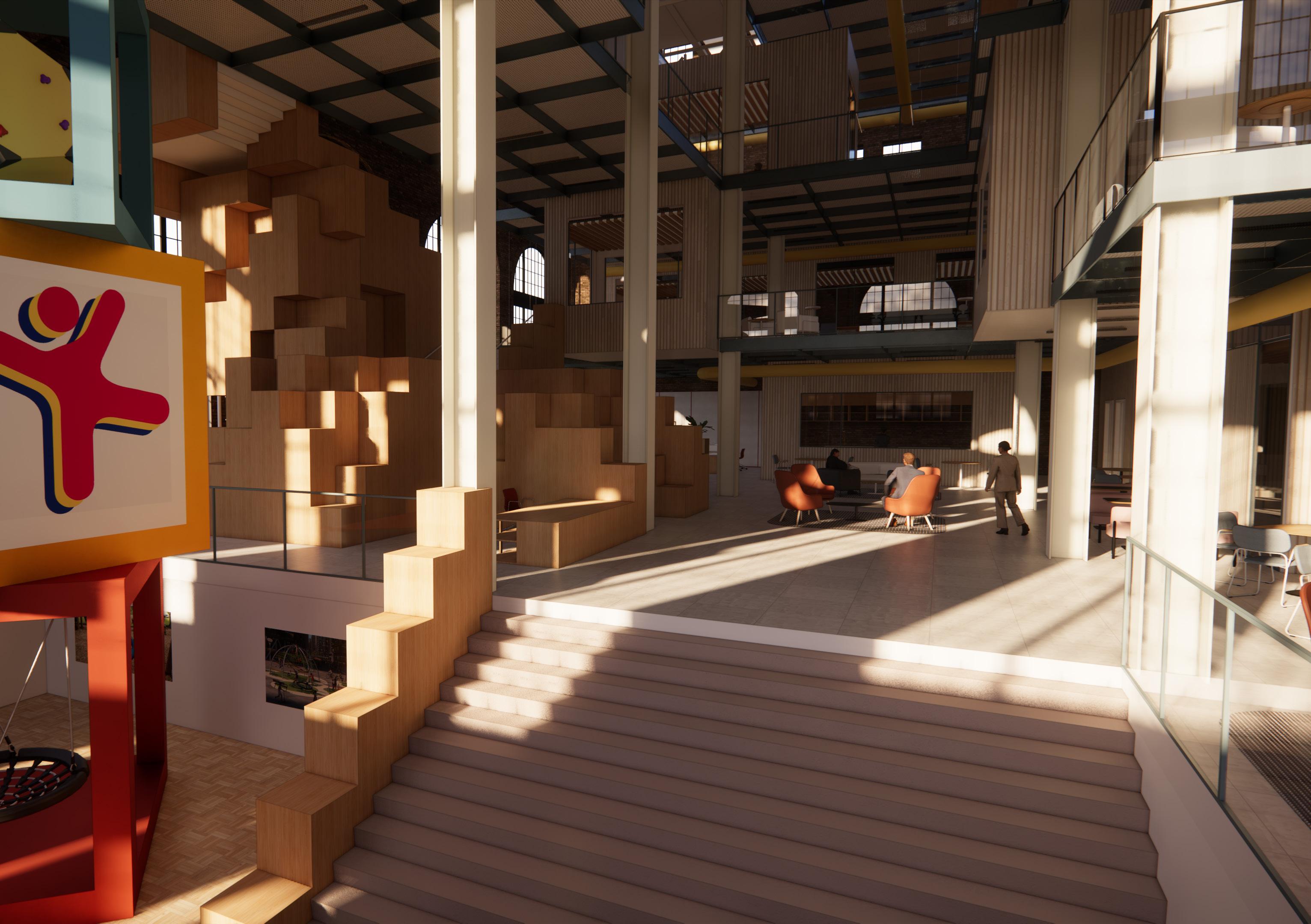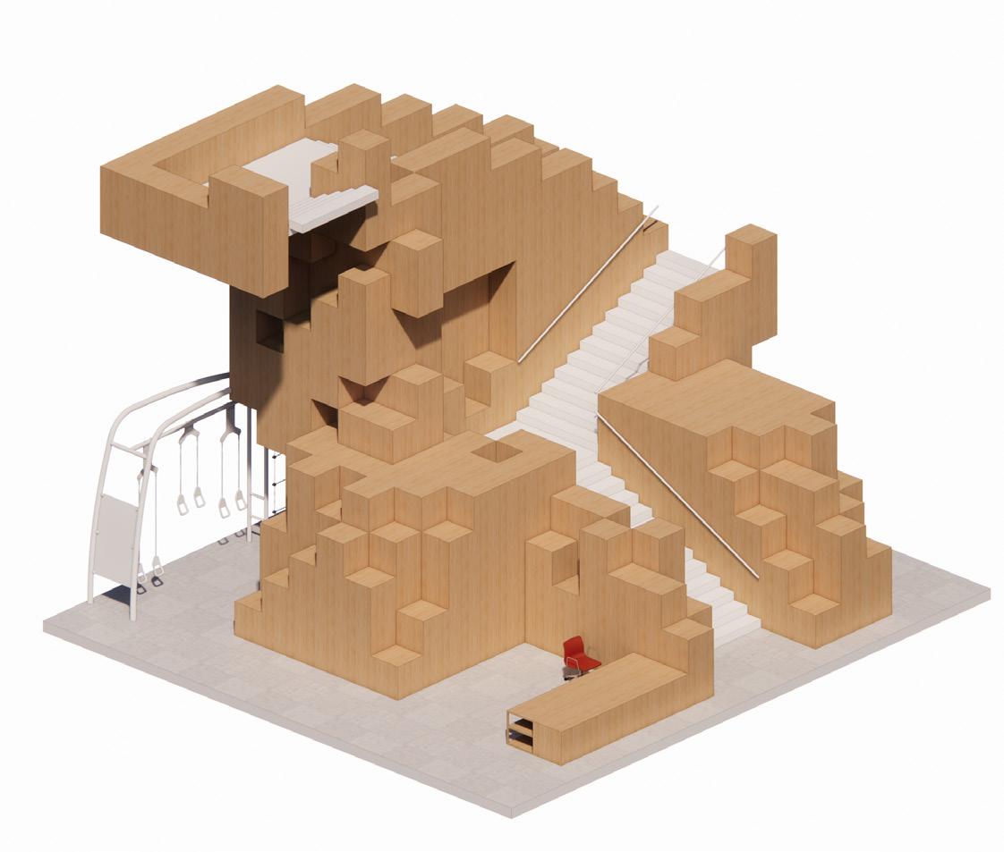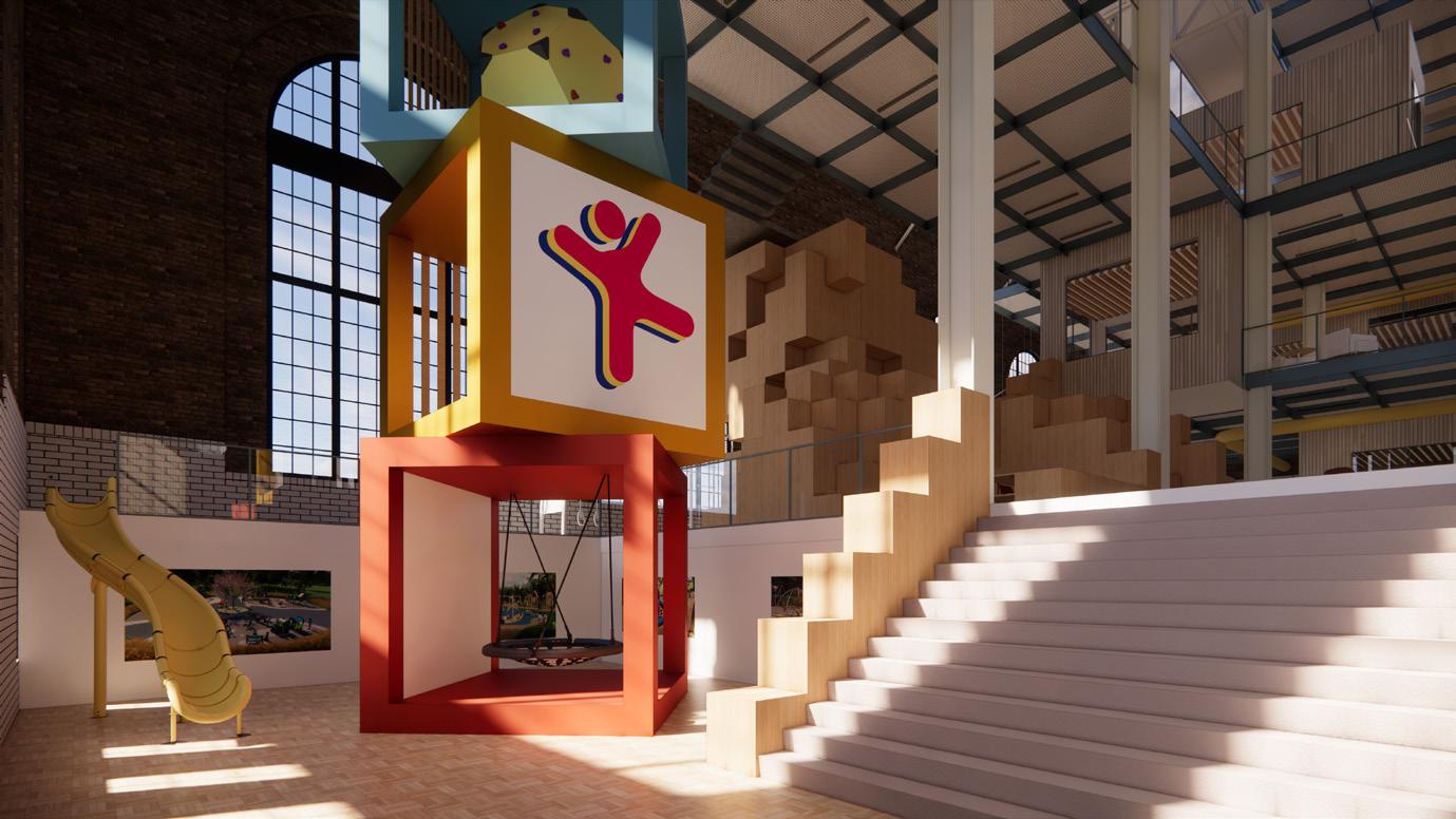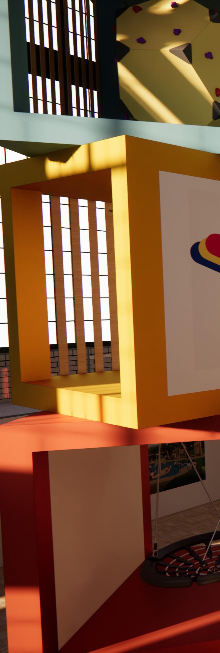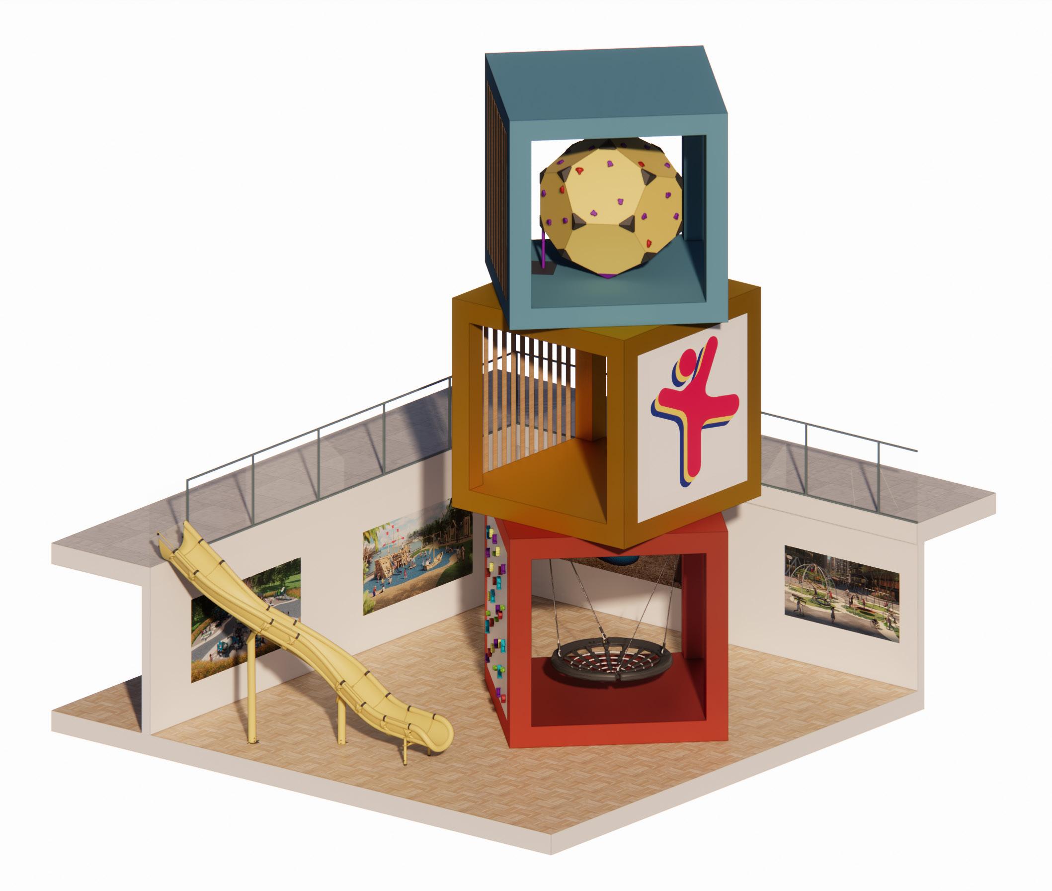 Inspired by the form of Kompan’s Triple Cube play tower, the exhibition space features a circulating display of Kompan’s latest designs. The tower of blocks combines dramatic display with interactive play elements and acts as a hub for Kompan’s designs at the entrance of the building.